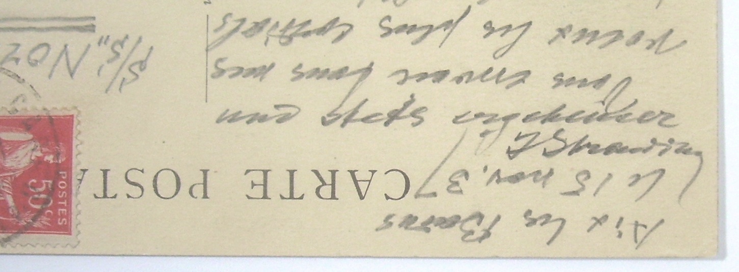 "Eigenhändige Ansichtskarte, ""Aix les Bains le 15 nov. 37"" signiert ""I. Stravinsky"" an seine Freundin und (ehemalige?) Geliebte Dagmar Godowosky (1895-1957) in New York"