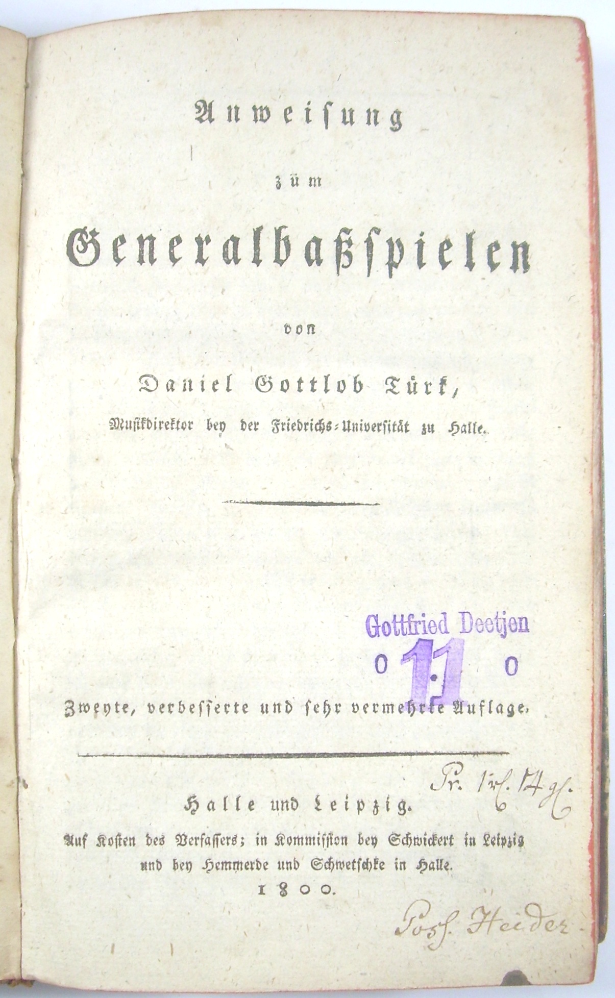 Das Standardwerk zum Generalbassstudium in der Zeit der Klassik, das auch Beethoven 1818/19 für den Unterricht seines prominenten Schülers Erzherzog Rudolph exzerpierte. - Aus dem Vorbesitz des Hamburger Kantors Gottfried Deetjen.