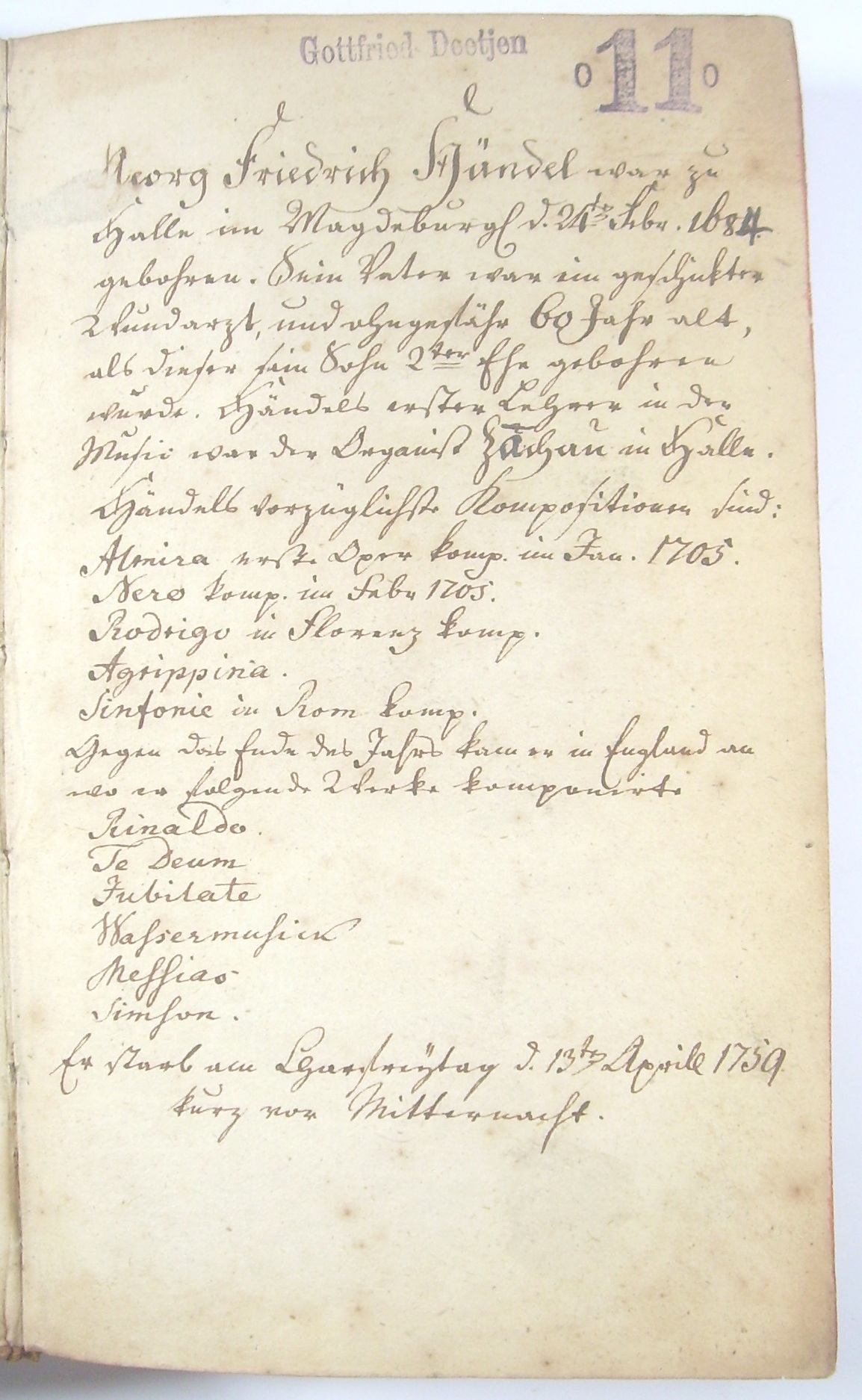 20x13 cm, VI., 390, (2) Seiten, Halbledereinband der Zeit, berieben, Vorderdeckel oben mit kleinem Etikett und an der Kante leicht gestaucht, Gelenke oben etwas eingerissen, dreiseitiger Rotschnitt. Fliegendes Vorsatzblatt mit zeitgenössischen handschriftlichen Anmerkungen zu Georg Friedrich Händel. Titel mit altem privaten Namensstempel ("Gottfried Deetjen") und handschriftlichem Besitzeintrag. Bis auf die kleinen Einbandmängel sehr guter Zustand.
