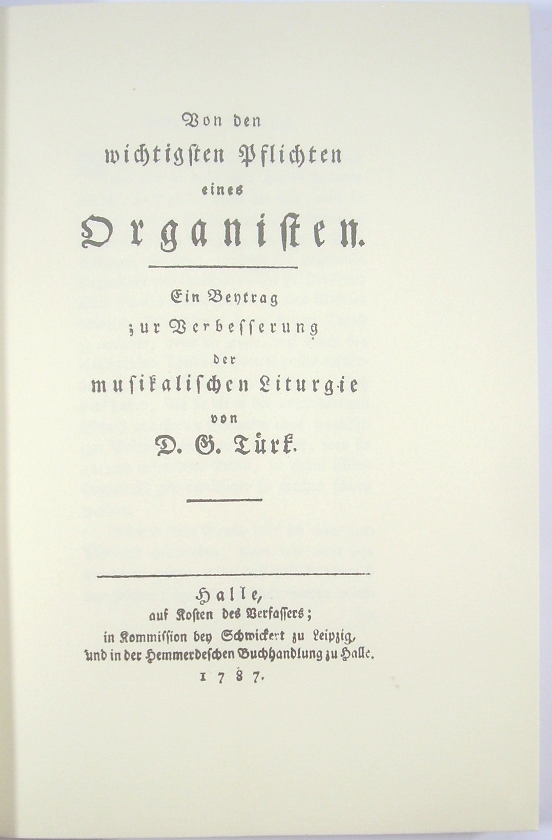 Von den wichtigsten Pflichten eines Organisten. Ein Beytrag zur Verbesserung der musikalischen Liturgie. Faksimile-Nachdruck der Ausgabe Halle 1787. Herausgegeben und mit einem Nachwort von Bernhard Billeter.