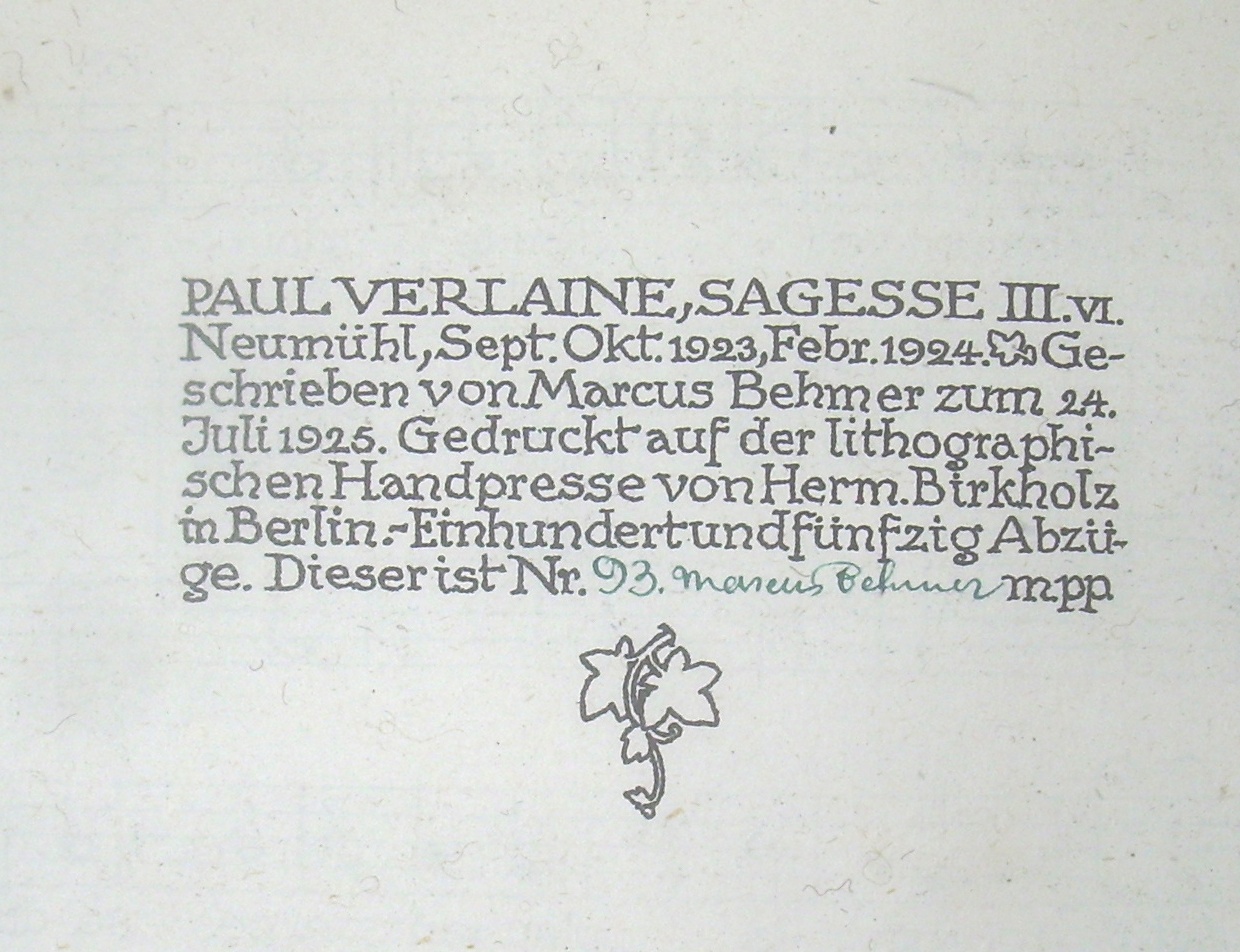 """Paul Verlaine, Sagesse III. Vi. Neumühl, Sept: Okt: 1923, Febr. 1924. Geschrieben von Marcus Behmer zum 24. Juli 1925. Gedruckt auf der lithographischen Handpresse von Herm. Birkholz in Berlin. - Einhundertfünfzig Abzüge. Dieser ist Nr. [handschriftlich] 93. Marcus Behmer mpp."" - Eine der wenigen Kompositionen des Buchkünstlers und Grafikers Marcus Behmer (1879-1968), seit 1903 Mitglied in der weltweit ersten Homosexuellen-Organisation in Berlin. 1936 wurde er von einem Gericht in Konstanz zu einer Gefängnisstrafe von 19 Monaten verurteilt. 1937 wurden in der Nazi-Aktion ""Entartete Kunst"" aus dem Städelschen Kunstinstitut und Städtische Galerie Frankfurt/Main Behmers Tusche-Zeichnung ""Embryo mit Fliege"" beschlagnahmt."