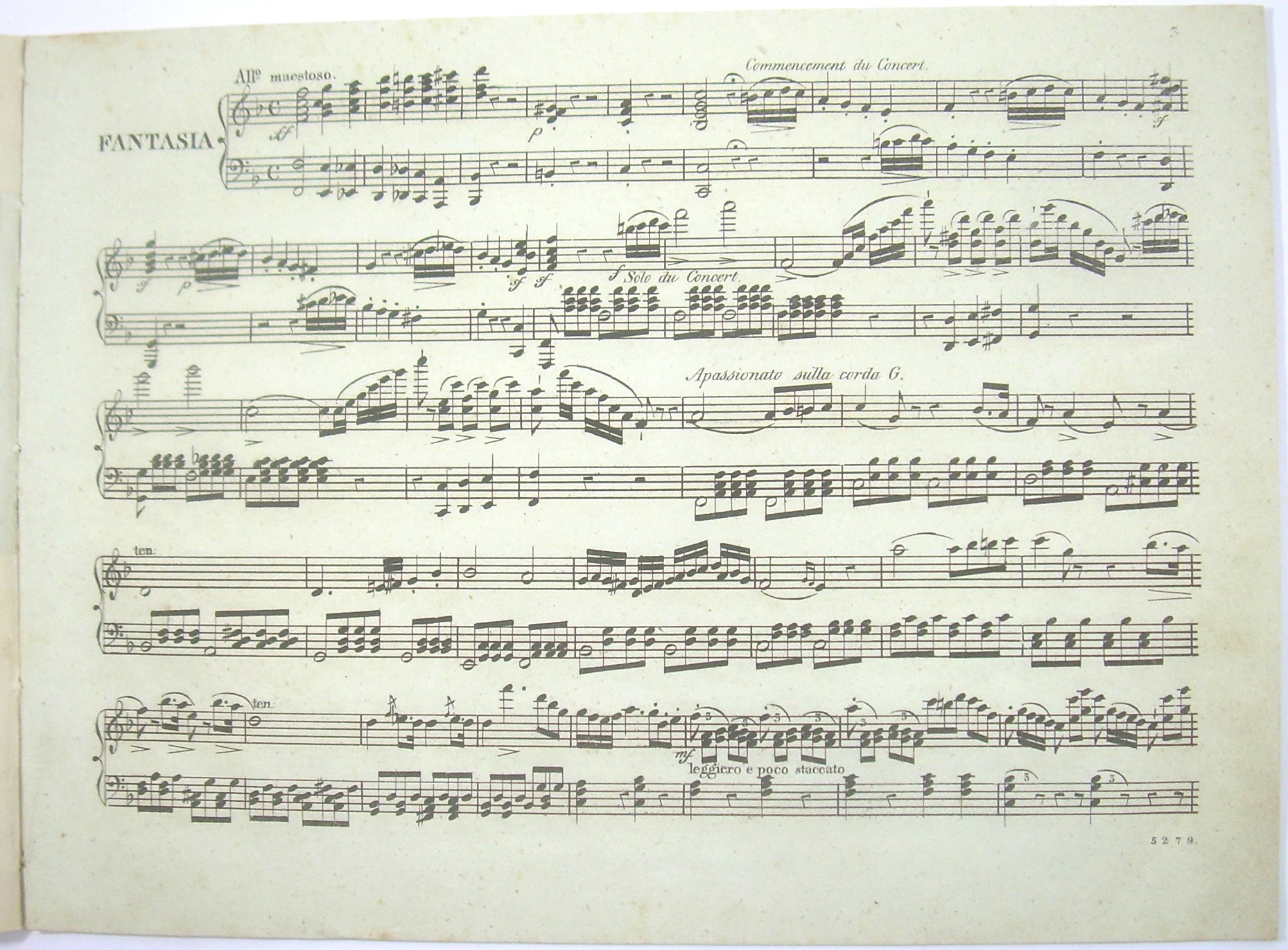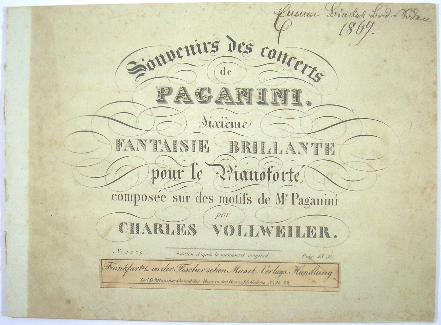 * Constapel S. 293. - Virtuose Komposition des erst 16-jährigen Karl (Charles) Vollweiler (1813-1848), Pianist und Komponist aus Offenbach, der hier die folgenden Werke/Motive von Paganini verarbeitet: "Apassionato [sic!] sulla corda G", "Colla campanella (Glöckchen Rondo" "Rondo du Concert".