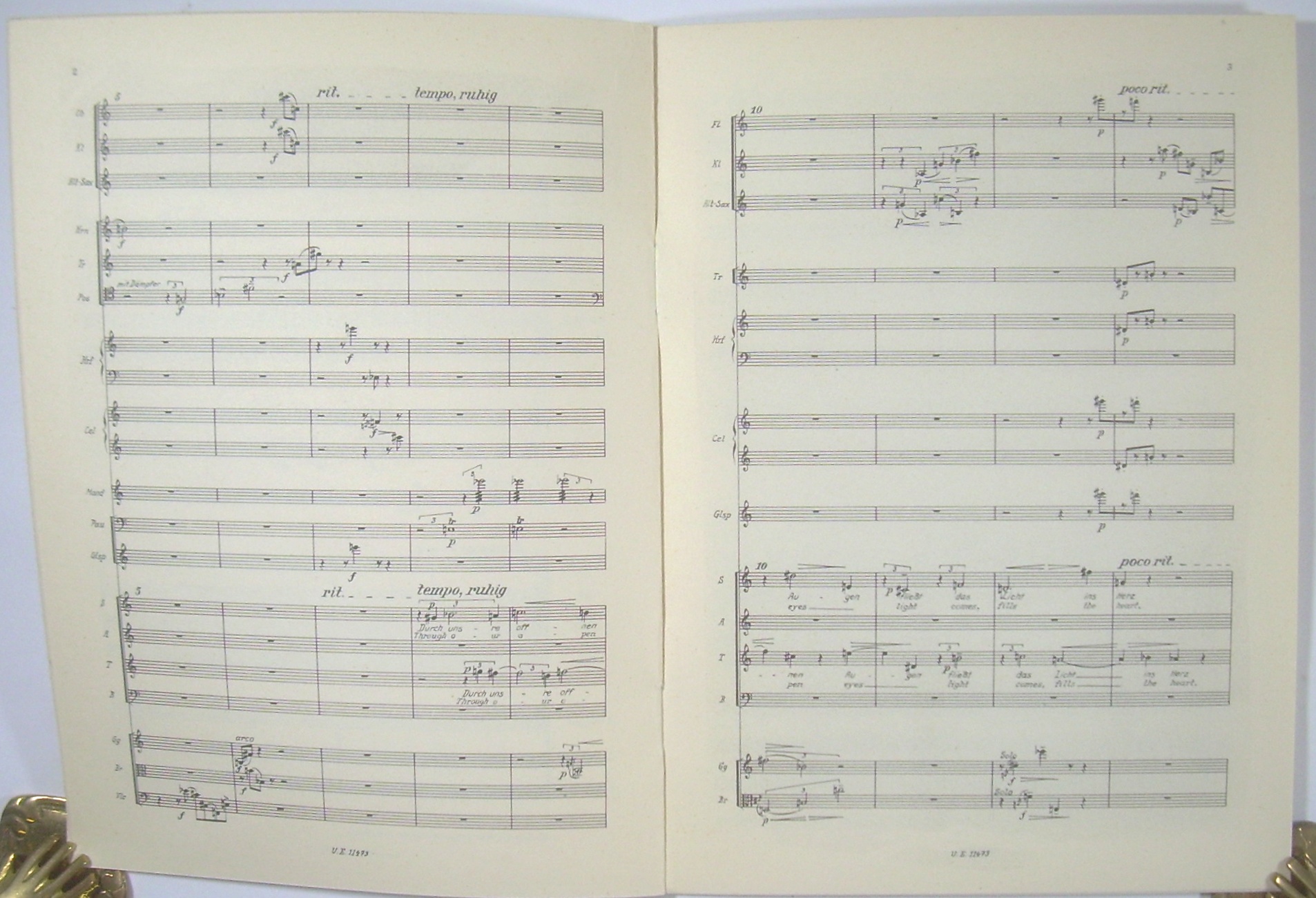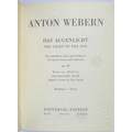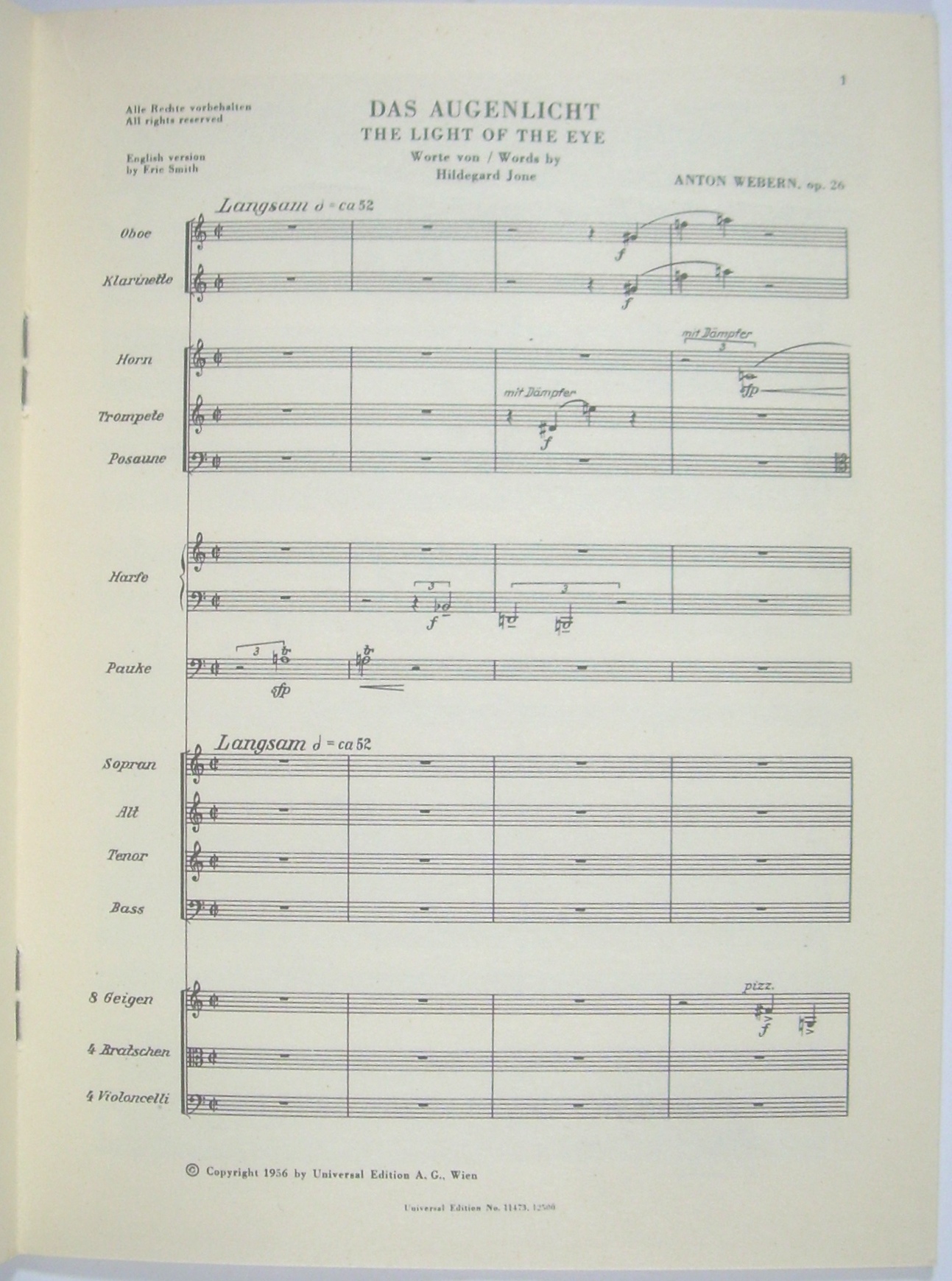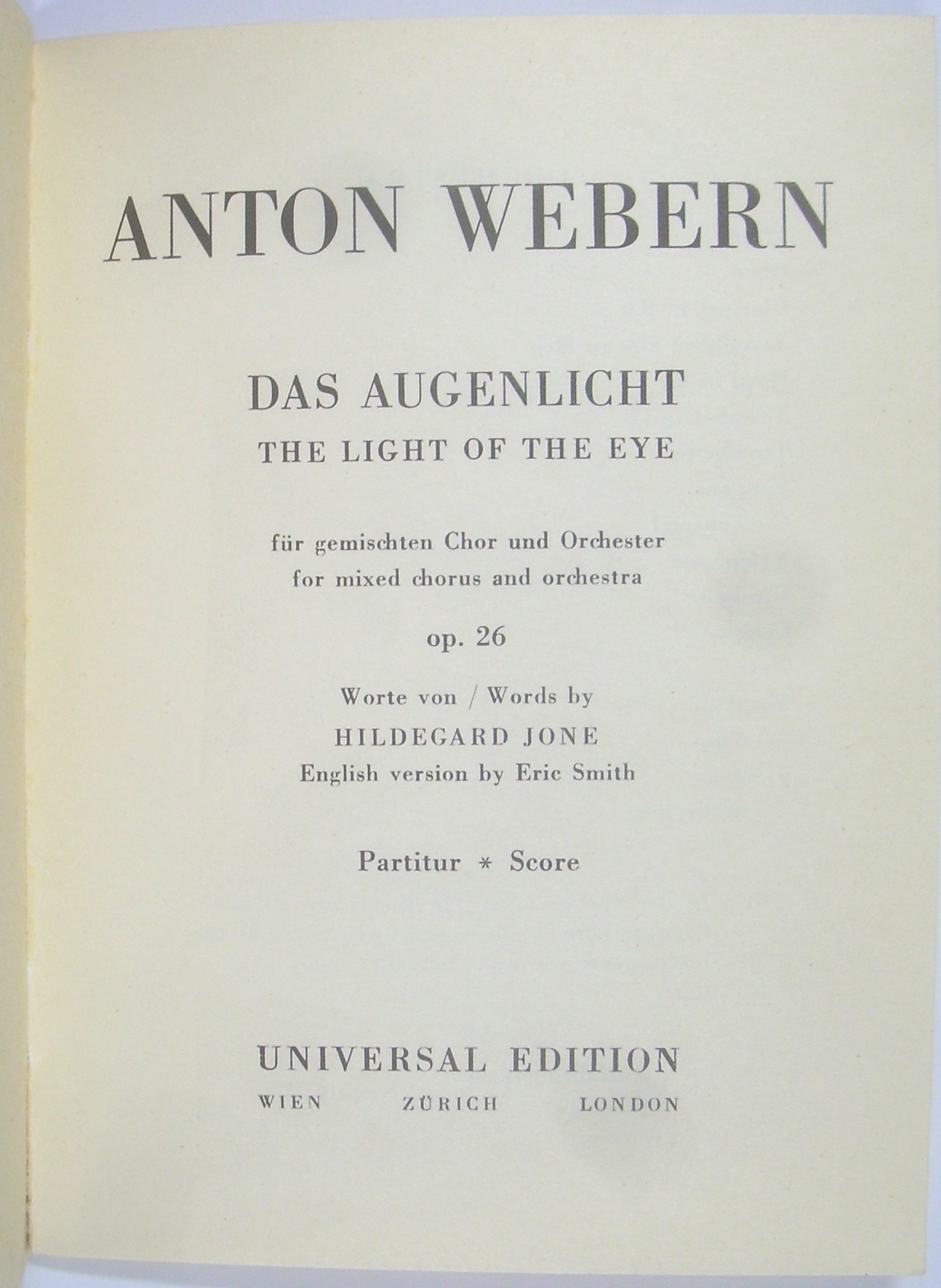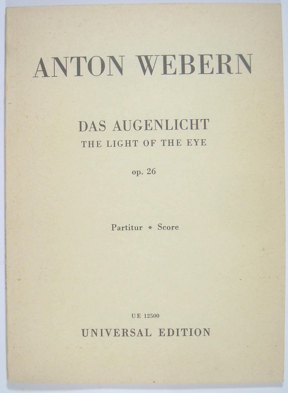 18,5x13,5 cm. (4), 20 Seiten, heller Originalkarton. Seite 1 mit Copyright-Vermerk 1956 by Universal-Edition, doppelter Verlagsnummer "U.E. 11473-12500", ab Seite 2 mit Verlagsnummer "U.E. 11473". Letzte Umschlagseite hinten mit Druckvermerk "Printed in Austria W VII/56", Umschlagrücken mit Aufdruck "U.E. 12500 * Webern * Das Augenlicht * Partitur". Hintere Umschlagsinnenseite mit handschriftlichem Datum "22.11.58". Ausgezeichneter Zustand.