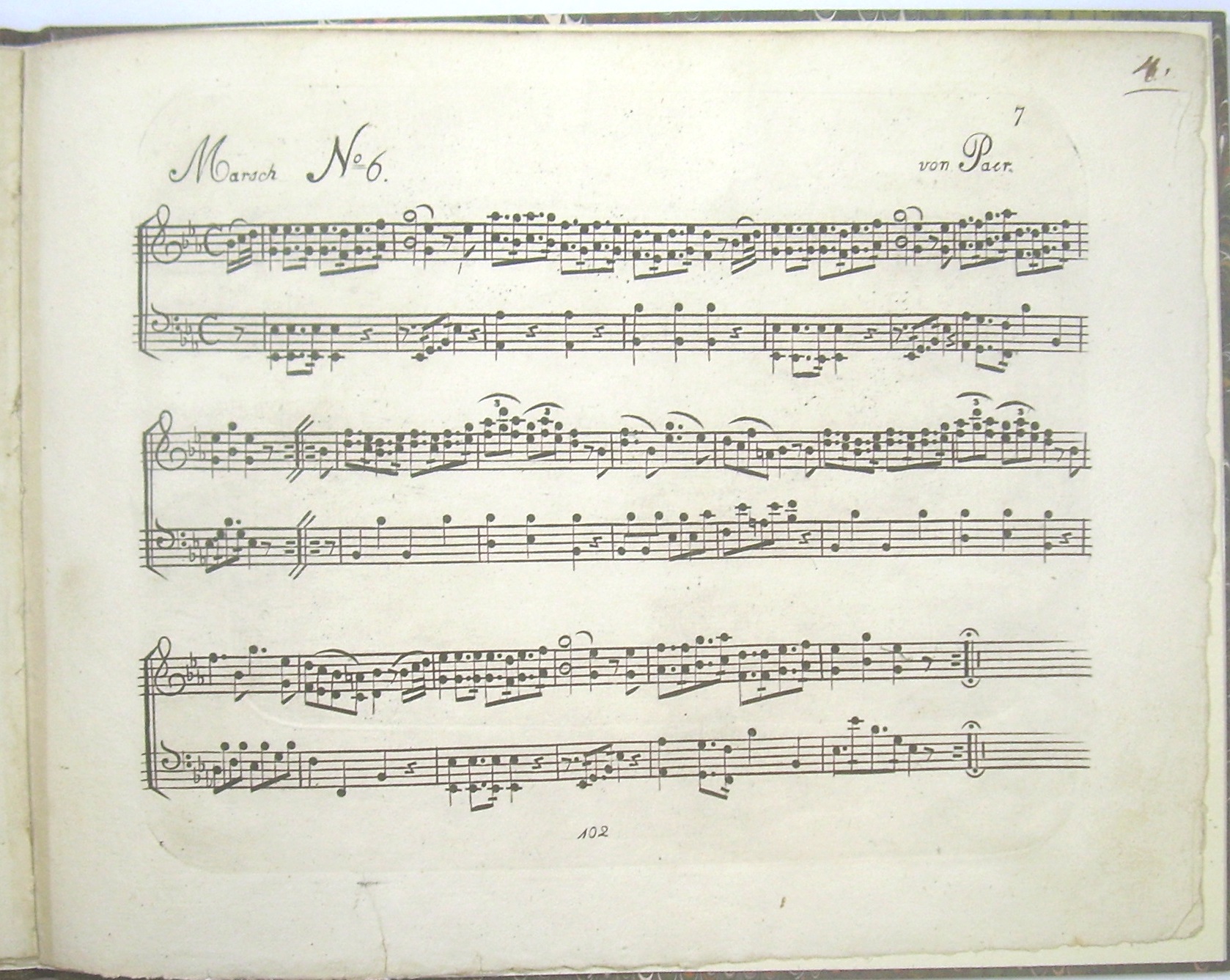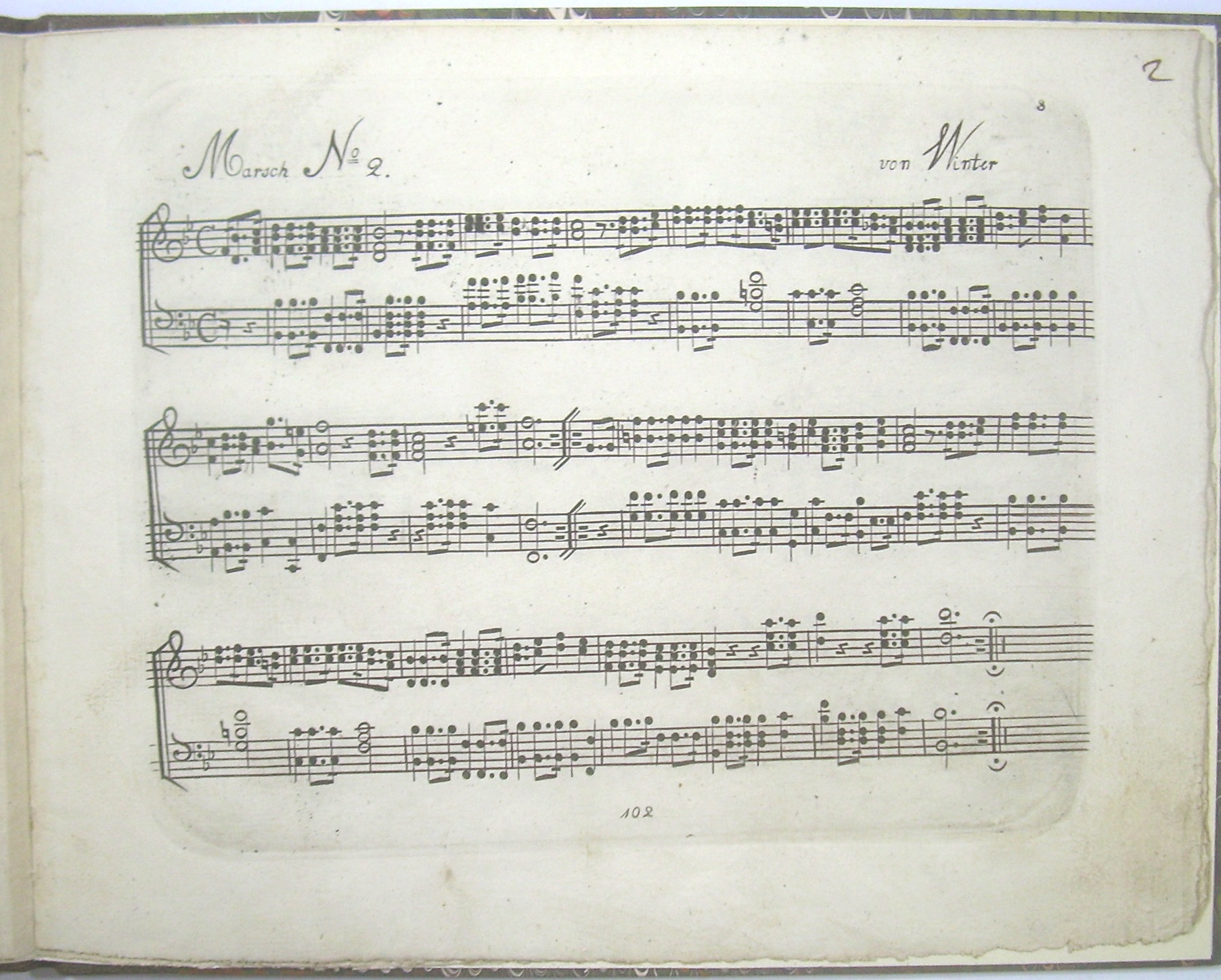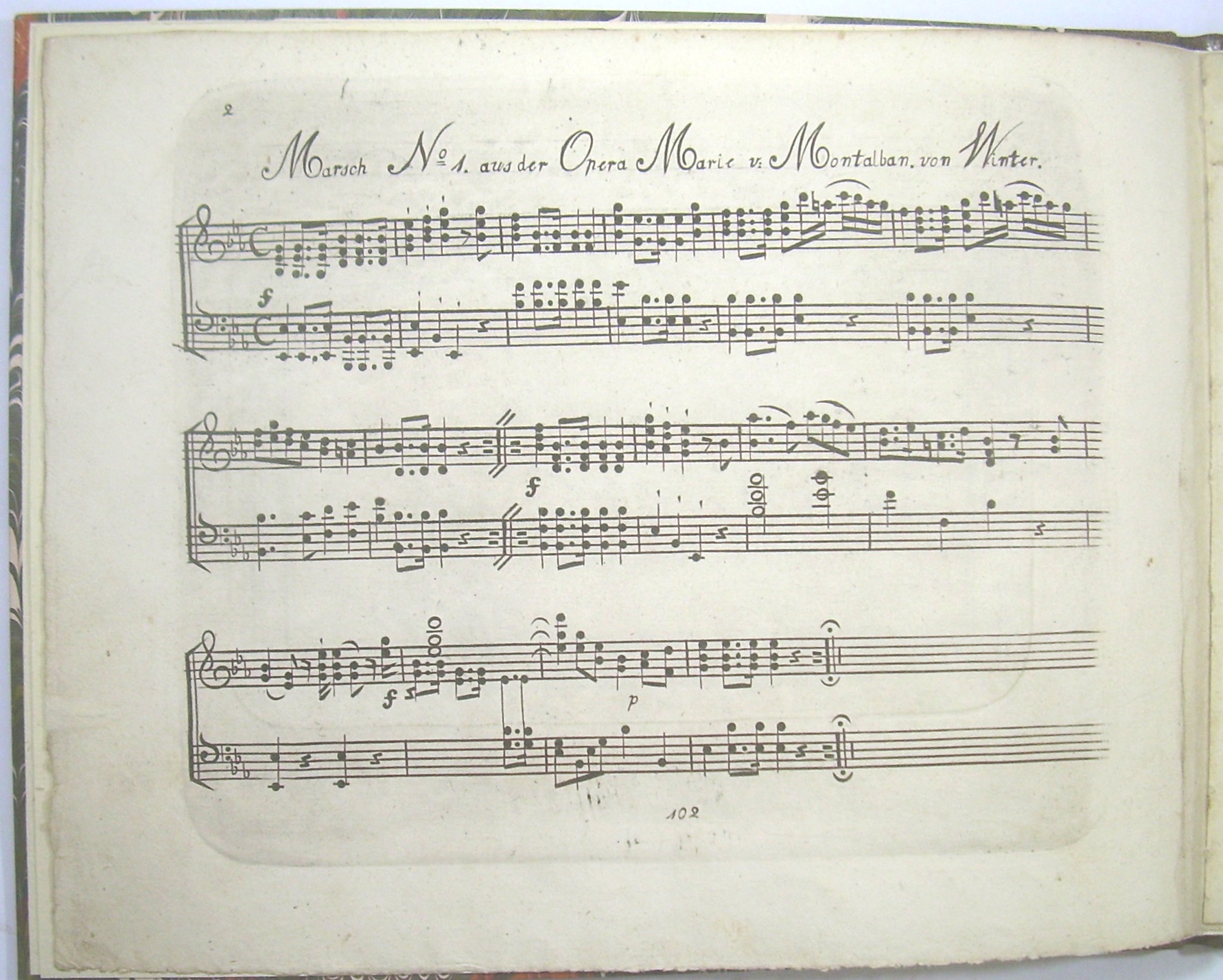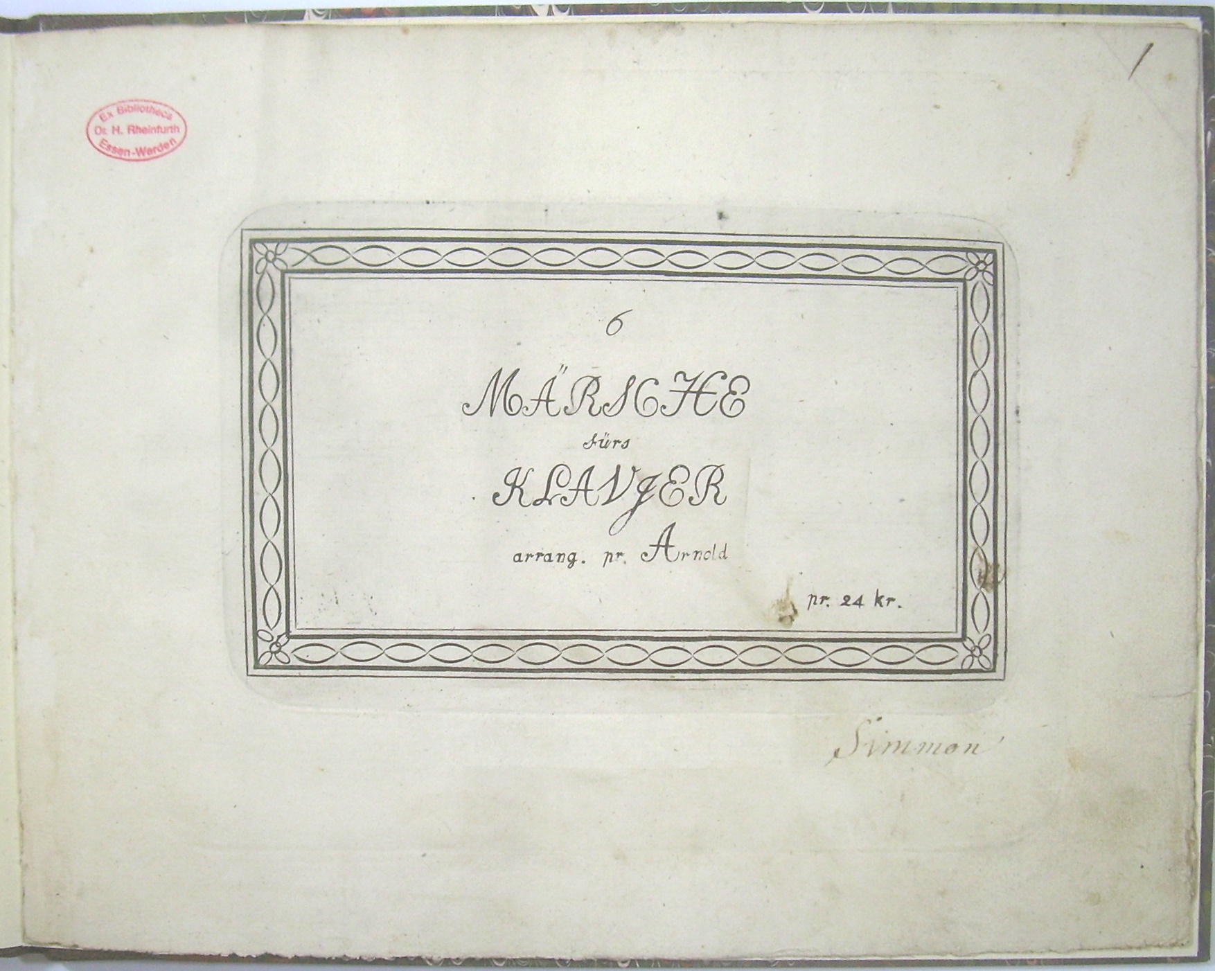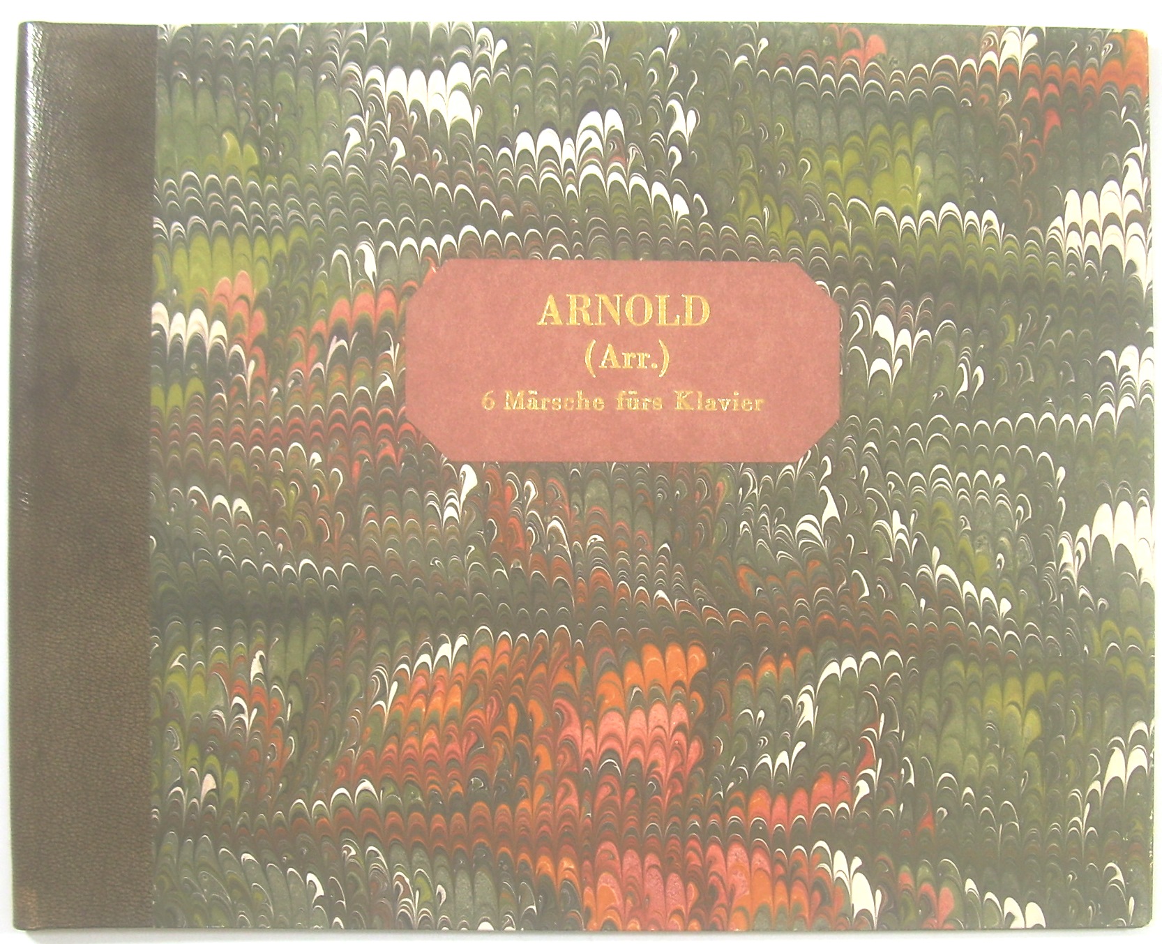 Außergewöhnliche kleine Sammlung von Märschen aus zeitgenössischen Opern. - Einziges bekanntes Exemplar, nicht in RISM und KVK, möglicherweise Eigenverlag des Arrangeurs, vermutlich der Komponist Carl Arnold (1794-1873). - Druckort/Verlag ist für uns auch mit Plattennummer nicht nachweisbar, jedenfalls nicht Schott (trotz des affichierten Händleretiketts). Eine Querverbindung zu André in Offenbach ist aber möglich: Carl Arnold war Schüler von Johann Anton André, der von Arnold ab 1815 auch einige Kompositionen verlegte. Das verwendete Papier der Papiermühle Johann Christoph de Rudolf Im Hof in Basel (1790-1830) mit diesem Wasserzeichen und in diesem Format benutzte auch Johann Anton André (Autograph, RISM 464140010) in den 1810er Jahren. Die geschwungene, handschriftähnliche gestochene Schrift hat große Ähnlichkeit mit lithographierten Titelschriften von André dieser Zeit (vgl. André No. 4378 von 1822, hier Artikelnummer 18259). - Enthält 6 Märsche aus zeitgenössischen Opern: die ersten 3 aus "Marie von Montalban" von Peter von Winter (1754-1826), sowie 3 weitere Märsche von Simon Mayr 1763-1845), und Ferndinando Paer (1771-1839). - Aus der Sammlung des Musikwissenschaftlers und Bibliographen Hans Rheinfurth, der diese Rarität bibliophil binden ließ.
