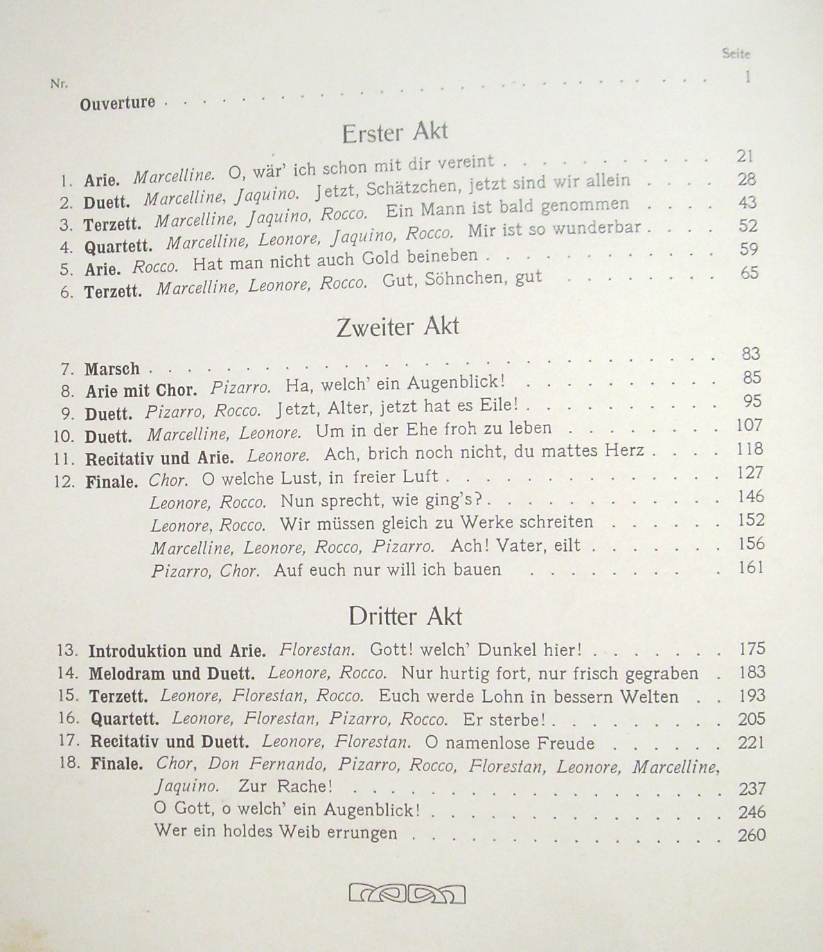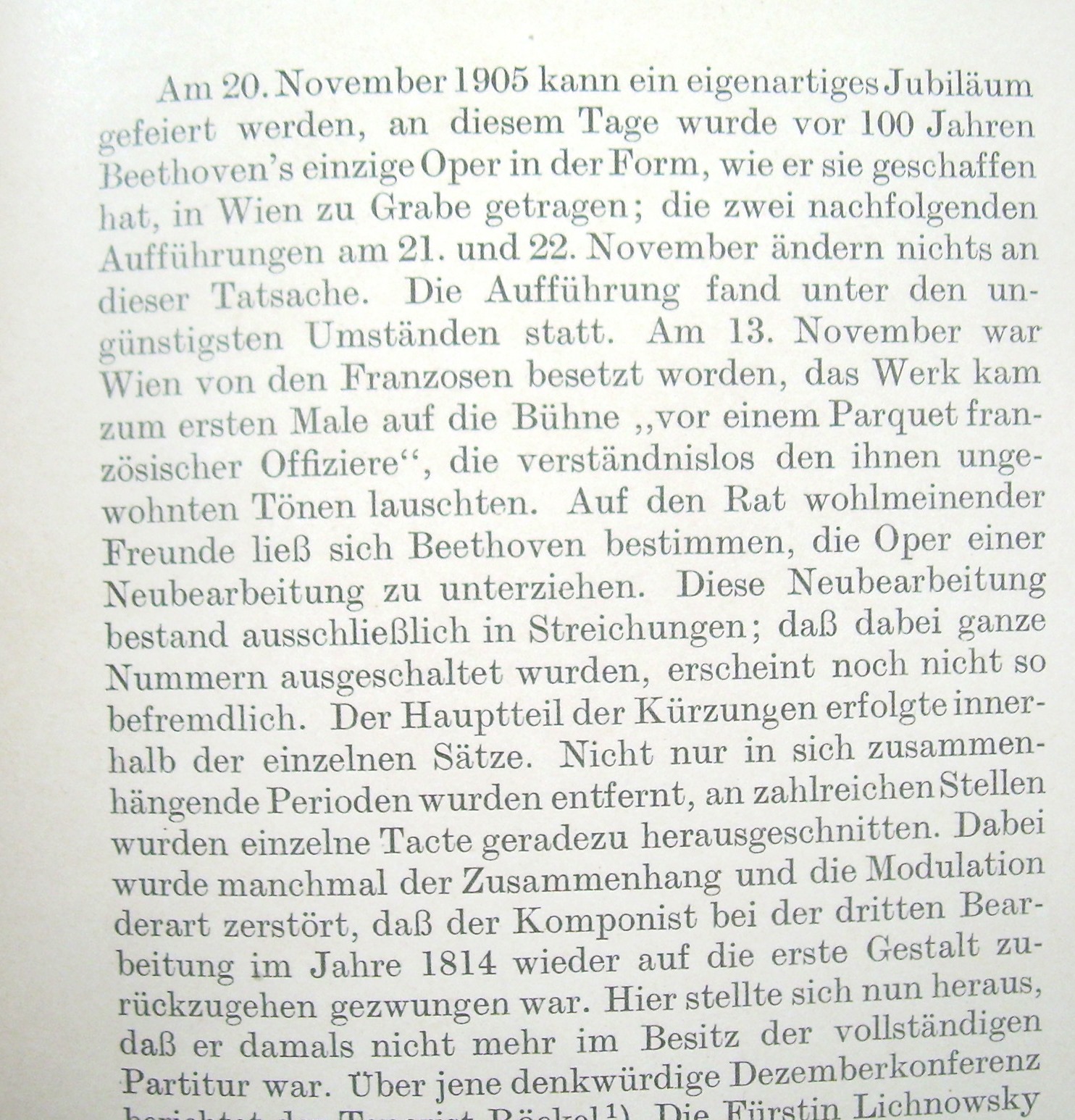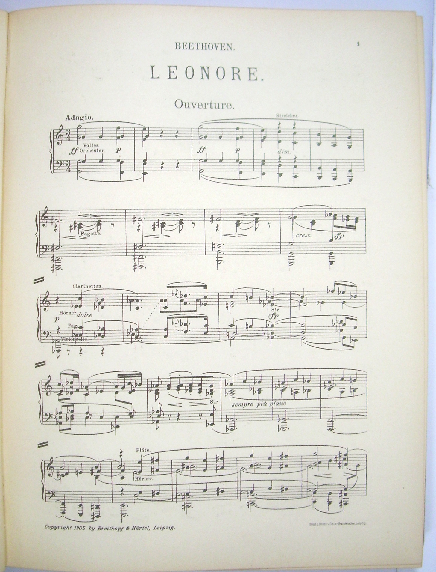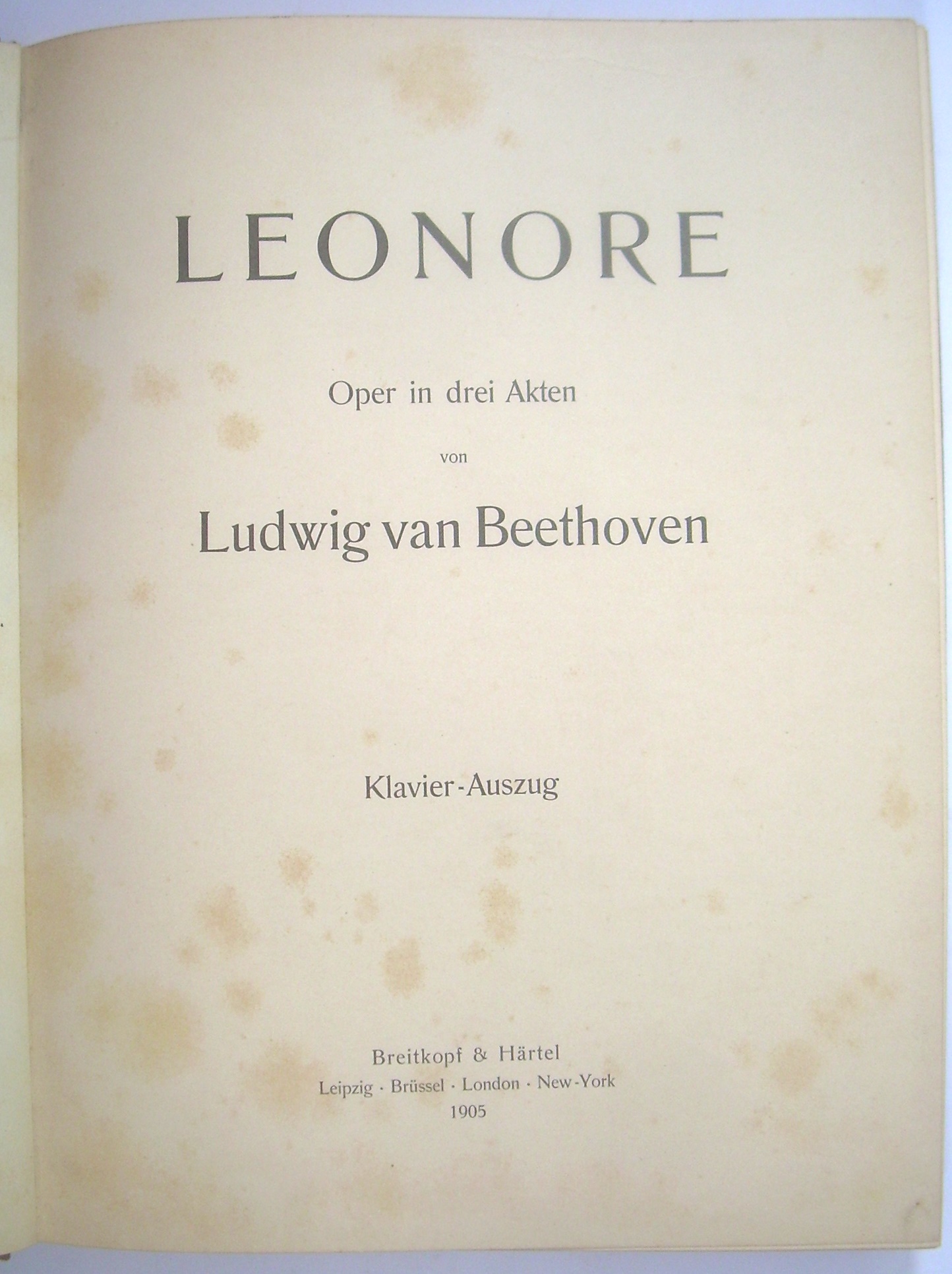 Erste Ausgabe der ersten Fassung (3 Akte), mit der Leonoren-Ouvertüre Nr. 2, zum 100-Jahr-Jubiläum der Uraufführung (20.11.1805 Wien). Mit ausführlichem Vorwort des Herausgebers. - Der Musikwissenschaftler Erich Prieger (1849-1913), Mitbegründer und Förderer des Vereins Beethoven-Haus in Bonn, erwarb 1897 für 200 000 Mark die Autographen-Sammlung Artaria mit zahlreichen Beethoven-Handschriften. Sein Hauptwerk ist die Rekonstruktion der Urfassung von Beethovens Oper Leonore, die 1905 in Berlin unter Richard Strauss 100 Jahre nach der Wiener Uraufführung erstmals wieder auf die Bühne gebracht wurde.