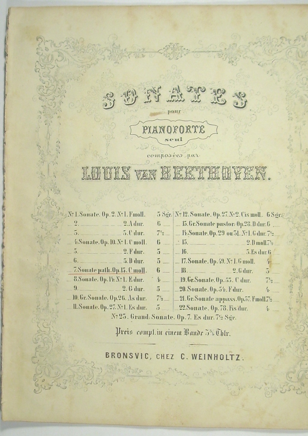 Datierung Weinholtz-Verlagsanzeige von 1854. Aus der Sonatenausgabe in 1 Band (23 Sonaten) von 1854. Die Sonaten wurden auch einzeln verkauft, der Reihentitel mit Auflistung und Preisangaben.