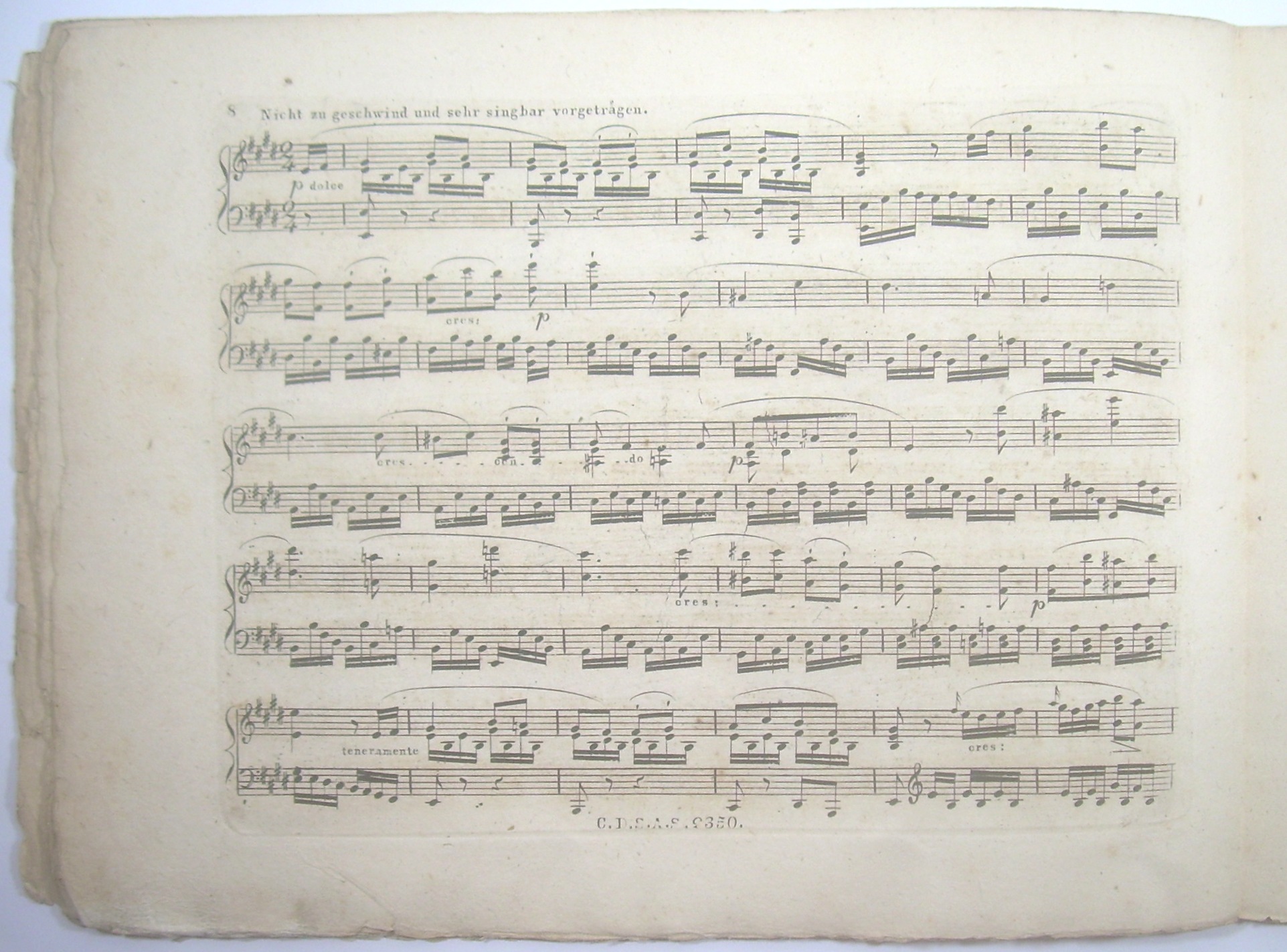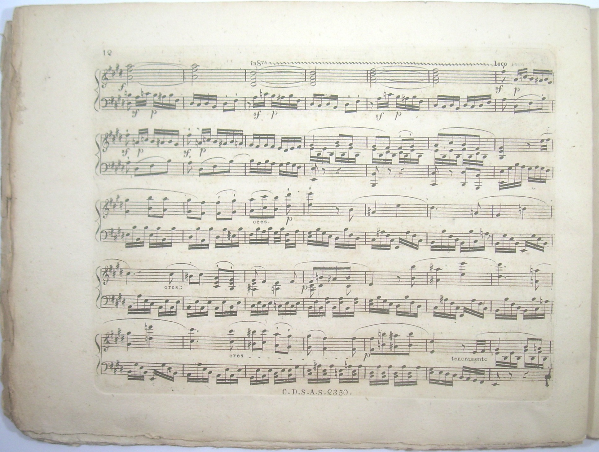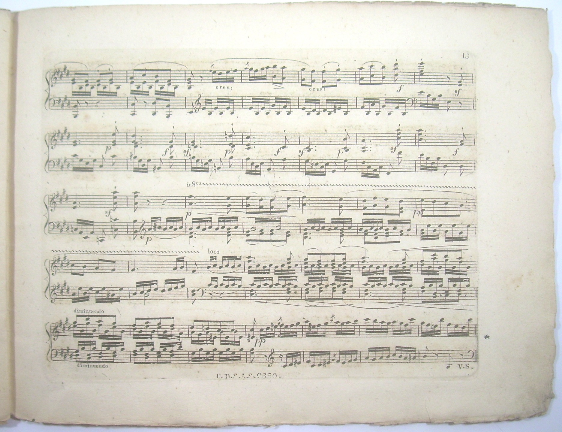Querformat 26x35 cm, 16 Seiten gestochen, (Titel, 2 LS, Notentext S. 2-16,2 LS). Original ungebunden, unbeschnitten, Titel fleckig, mit Namenszug. - PN auf Seite 2 "C.D.S.2350", PN auf S. 11 fehlt, S. 12 letzter Takt, "loco"-Platzierung korrigiert oberhalb der ersten Note, der falsche "loco"-Druck auf der 2. Note noch durchscheinend. Einige Plattenrisse, Preis auf dem Titel nicht ausgefüllt.