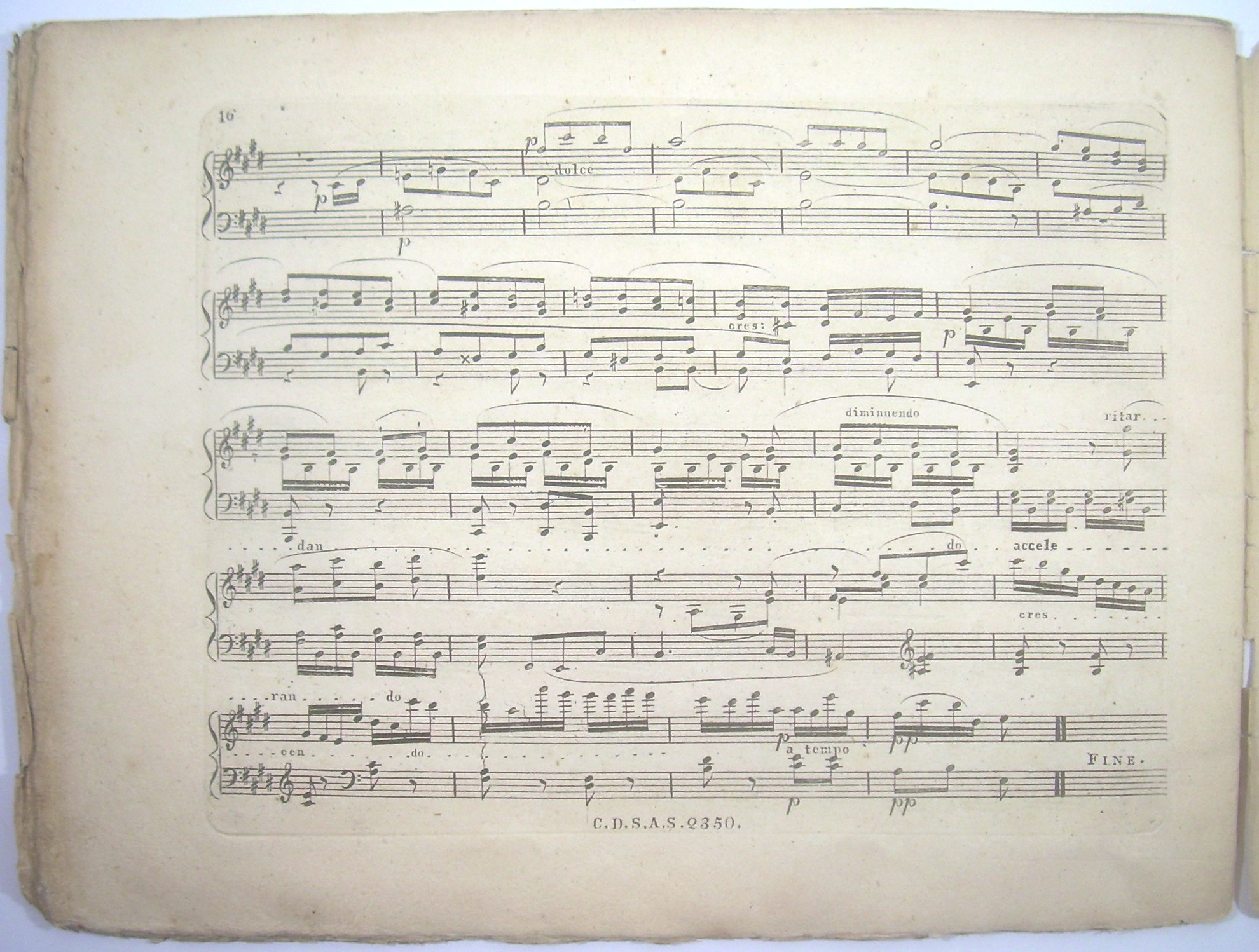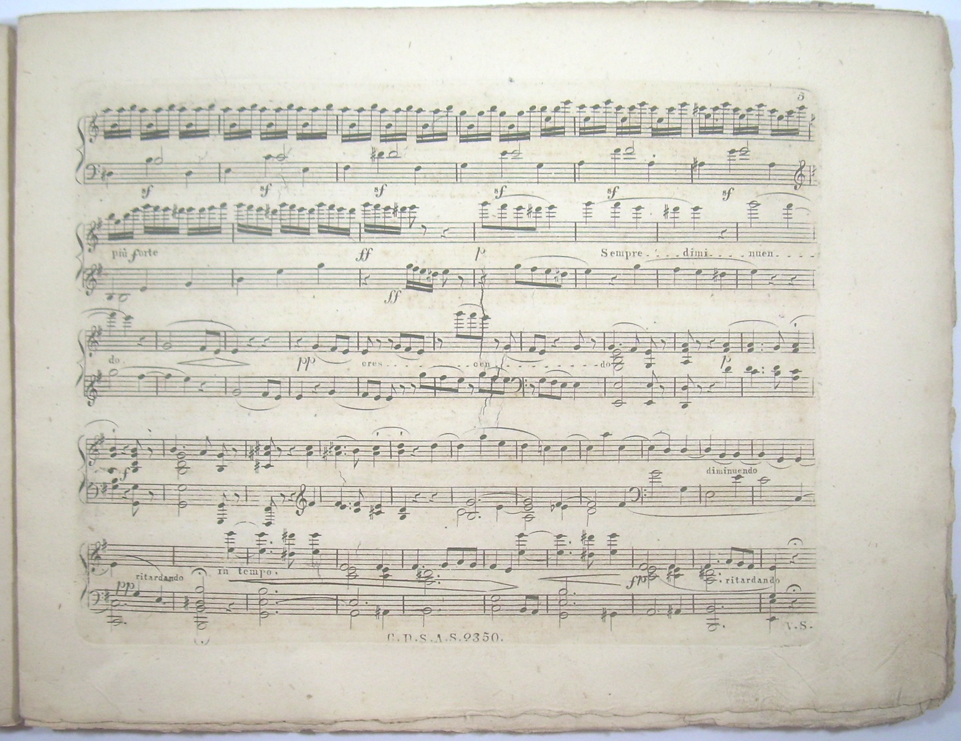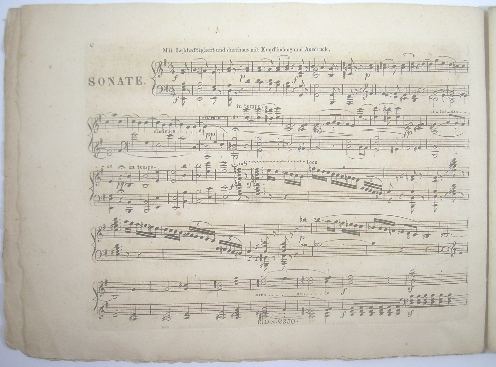 Querformat 26x35 cm, 16 Seiten gestochen, (Titel, 2 LS, Notentext S. 2-16,2 LS). Original ungebunden, unbeschnitten, Titel fleckig, mit Namenszug. - PN auf Seite 2 "C.D.S.2350", PN auf S. 11 fehlt, S. 12 letzter Takt, "loco"-Platzierung korrigiert oberhalb der ersten Note, der falsche "loco"-Druck auf der 2. Note noch durchscheinend. Einige Plattenrisse, Preis auf dem Titel nicht ausgefüllt.