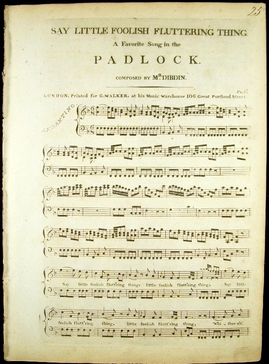 Uraufführung der Erfolgskomödie Padlock von Dibdin und Bickersatff Padlock Lonbdon 1768. Das Stück hielt sich lange auf den Spielplänen, der Song "Say litte foolish" (auch als "Sweet Robin" bezeichnet) wurde vielfach nachgedruckt. Datierung geschätzt.