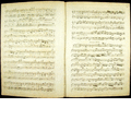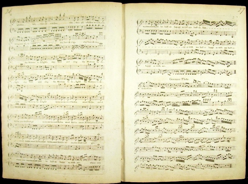 33x24 cm, 3 Seiten, gestochen, ausgebunden, alt hinterlegt. Der Gesangstext mittig im 2-systemigen Notentext, Begleitstimmen im oberen System fallweise in kleineren Stichnoten. Zusätzliche Stimme für Flöte am Ende.