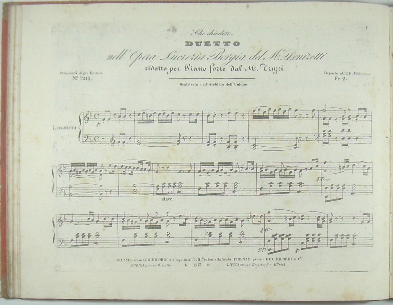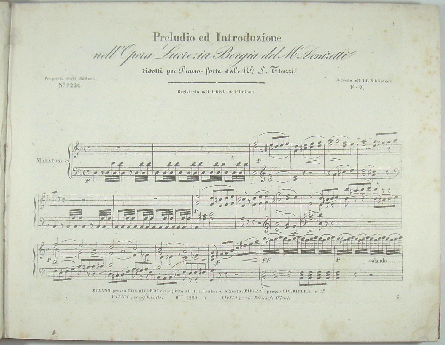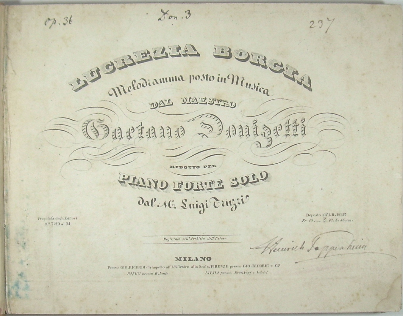Lucrezia Borgia. Melodramma posto in musica, ridotto per piano forte solo dal Luigi Truzzi. [Klavierauszug ohne Text].
