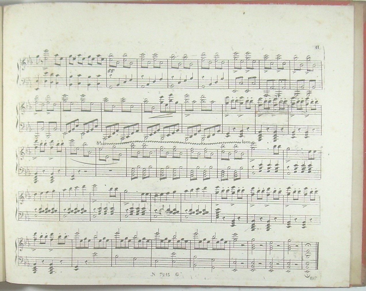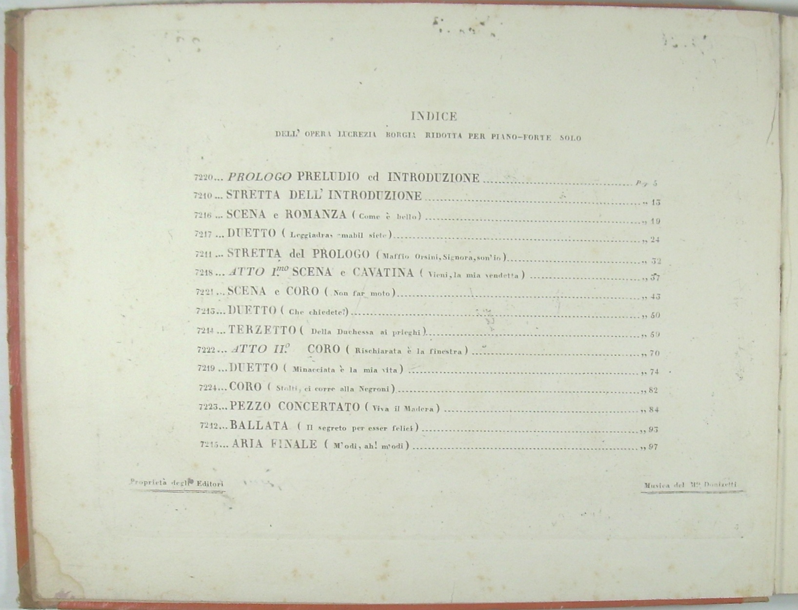 Uraufführung der Oper Mailand 1833, Datierung nach PN. - Enthält 15 Musiknummern, jede mit Kopftitel, Preis eigener PN und Paginierung oben, unten durchgehend paginiert S. 5-107. (PN 7220B, 7210, 7216-7218, 7221, 7213, 7214, 7222, 7219, 7224, 7223, 7212, 7215).