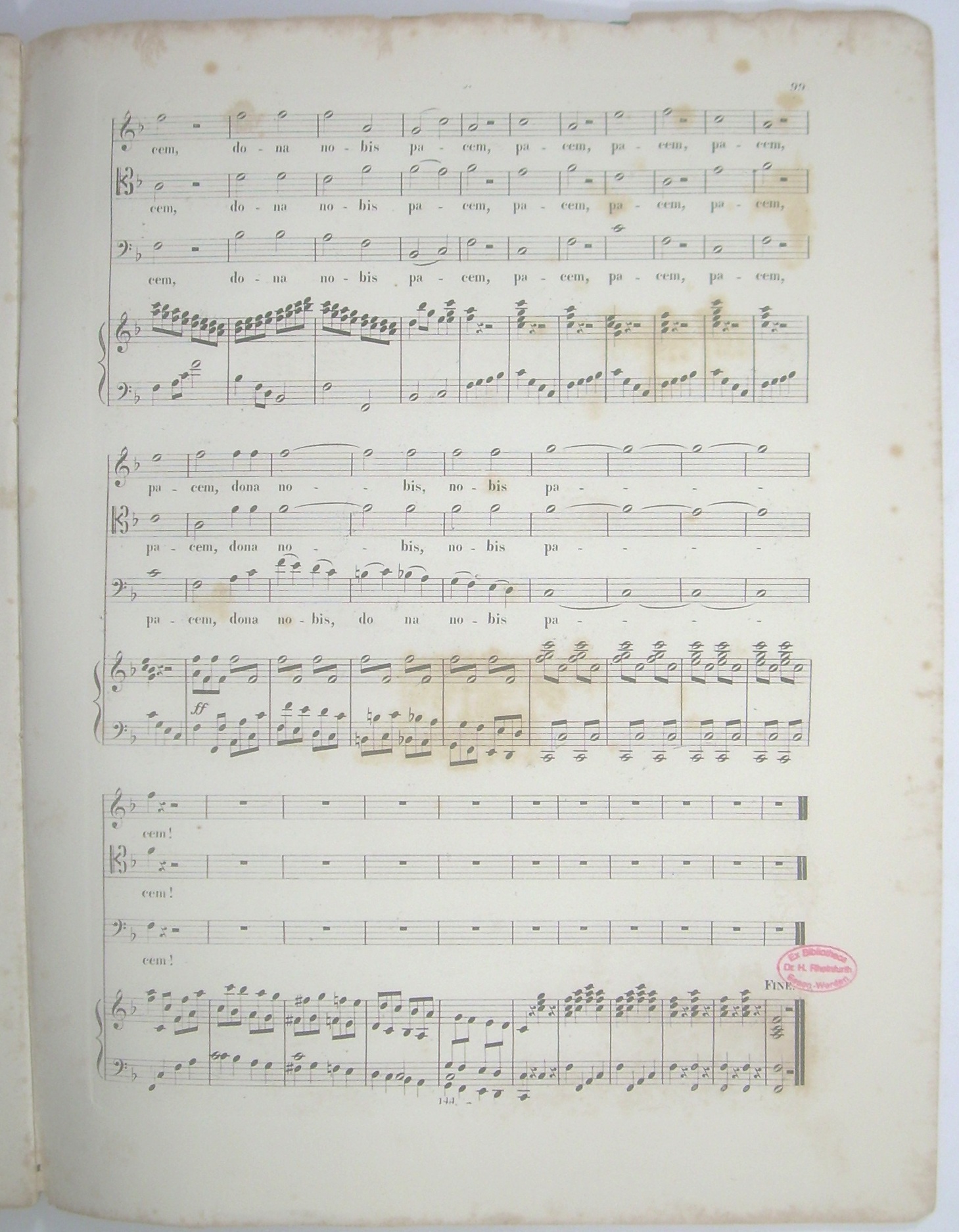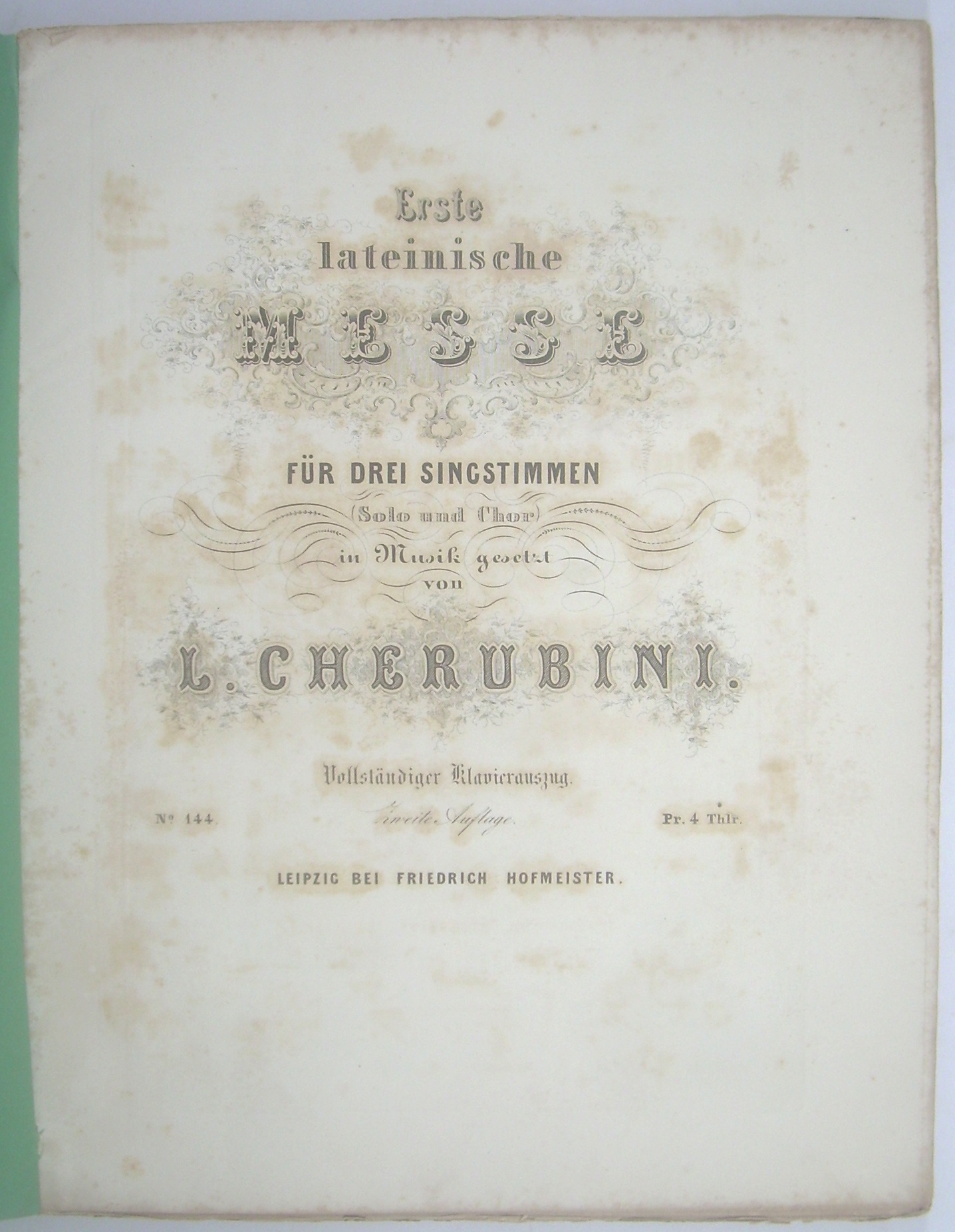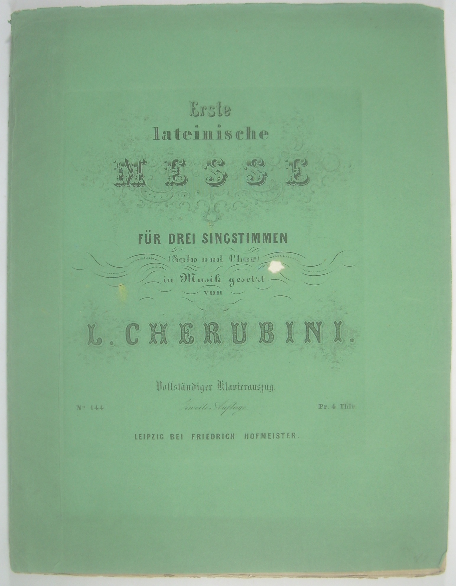 * Hofmeister XIX Februar 1853.- Die 2. Auflage des Klavierauszugs der "Messe de Chimay" (Cäcilienmesse, F-Dur), die Cherubini während seines Erholungsaufenthaltes im belgischen Chimay auf Bitte des dortigen Musikvereines schrieb. Die Uraufführung erfolgte am Cäcilientag (22.11.1808) in Chimay, Druck der Partitur und Klavierauszug 1810.