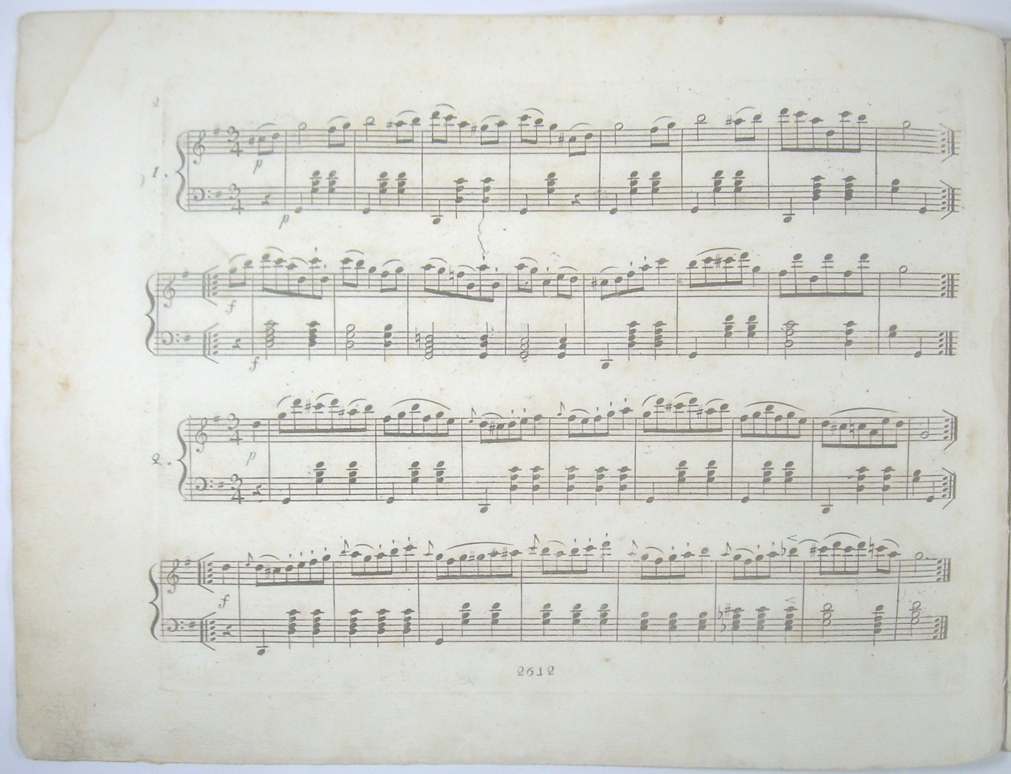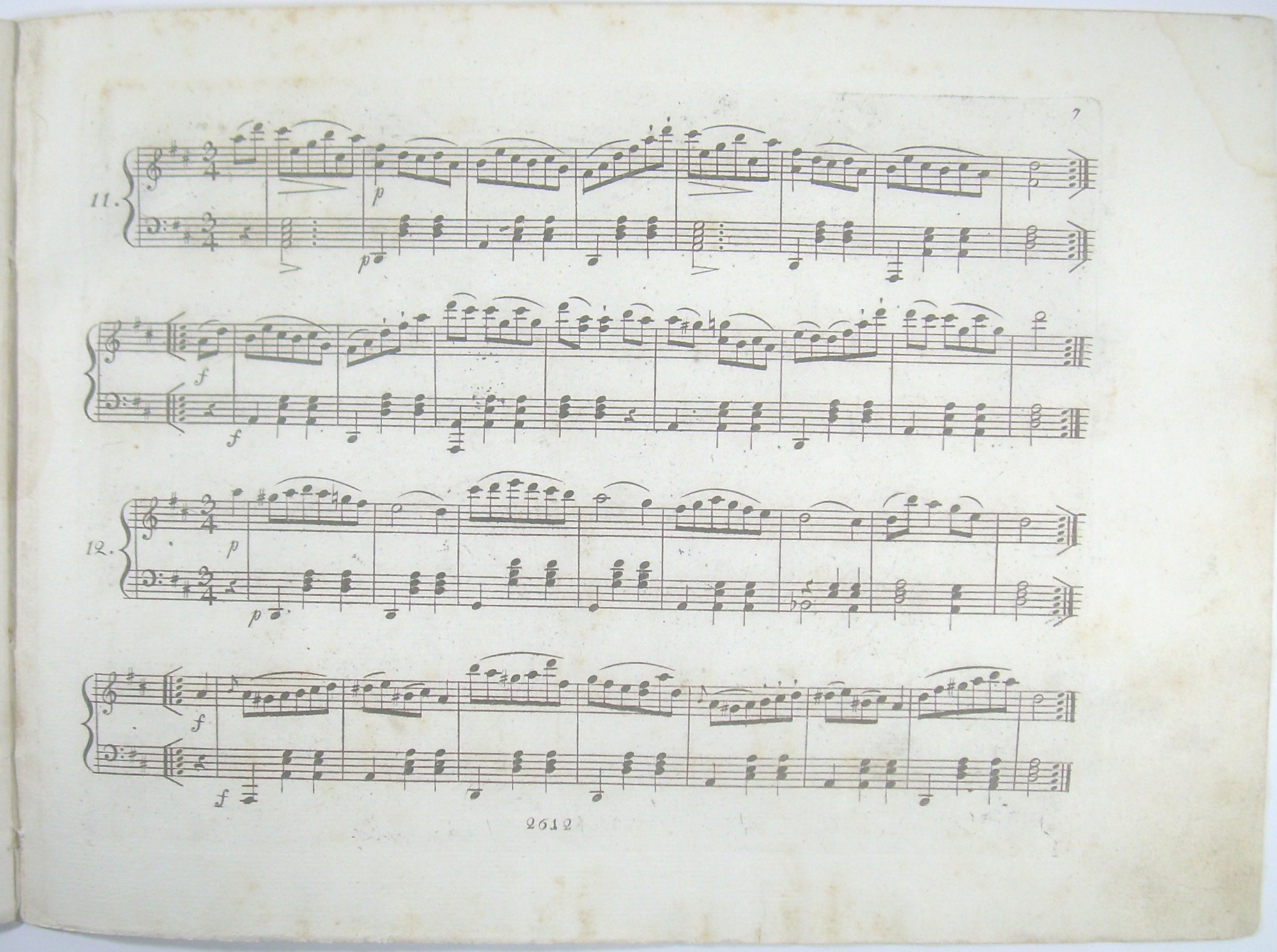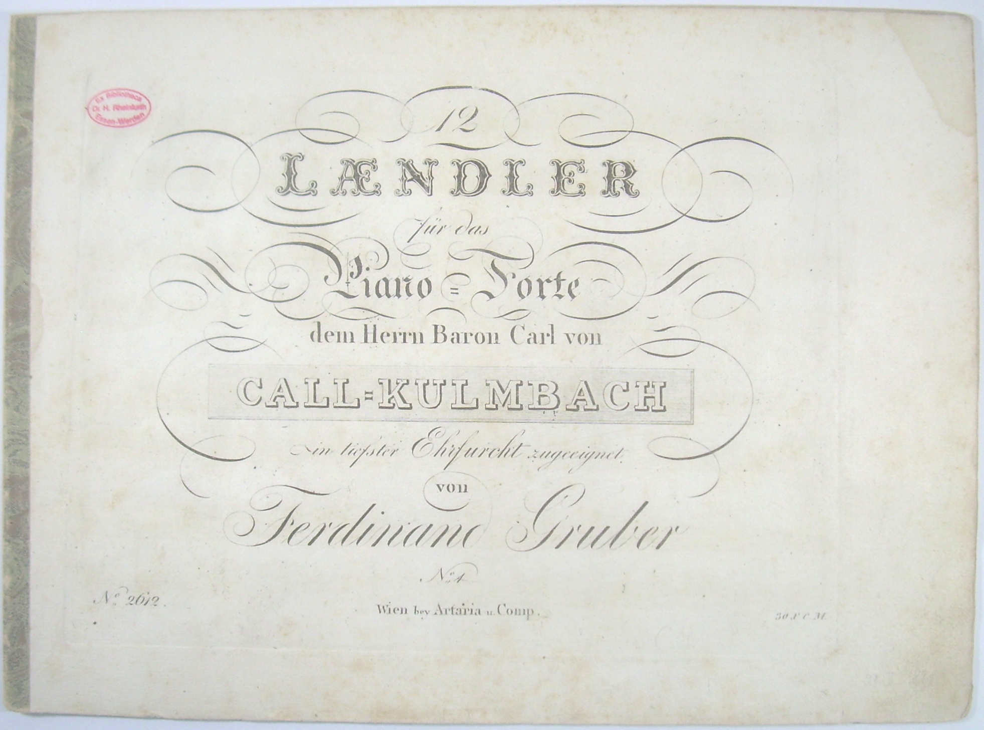 Erstes von fast 40 Heften mit Tänzen, die Ferdinand Gruber bei Artaria zwischen 1820 (PN 2612) und 1832 (PN 3044) veröffentlichte. - Gruber gehört zur ersten Generation der Wiener Tanzmusik-Komponisten um Johann Strauss Vater und Joseph Lanner, seine Beliebtheit zeigt sich auch in den weit über 200 Abschriften, die das Quellenlexikon RISM auflistet. Das Österreichische Musiklexikon erwähnt ihn im Beitrag über den Walzer: "Immerhin hat z. B. Ferdinand Gruber um 1825 die Einleitungstakte auf zehn bis 14 erhöht, sie aber nicht extra bezeichnet." und Philipp Fahrbach sen. erinnert noch 1847 sich an seine für die frühen Walzerkomponisten typische einfache Instrumentierung. Eine zentrale Rolle spielt Gruber schließlich in dem Liederspiel "Franz Schubert" von Franz von Suppé (1864). Die Beliebtheit dieses Tanzmusik-Komponisten steht in erstaunlichem Gegensatz zu den (nicht vorhandenen) biographischen Informationen. "Ferdinand Gruber, zu dem keine biographischen Angaben bekannt sind, fehlt auch bei Anton Ziegler, Adressen-Buch von Tonkünstlern, Dilettanten, Hof- Kammer- Theater- und Kirchen-Musikern in Wien, Wien 1823. Ein Bericht aus Wien zählt ihn 1826 zu den dortigen 'jungen Componisten', die 'beliebte Tänze' geschaffen haben." (Kopitz, 2024).