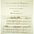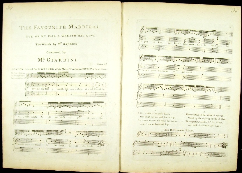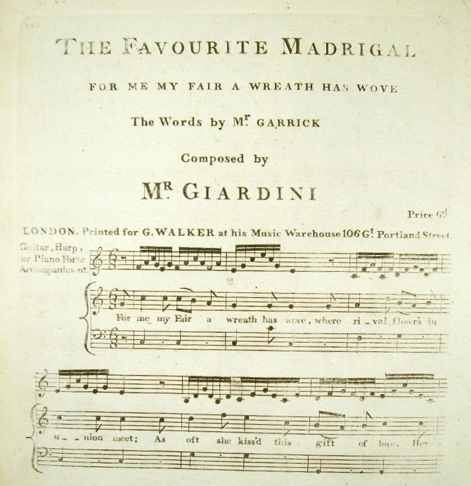 Felice Giardini (1716-1796), 40 Jahre lang Operndirektor in London, einer der führenden Komponisten des galanten Stils in England. Seine Madrigalvertonung "For me my fair a wreath..." erschien u.a. 1783 in "A selection of English songs Vol. III." - Datierung geschätzt nach der Verlagsadresse (1795-1823).