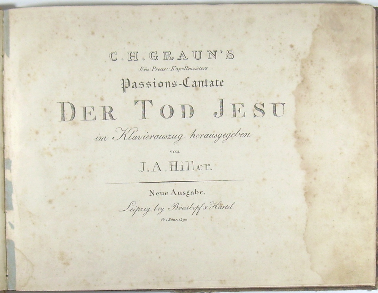 C. H. Graun's Passions-Cantate Der Tod Jesu, im Klavierauszug herausgegeben von J. A. Hiller. Neue Ausgabe.