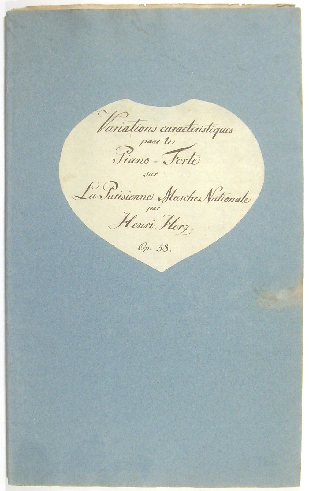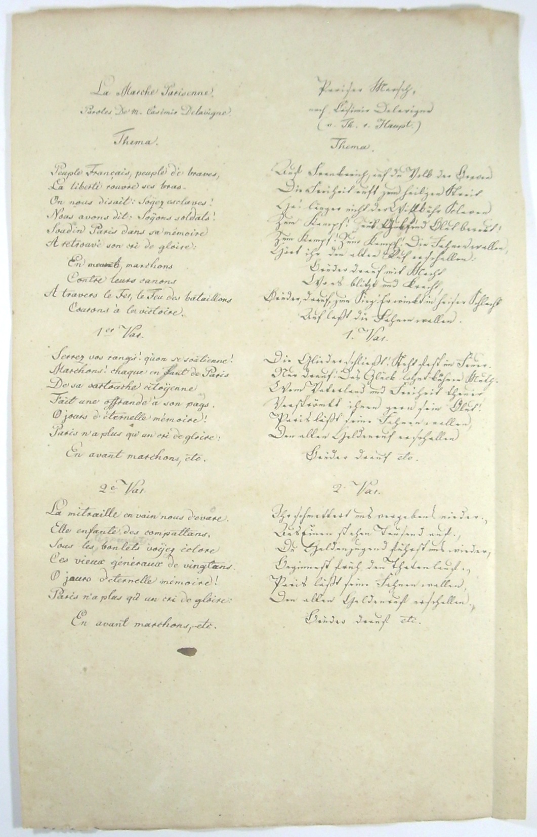 Abschrift der Ausgabe Schott PN 3363, Mainz 1830, das Gedicht mit französischem und deutschen Paralleltext. Signiert und gestempelt vom Schreiber "E. Gebser". - Die Variationen op. 58 von Henri Herz über den Marsch "La Parisienne" wurden zur Feier der siegreichen Julirevolution und zum Besten der Opfer der Revolution in paris aufgeführt. Drucke des Werkes erschienen in London, Paris und Mainz.