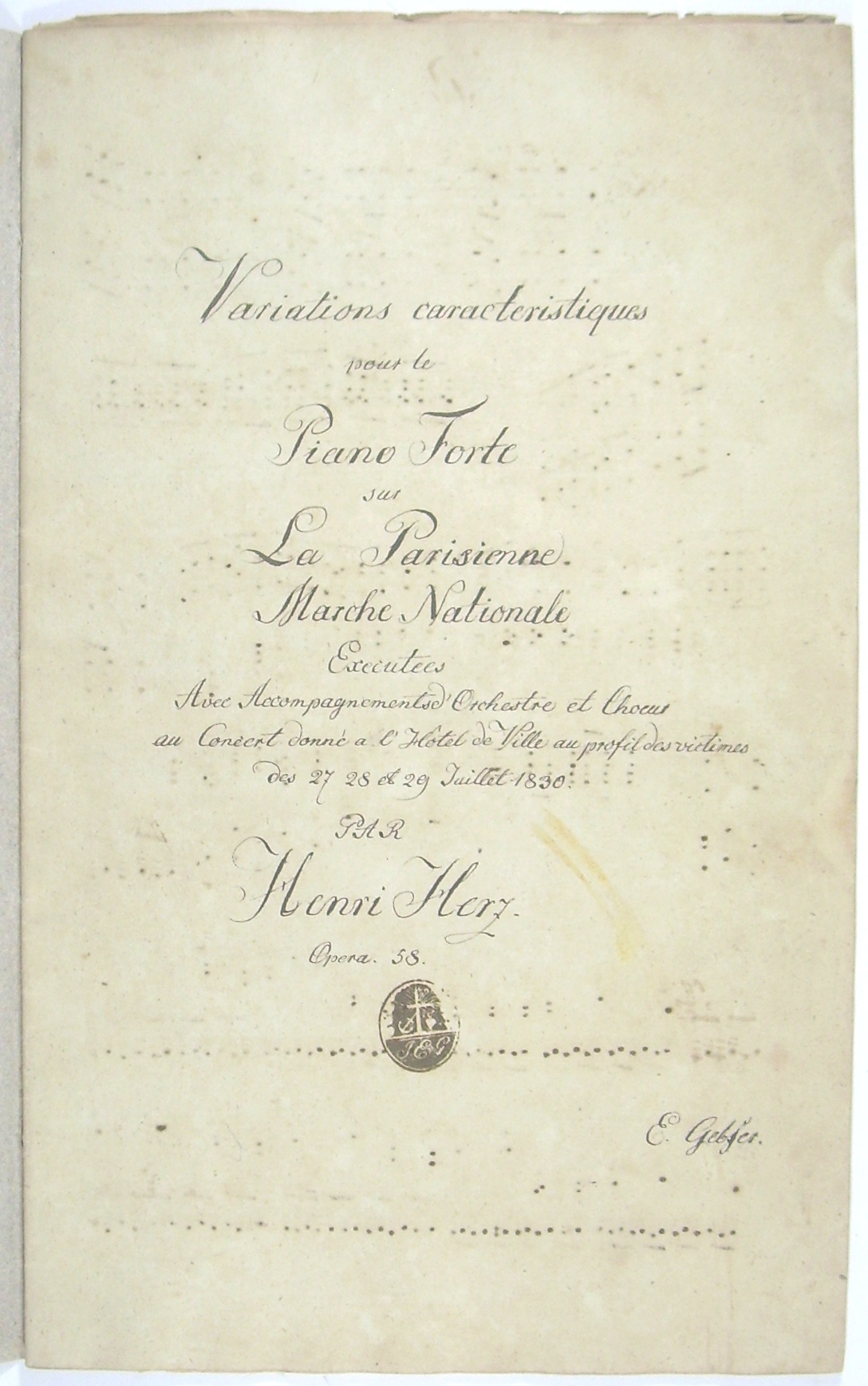 [Musikmanuskript:] Variations caractéristiques pour le piano forté sur La Parisienne, marche nationale, opéra 58, exécutées avec accompagnement d'orchestre et choeur au concert donné à l'Hôtel de Ville au profit des victimes des 27, 28, et 29 Juillet 1830.
