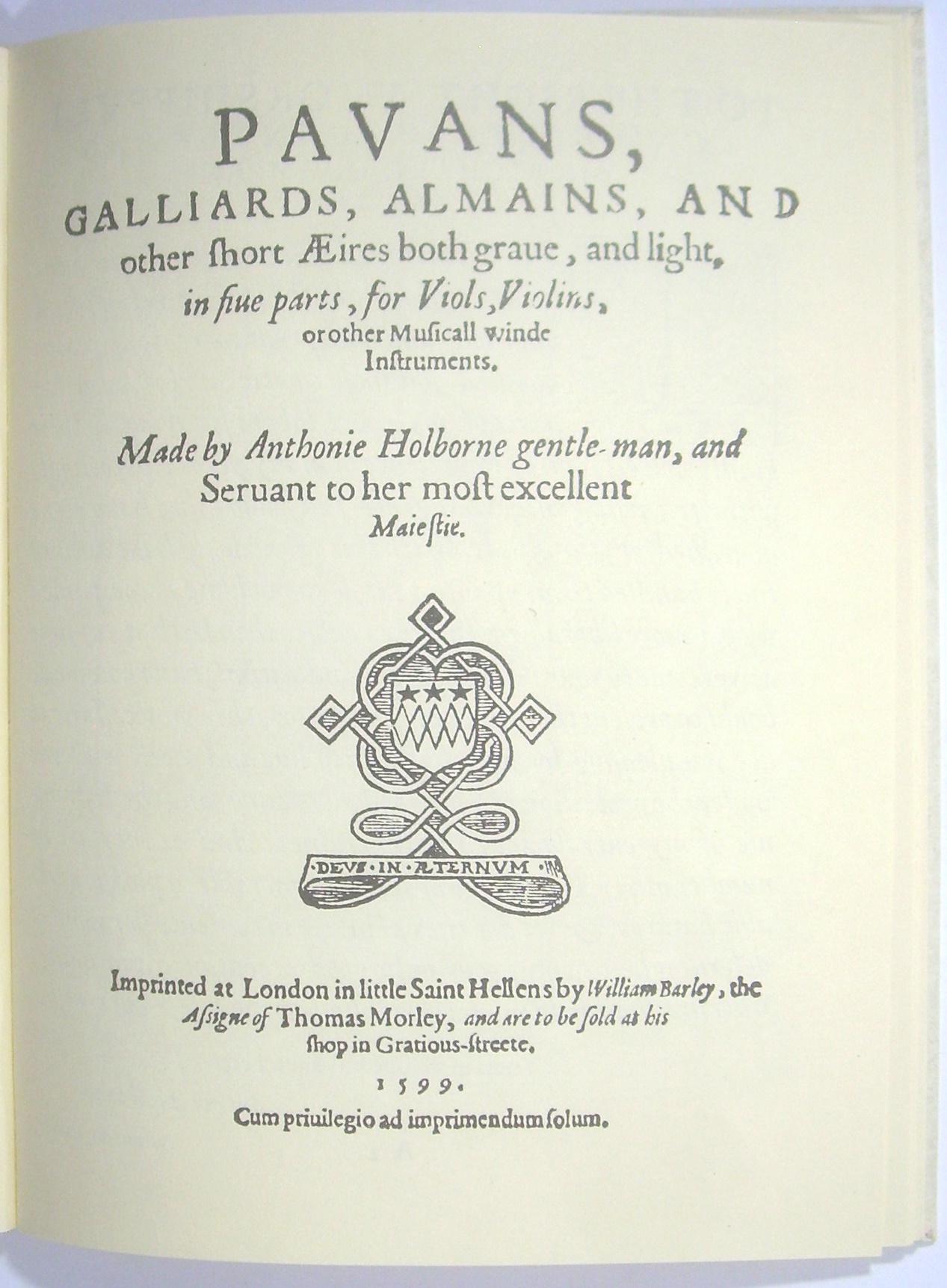 Pavans, Galliards, Almains, and other short Aeirs both grave , and light, in five parts, for Viols, Violins, or other Musicall Winde Instruments. Reprint der Ausgabe London 1599.