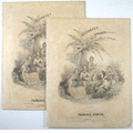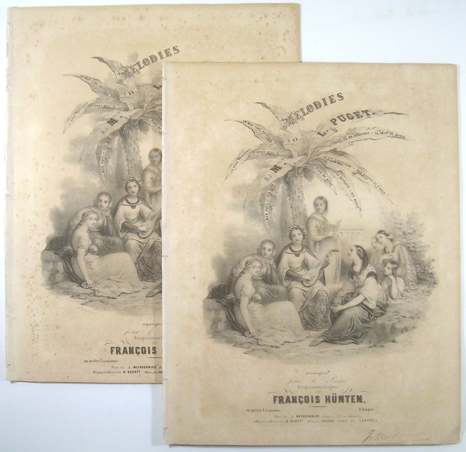 2 Hefte 32x26 cm, 15, 15 Seiten gestochen, ausgebunden, 2 Originalumschläge mit (wiederholtem) illustrierten Titel mit Verlegerstempel. Jedes Heft mit "Catalogue des Ouvrages de François Hünten, publiés par J. Meissonier".