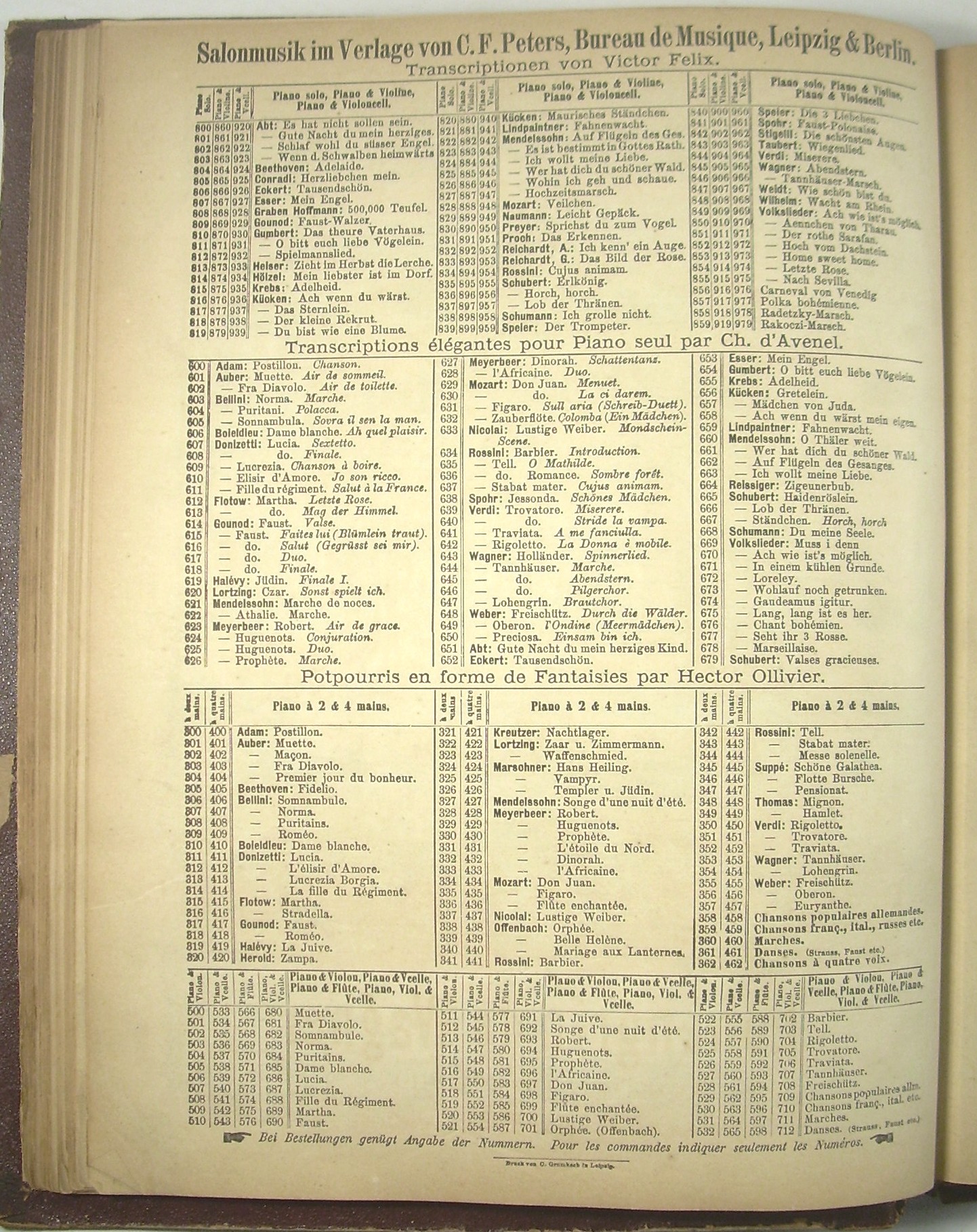 Sammelband Klavier mit 13 Potpourris nach Opern von Auber, Donizetti, Flotow, Gounod, Meyerbeer, Mozart, Offenbach, Rossini, Wagner [Peters], u.a. vorgebunden 4 Werke von Weber (op. 81 und 72) und Schubert (op. 142, op. 26/1) [Litolff].