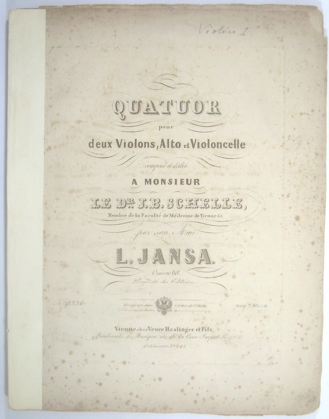 Erstausgabe. - Leopold Jansa (1795-1875), Geiger und Komponist, studierte in Wien bei Vorisek und Förster; ab 1824 Violinist in der Hofkapelle, führte nach Schuppanzighs Tod die unterbrochene Streichquartett-Tradition weiter.