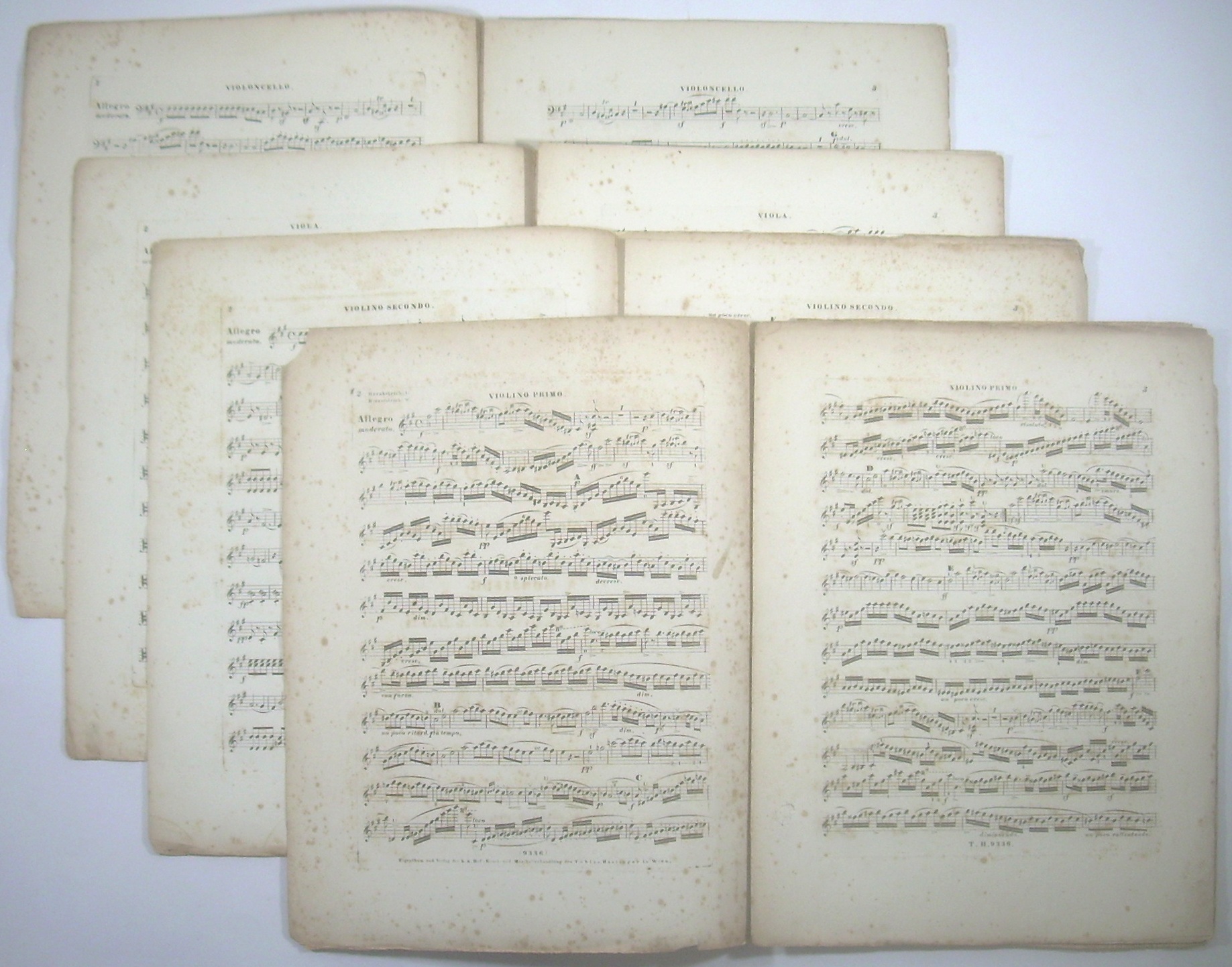 4 Stimmhefte 35x27 cm, 11, 7, 7, 7 Seiten gestochen, Rücken verstärkt, stockfleckig, vl1 letztes Blatt mit Einriss.