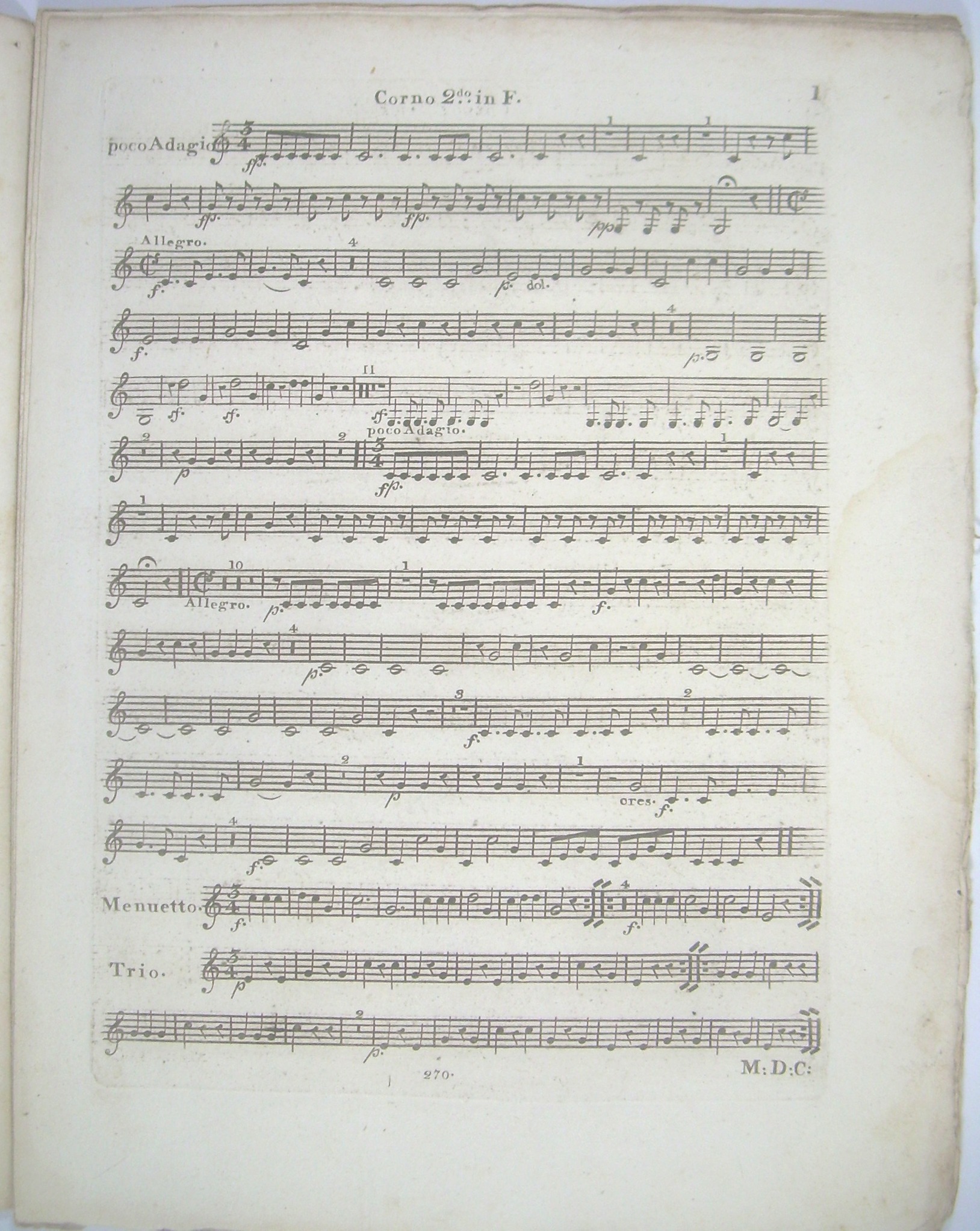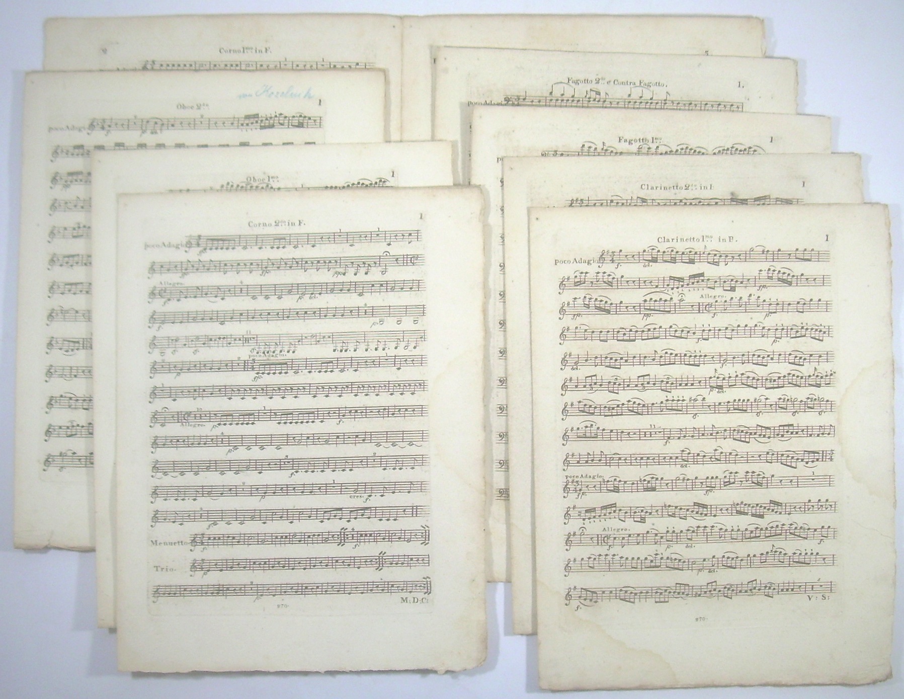 8 Stimmen 35x27 cm, 3, 2, 3, 3, 3, 3, 3, 3 Seiten gestochen, original ungebunden, unbeschnitten, Corno I mit Titelblatt, Titel mit 2 handschriftlichen Einträgen. Ausgezeichneter Zustand.