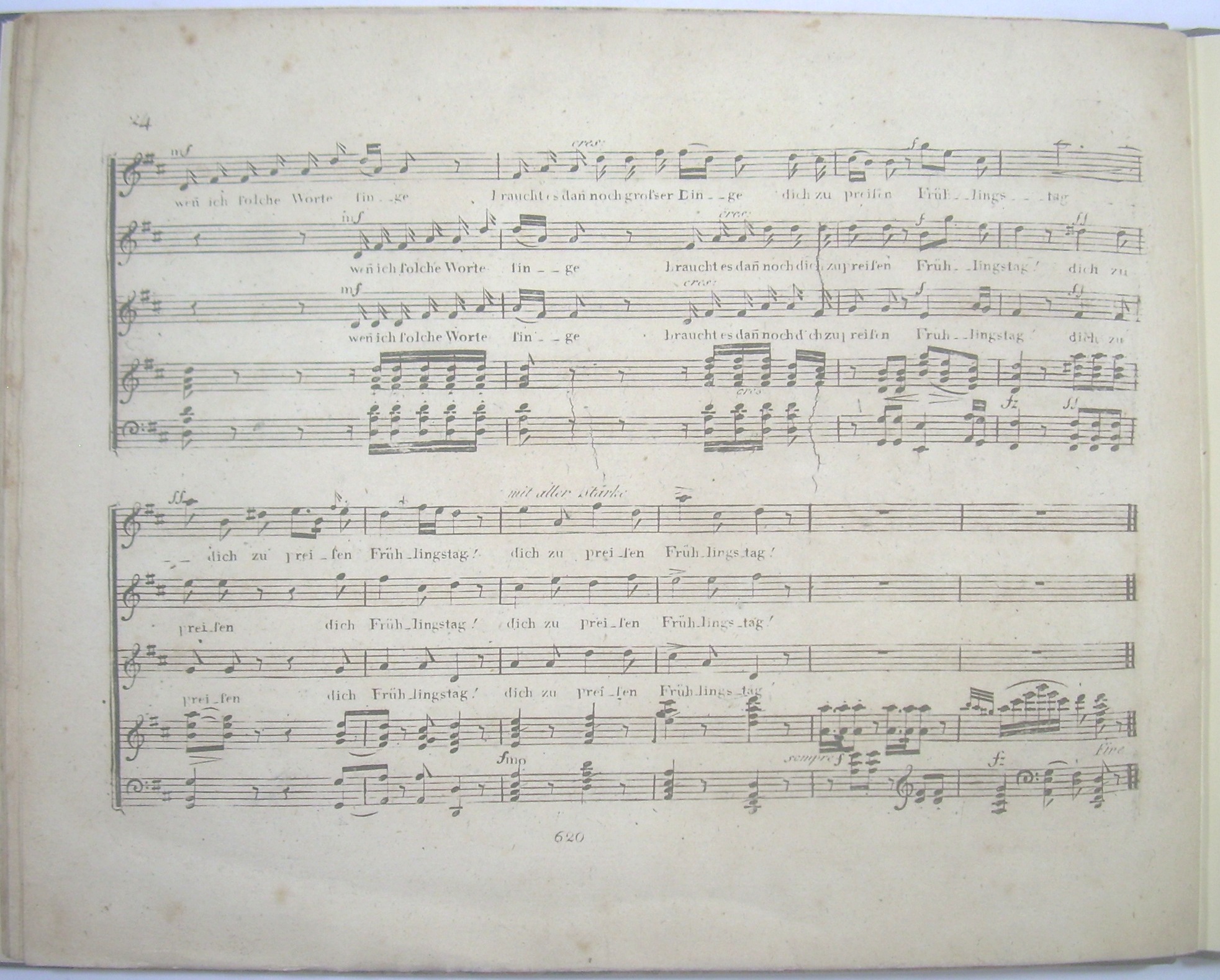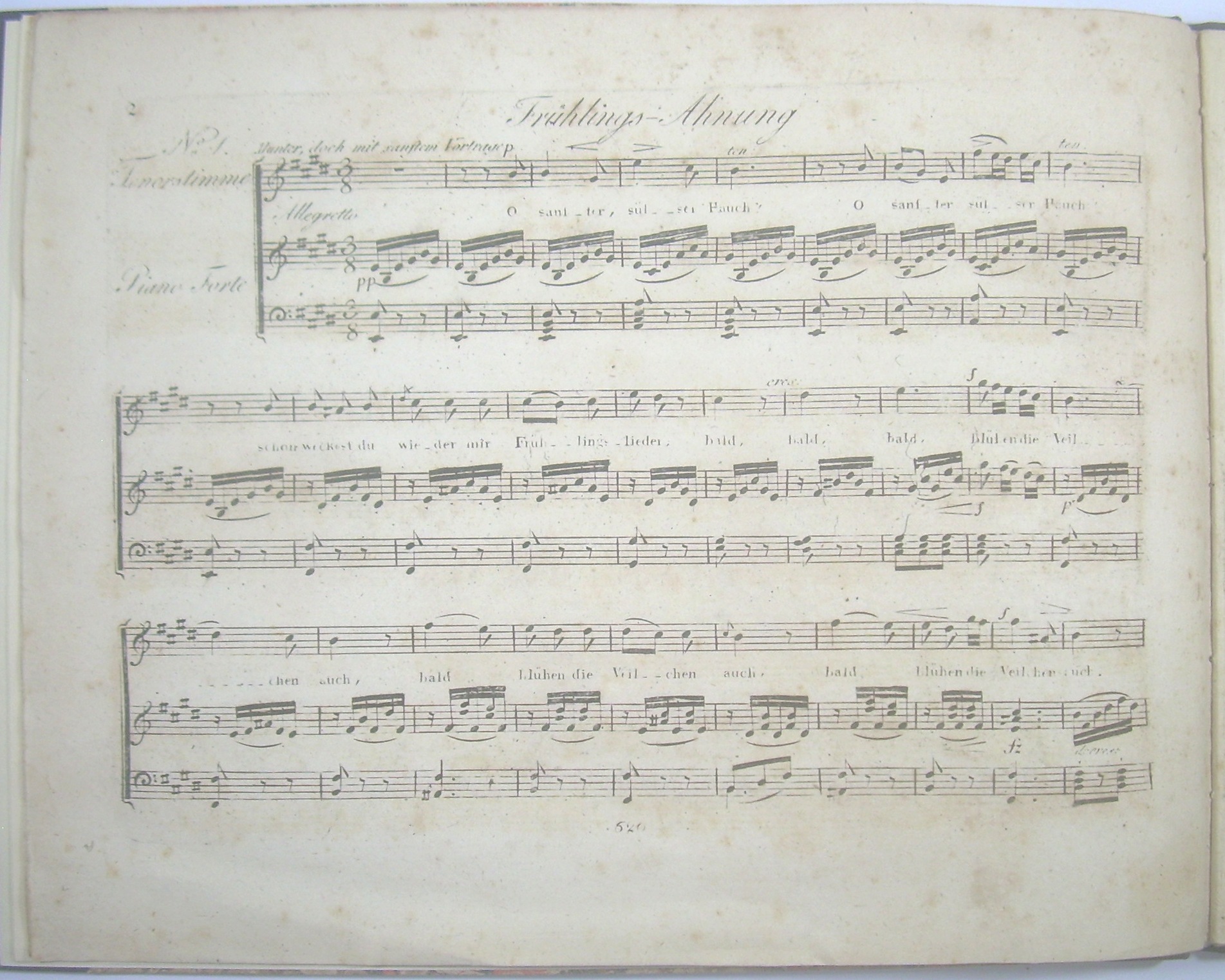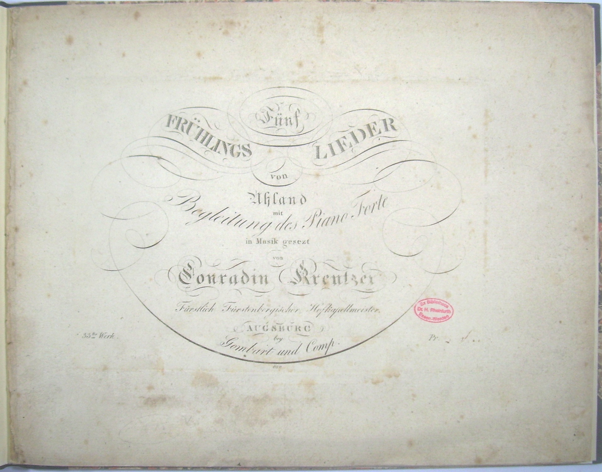 * Rheinfurth (Gombart) Nr. 393; - Vorbemerkung: "Diese 5 Frühlingslieder können jedes einzeln für sich bestehend alle ein, oder mit abwechselnden Stimmen, so wie vorgeschrieben ist, gesungen werden. Nr 2 eignet sich am besten für eine Sopran Stimme. Nr 5 wird 3stimmig gesungen von guter Wirkung seyn." - 1. Frühlings-Ahnung / 2. Frühlings-Glaube / 3. Frühlings-Ruhe / 4. Frühlings-Feier / 5. Lob des Frühlings. - Aus der Sammlung des Musikbibliographen und Gombartforschers Hans Rheinfurth (1943-2023).