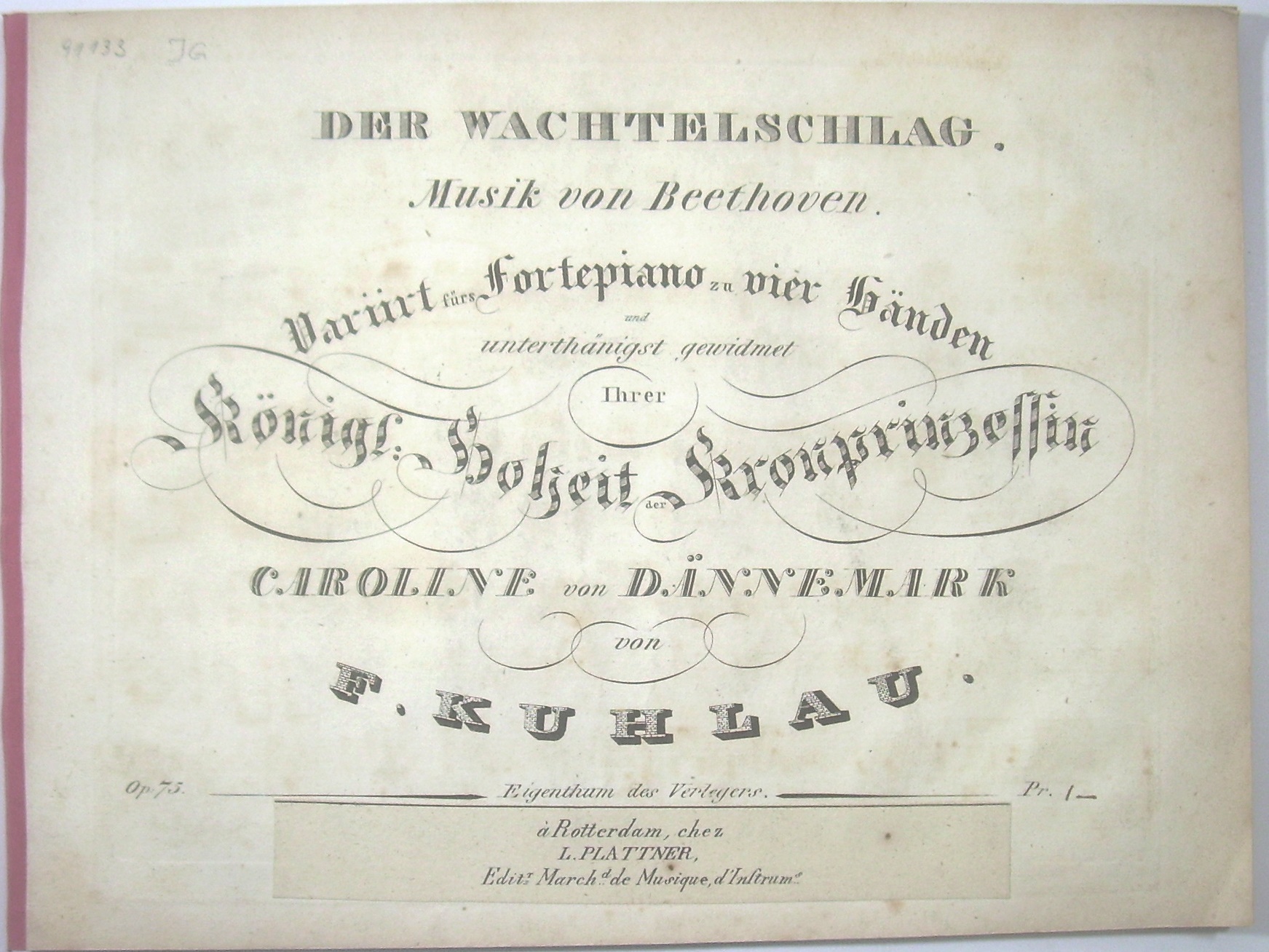 Der Wachtelschlag. Musik von Beethoven, variiert für's Fortepiano zu vier Händen, und unterthänigst gewidmet Ihrer Königl: Hoheit der Kronprinzessin Caroline v. Dännemark [!] op. 75.