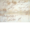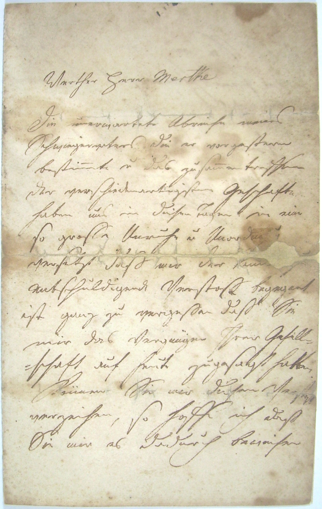 11x19 cm, 2 Seiten, Brief mit Siegelrest, fleckig, gebräunt, Fehlstellen mit geringem Buchstabenverlust, fachkundig restauriert.