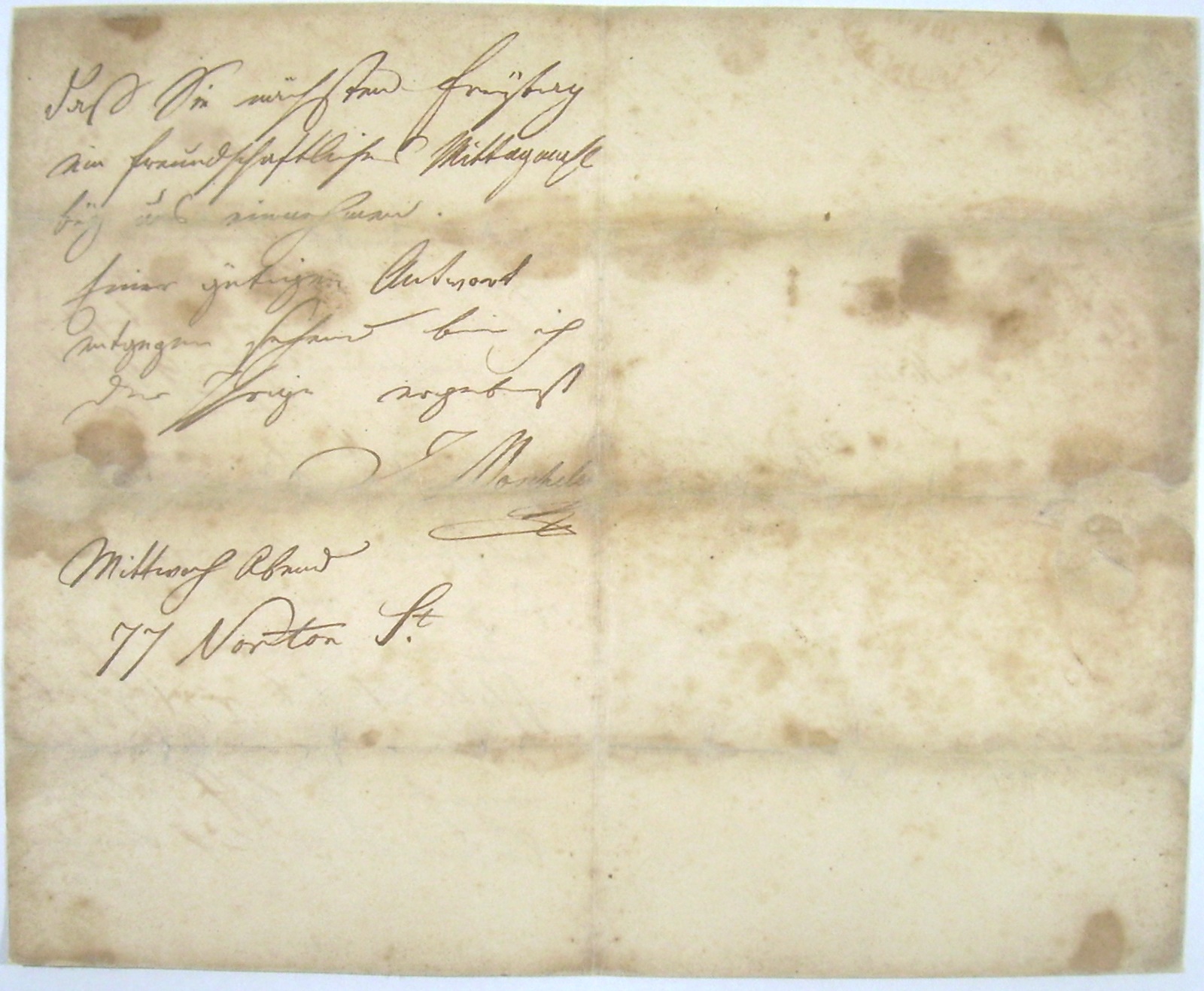 "Werther Herr Mertke Die unerwartete Abreise meines Schwiegervaters, die er vorgestern bestimmte u. das Zusammentreffen der verschiedenartigsten Geschäfte haben uns in diesen Tagen in eine so große Unruhe u. Unordnung versetzt, dass mir der kaum [zu] entschuldigende Verstoß begegnet ist ganz zu vergessen, daß Sie mir das Vergnügen Ihrer Gesellschaft auf heute zugesagt haben. Können Sie mir diesen Verstpß verzeihen, so hoffe ich, daß Sie mir es dadurch beweisen, daß Sie nächsten Freytag ein freundschaftliches Mittagmahl bey uns einnehmen. Einer gütigen Antwort entgegen sehend bin ich der Ihrige ergebenst I. Moscheles." - Ernst Wilhelm Mertke (1783-1854), Fagottvirtuose, scheint im gleichen Jahr 1826 im Sommer als Solist eines Konzerts für Fagott am Königlichen Schauspiel in Berlin auf. 1816 hatte die AmZ ihn in einer Konzertkritik aus Warschau als "durchreisender, aus Riga kommender Virtuos auf dem Fagott" gelobt: "Die ältesten Mitglieder des Orchesters erinnern sich nicht, einen besseren Fagottisten hier in Warschau gehört zu haben." (AmZ, 03.04.1816).