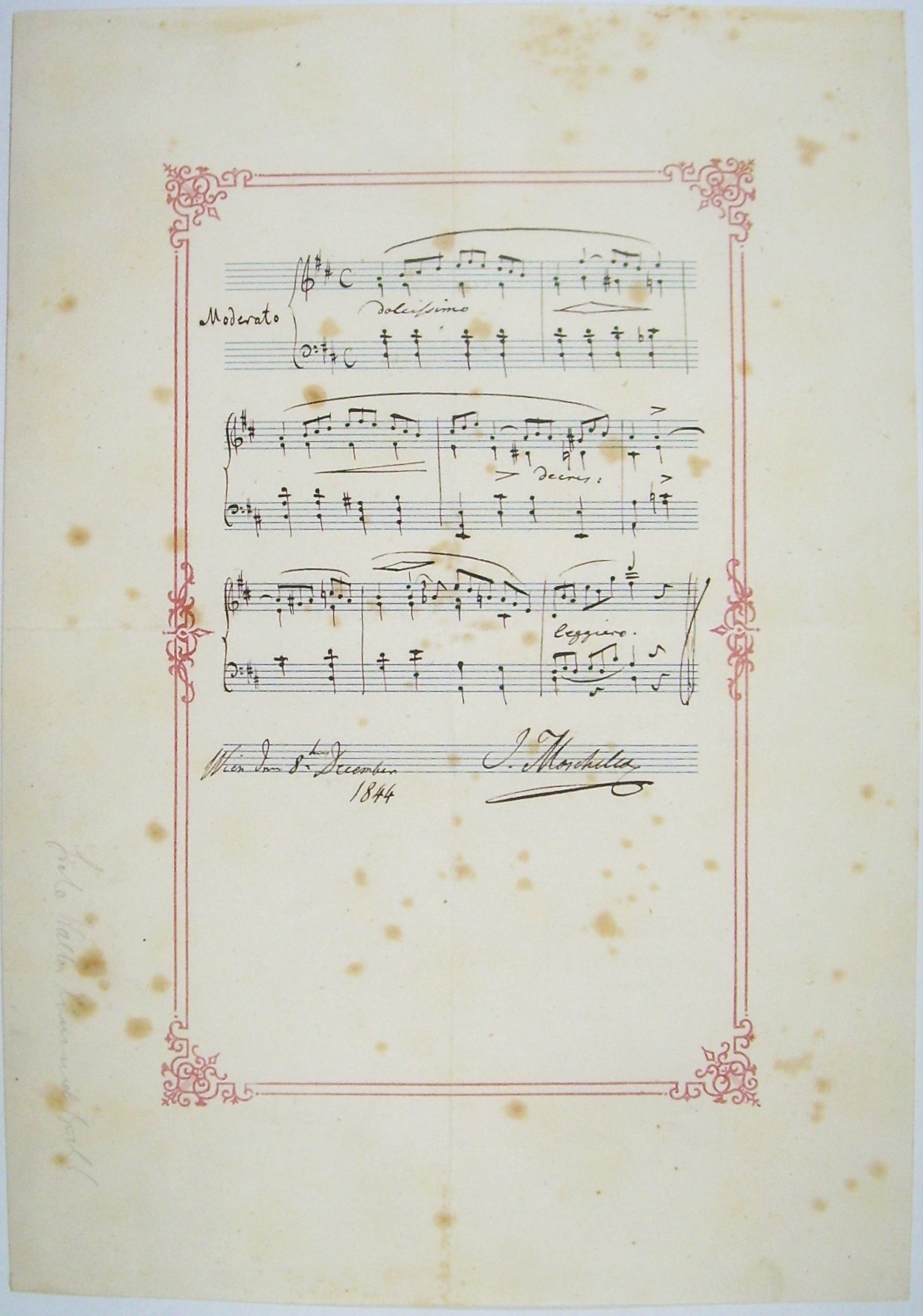 Eigenhändiges musikalisches Albumblatt mit Unterschrift, Ort und Datum, "Wien den 8ten December 1844 - I. Moscheles"