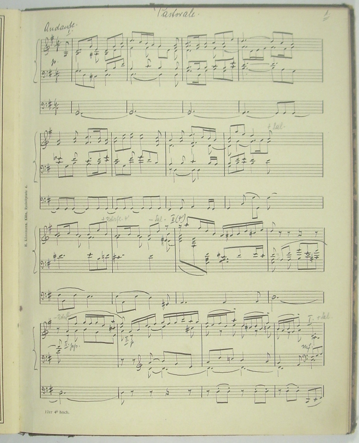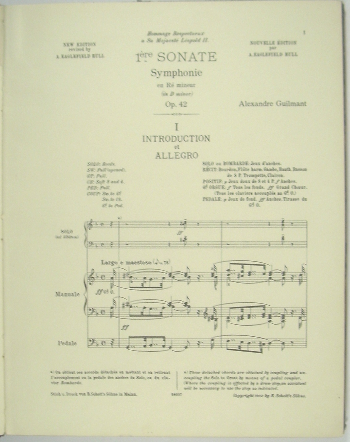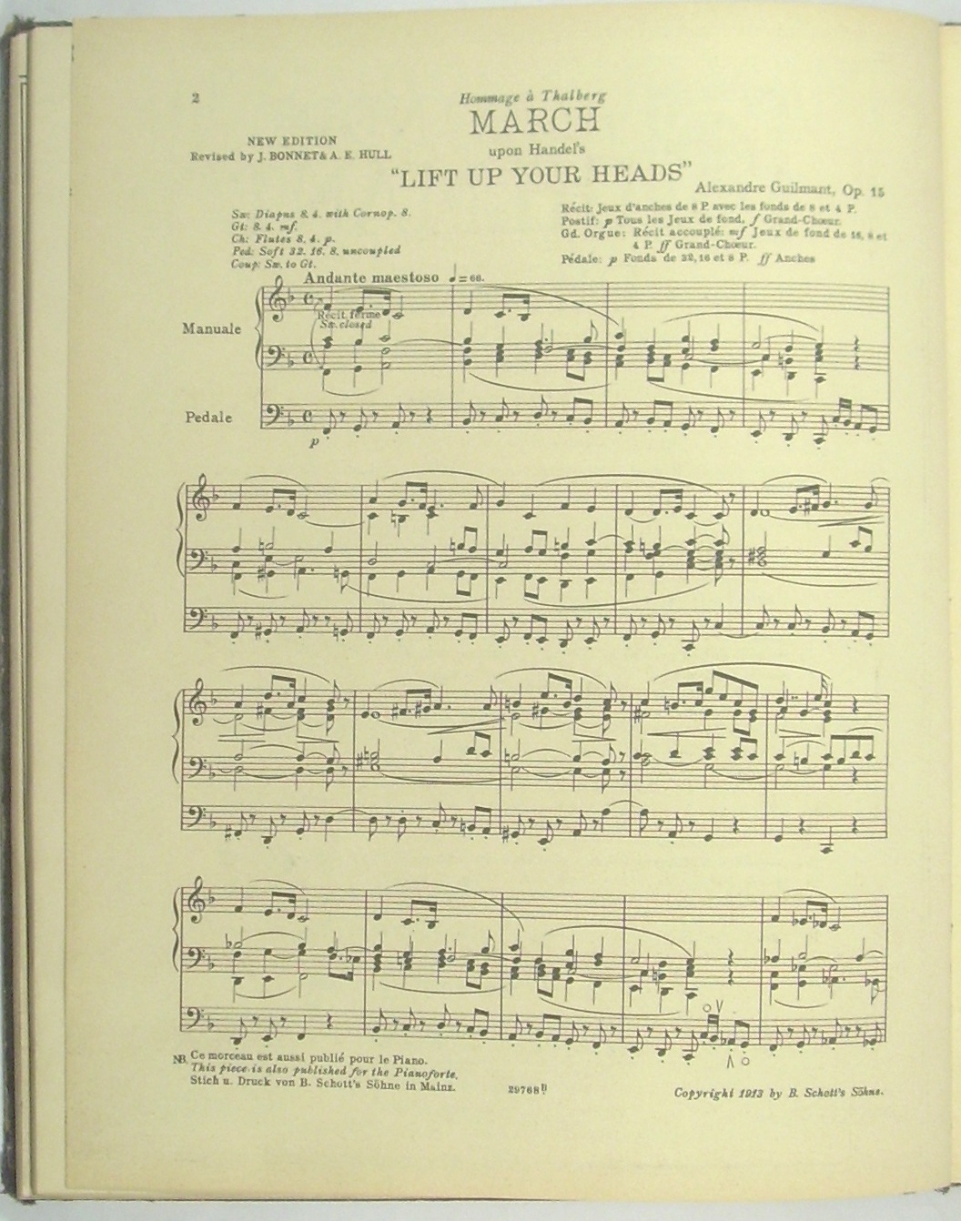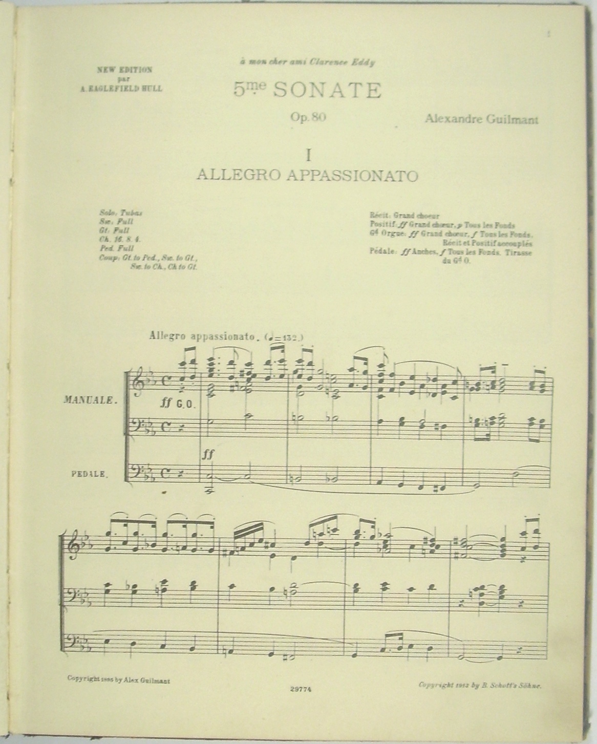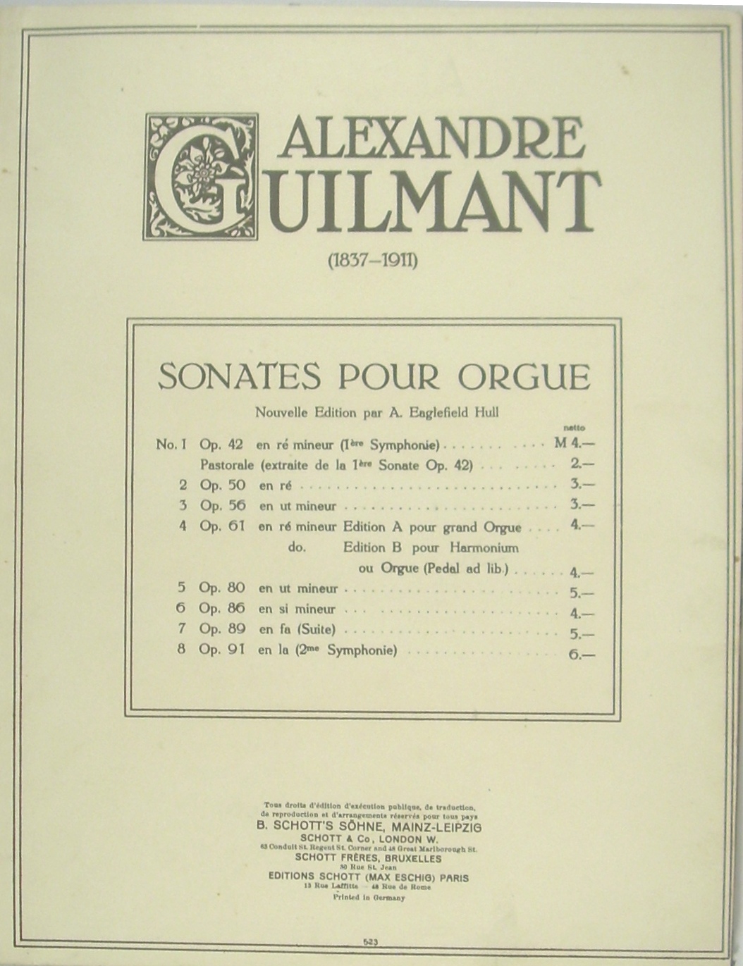 Enthält [I.] von Alexandre Guilmant: 1. Sonates pour Orgue. Nouvelle Edition par A. Eaglefield Hull. No.1, op.42, en ré mineur (1ère Symphonie). - 2: 5me Sonate op. 80. - 3: March upon Handel's "Lift up your heads", op. 15. - 4: Pastorale op.26. - 5: Pieces op. 17 Prière, Deux Amen, Marche funèbre et Chant Séraphique, Mélodie, Antienne. - [II.] Manuskript (Hermann Werner ?) 1: Pastorale (24.IV.1920). - 2: Suite für Orgel (29.IV.1919), 3: Allegretto pastorale (22.IV.1920) - [III:] Friedrich Lux: Fantaisie de Concert sur "O Sanctissima" op. 29. - Alexandre Guilmant wurde am Konservatorium in seiner Vaterstadt Boulogne-sur-Mer bereits mit 16 Jahren als Organist, mit 20 als Kapellmeister und Lehrer angestellt. Ab 1871 Titularorganist in La Trinité in Paris, 1896-1900 Leiter der Schola Cantorum in Paris. Durch seine Symphonie für Orgel und Orchester und die acht Orgelsonaten trug Guilmant wesentlich zur Ausbildung eines eigenständigen französisch-romantisch-sinfonischen Orgelstils bei. - Friedrich Lux, Organist, Dirgent und Musikdirektor in Mainz, galt als einer der bedeutendsten Orgelvirtuosen im südwestdeutschen Raum. - Hermann Werner, Organist in Köln, u.a. beteiligt an der Aufnahme des Te Deum von Walter Braunfels unter Günter Wand (1952).