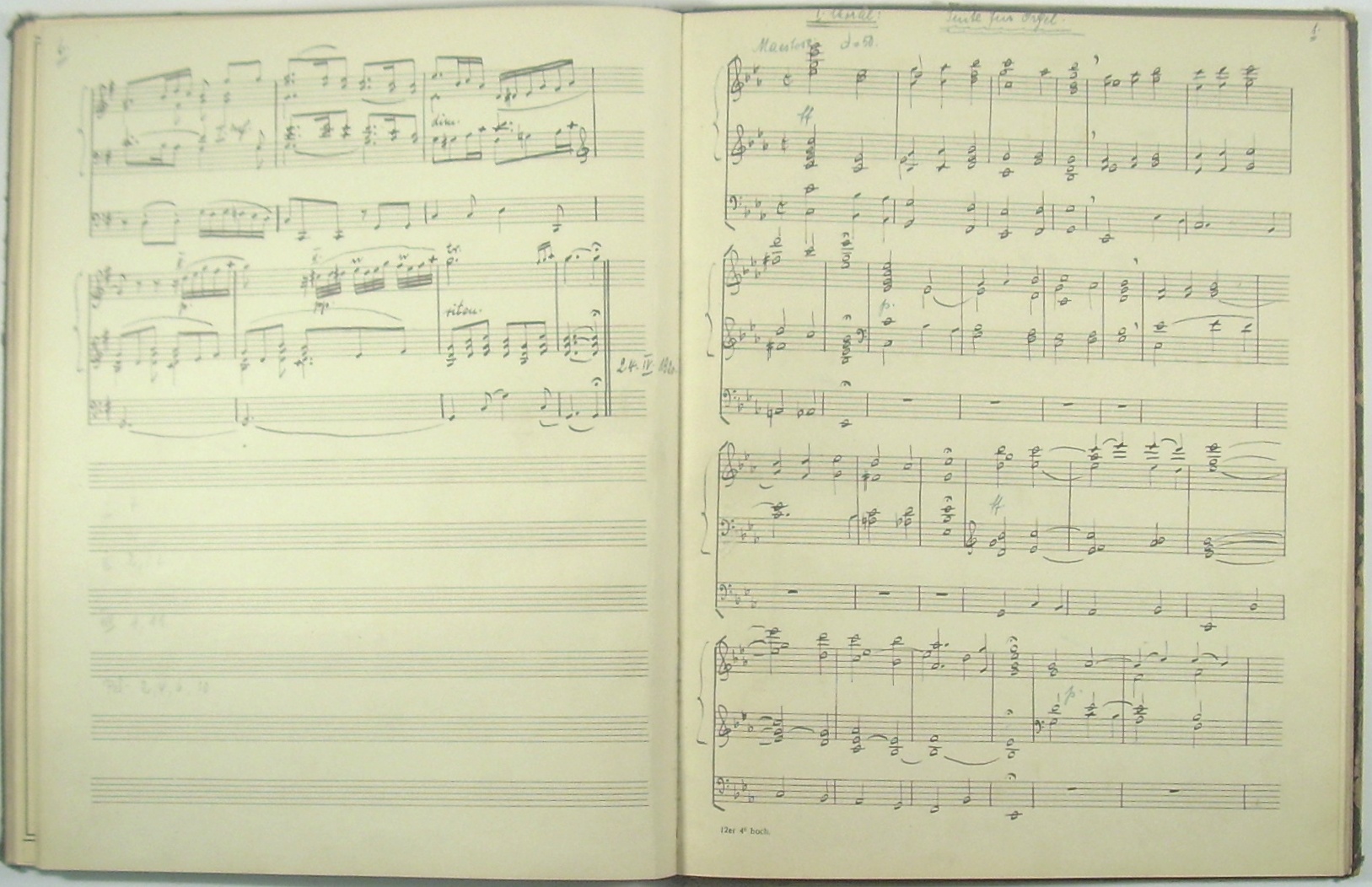 Orgel-Sammelband von ca. 1920 aus dem Vorbesitz des Kölner Organisten Hermann Werner, mit 5 Drucken von Guilmant, 3 Orgelkompositionen in Manuskript, (datiert 1919 und 1920, nicht signiert) und abschließend eine Konzertfantasie von Friedrich Lux.
