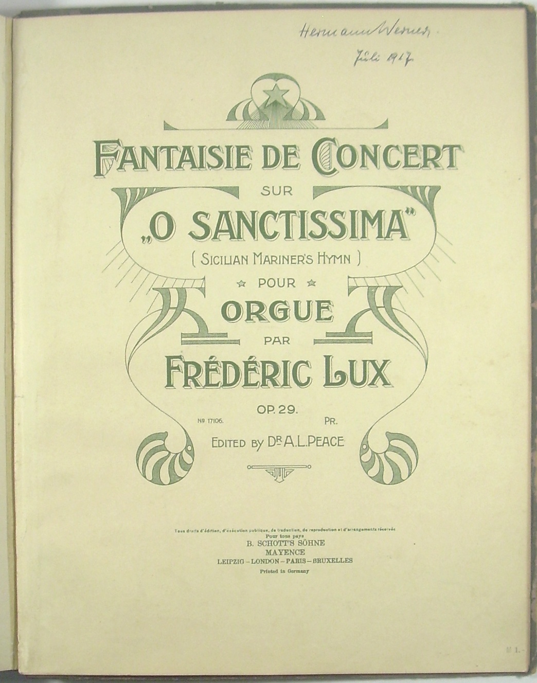 Collection of printed works for organ by Guilmant (5) and Lux (1), with 3 compositions (by Hermann Werner ?) in manuscript (autograph?), dated 1919 and 1920. Former owner / writer / composer Hermann Werner.
