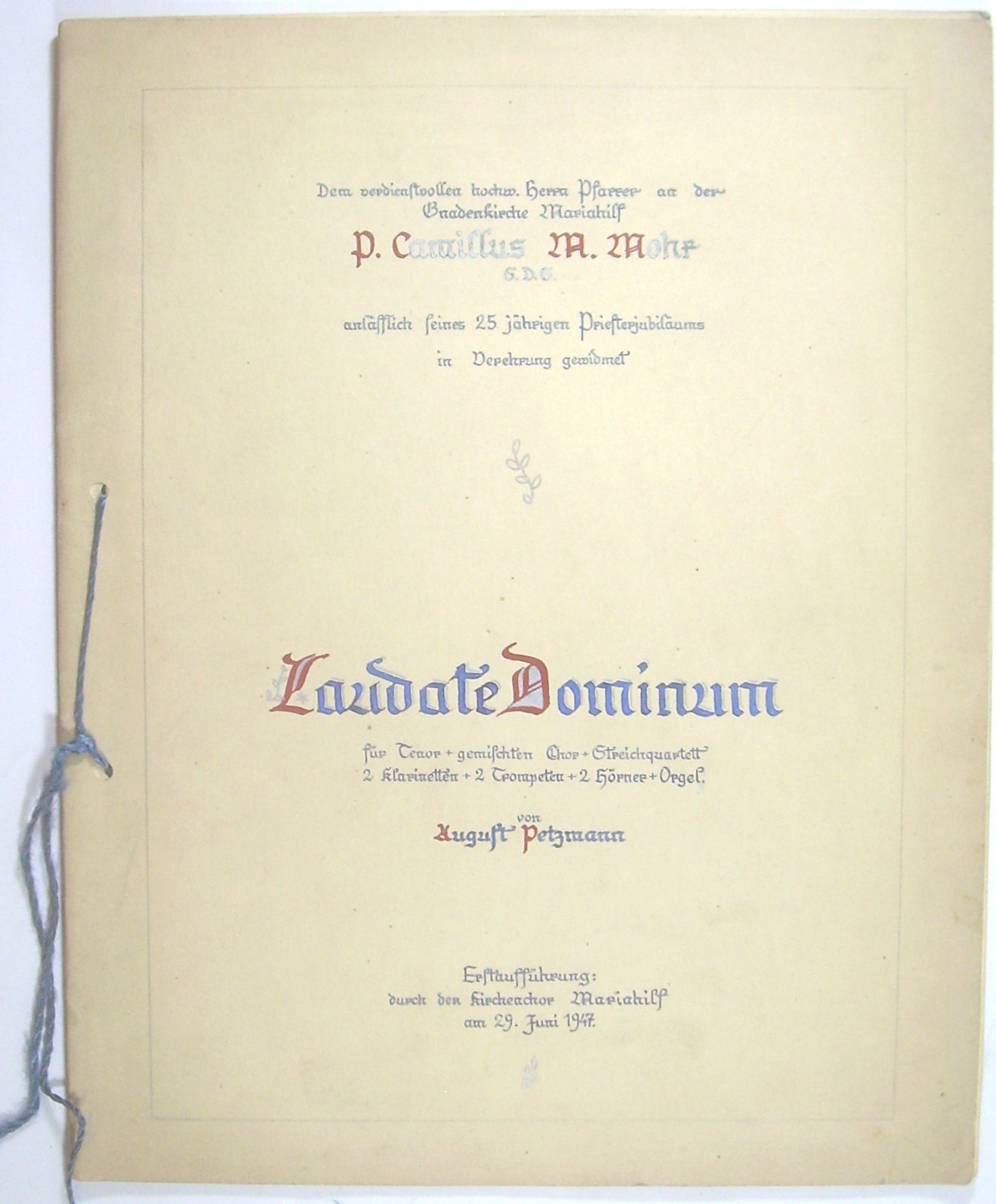 34x27 cm, Manuskript mit kalligraphiertem mehrfarbigem Umschlag, 1 Blatt mit den Unterschriften des Mariahilfer Kirchenchores, 12 Seiten Musikmanuskript (Reinschrift), zum Schluss signiert und datiert vom Komponisten "A.P. 29.6.47". Kordelbindung.