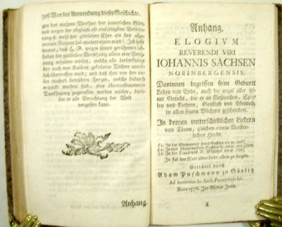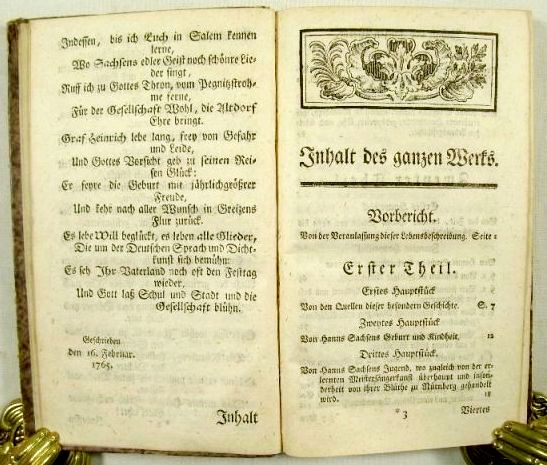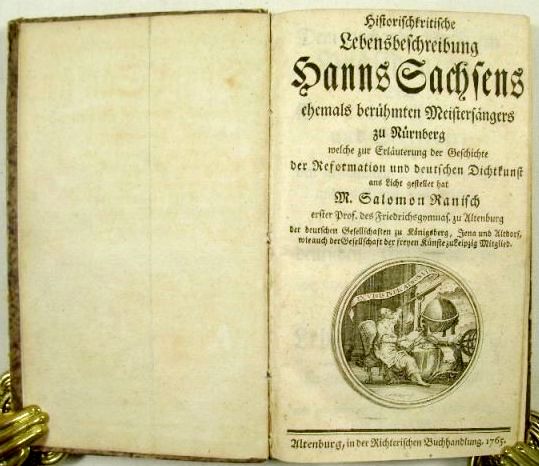 "Die erste historisch-kritische, sehr achtungs- und noch heute beachtenswerthe Lebensbeschreibung des Dichters lieferte 1765 M. Salomon Ranisch, erster Professor des Friedrichsgymnasiums zu Altenburg. Ein eigenthümlicher Zufall war es, daß er sich zu der Arbeit gerade durch das Lied: "Warum betrübst du dich, mein Herz" hatte begeistern lassen. Dies wurde lange Zeit Hans Sachs zugeschrieben und stand in den Gesangbüchern mit seinem Namen. Goedeke aber hat nachgewiesen, daß das Lied nicht von Sachs verfaßt worden ist." (ADB) - Dem im ADB-Artikel erwähnten Lied widmet Ranisch das ganze 4. Hauptstück des 2. Teils, mit Abdruck von 7 Übersetzungen (3 verschiedenen lateinischen und jeweils einer griechischen, französischen, niedersächsischen und holländischen). - Neben Biographie und Werk geht Ranisch auch auf die Rezeptionsgeschichte von Hans Sachs ein (7. und 8. Hauptstück: "Von seinen Verehrern", "Von seinen Verächtern") mit interessanten literaturgeschichtlichen Einblicken.