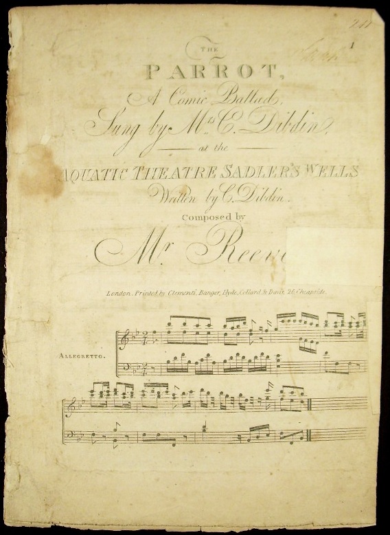 The Parrot. A Comic Ballad. Sung by Mr. C. Dibdin at the Aquatic Theatre Sadler's Wells