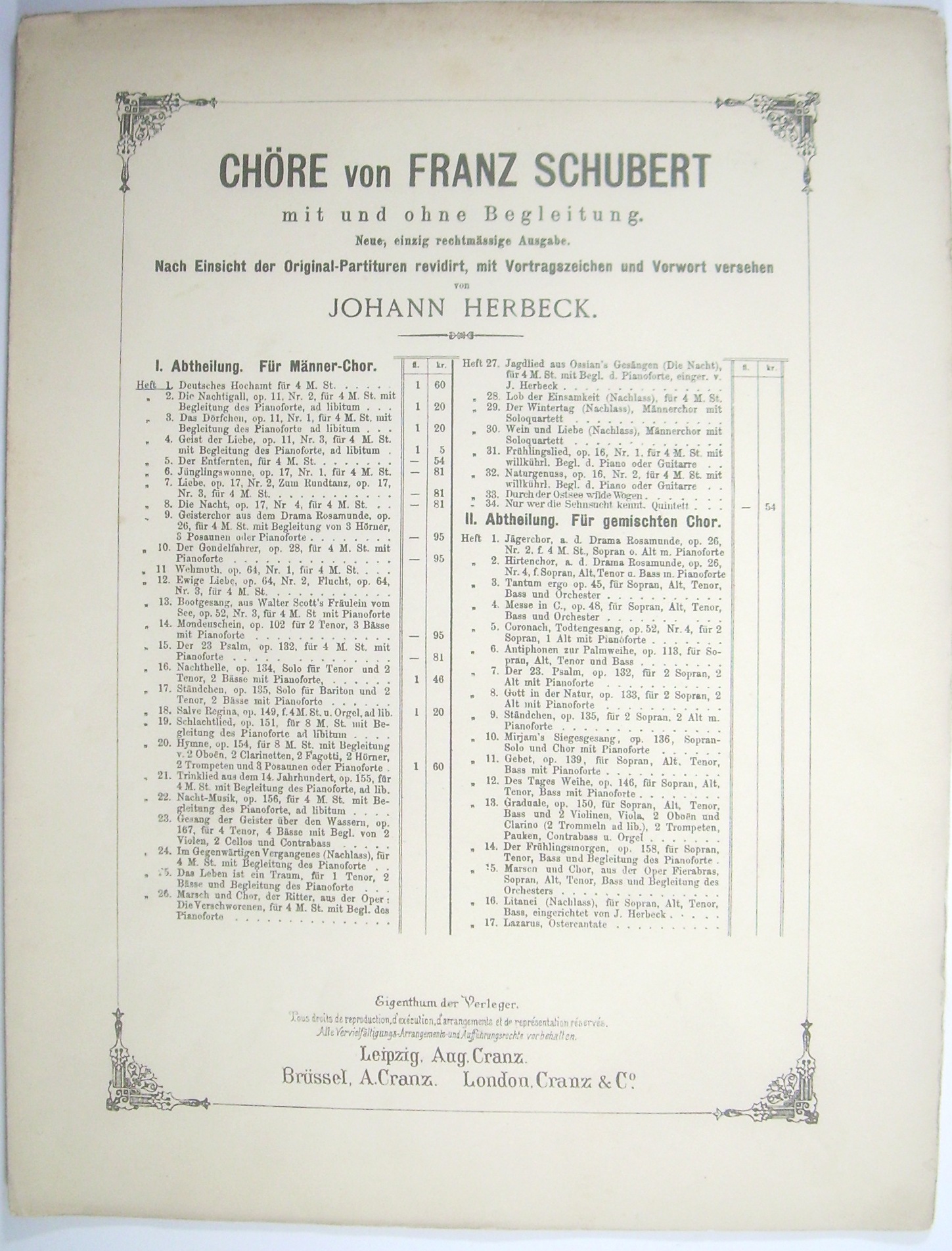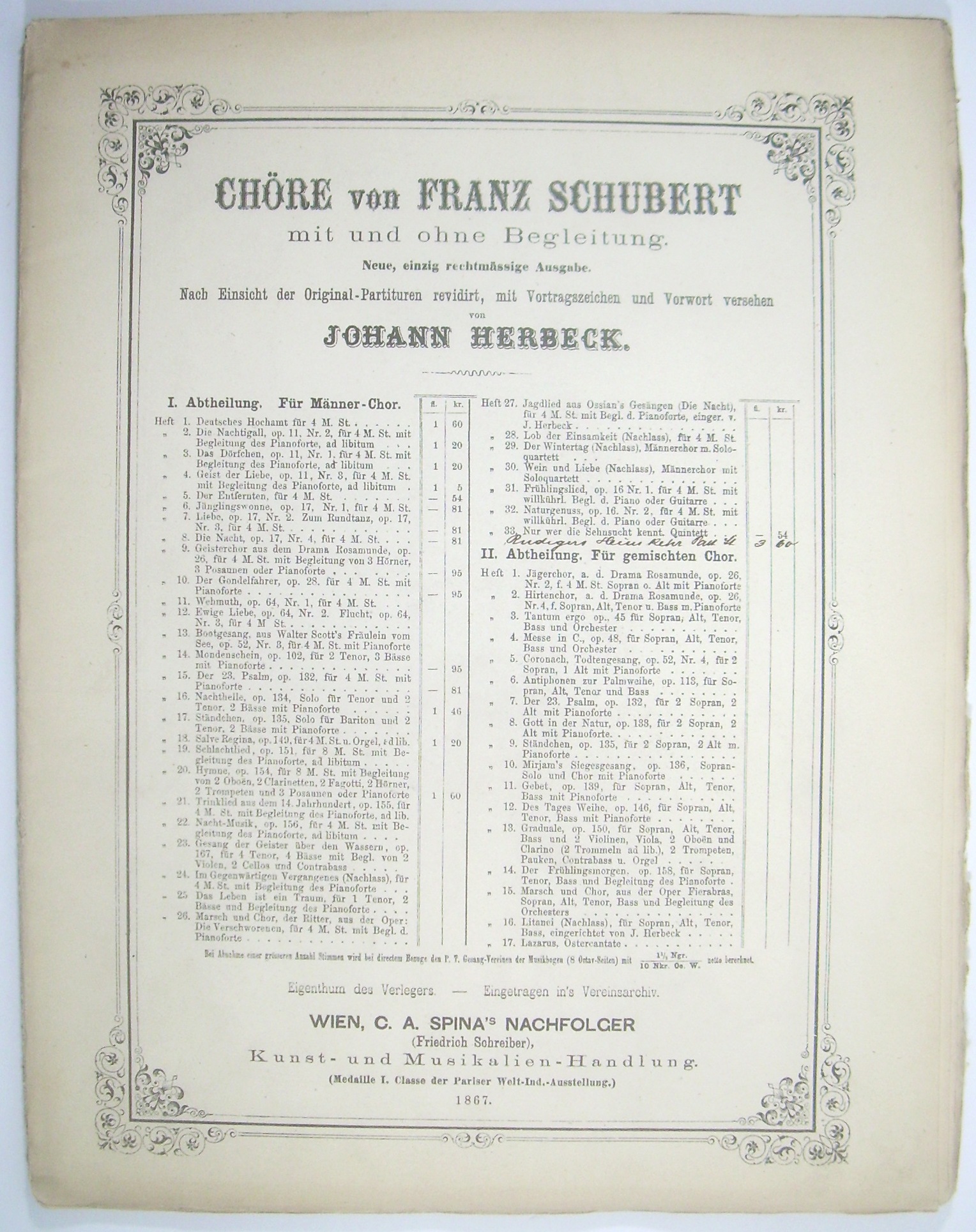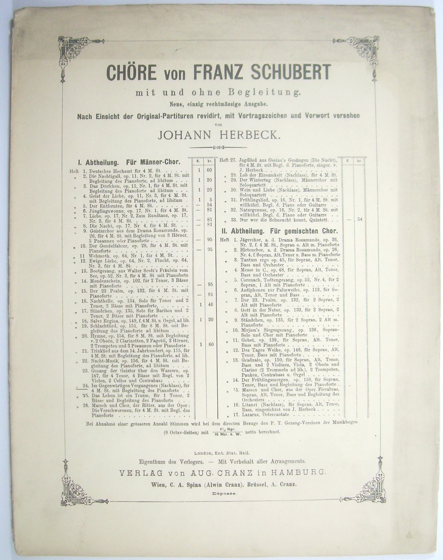[D 791.] Rüdigers Heimkehr. Nach einer Partitur-Skizze von Franz Schubert (aus dem Jahre 1823) ausgeführt von Johann Herbeck. [Partitur, ERSTAUSGABE] = Chöre von Franz Schubert mit und ohne Begleitung. Neue, einzig rechtmässige Ausgabe. Nach Einsicht der Original-Partituren revidirt, mit Vortragszeichen und Vorwort versehen von Johann Herbeck. I. Abteilung: Für Männer-Chor. Handschriftlicher Titeleintrag nach der gedruckten Titelliste. - Beiliegen die Hefte 1, 20 und 24 der Reihe in Titelauflagen (Cranz).