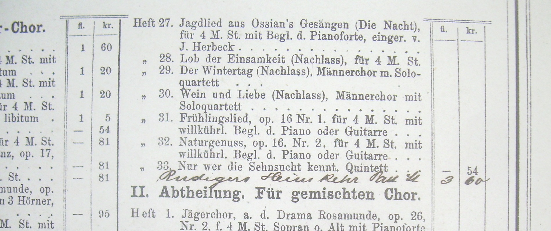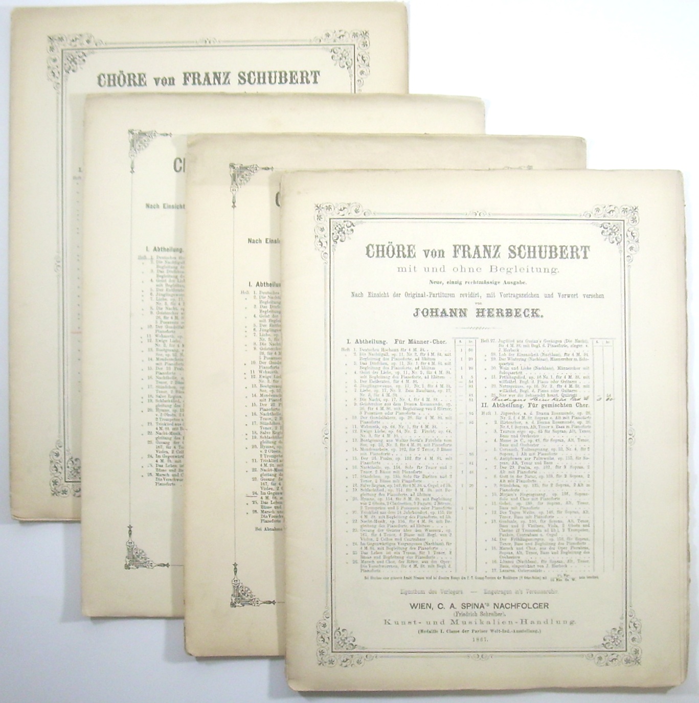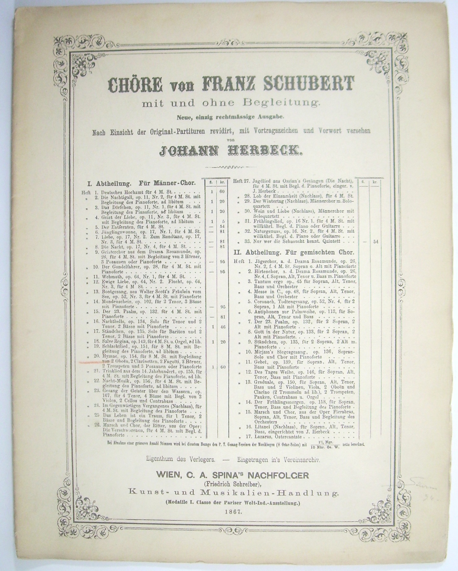 [D 791.] Rüdigers Heimkehr. Nach einer Partitur-Skizze von Franz Schubert (aus dem Jahre 1823) ausgeführt von Johann Herbeck. [Partitur, ERSTAUSGABE] = Chöre von Franz Schubert mit und ohne Begleitung. Neue, einzig rechtmässige Ausgabe. Nach Einsicht der Original-Partituren revidirt, mit Vortragszeichen und Vorwort versehen von Johann Herbeck. I. Abteilung: Für Männer-Chor. Handschriftlicher Titeleintrag nach der gedruckten Titelliste. - Beiliegen die Hefte 1, 20 und 24 der Reihe in Titelauflagen (Cranz).