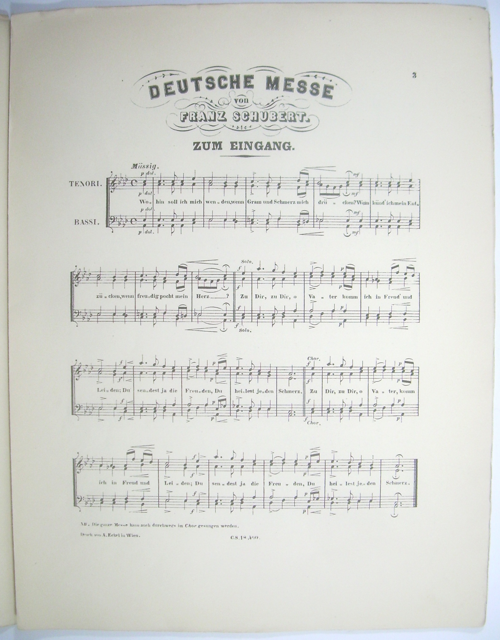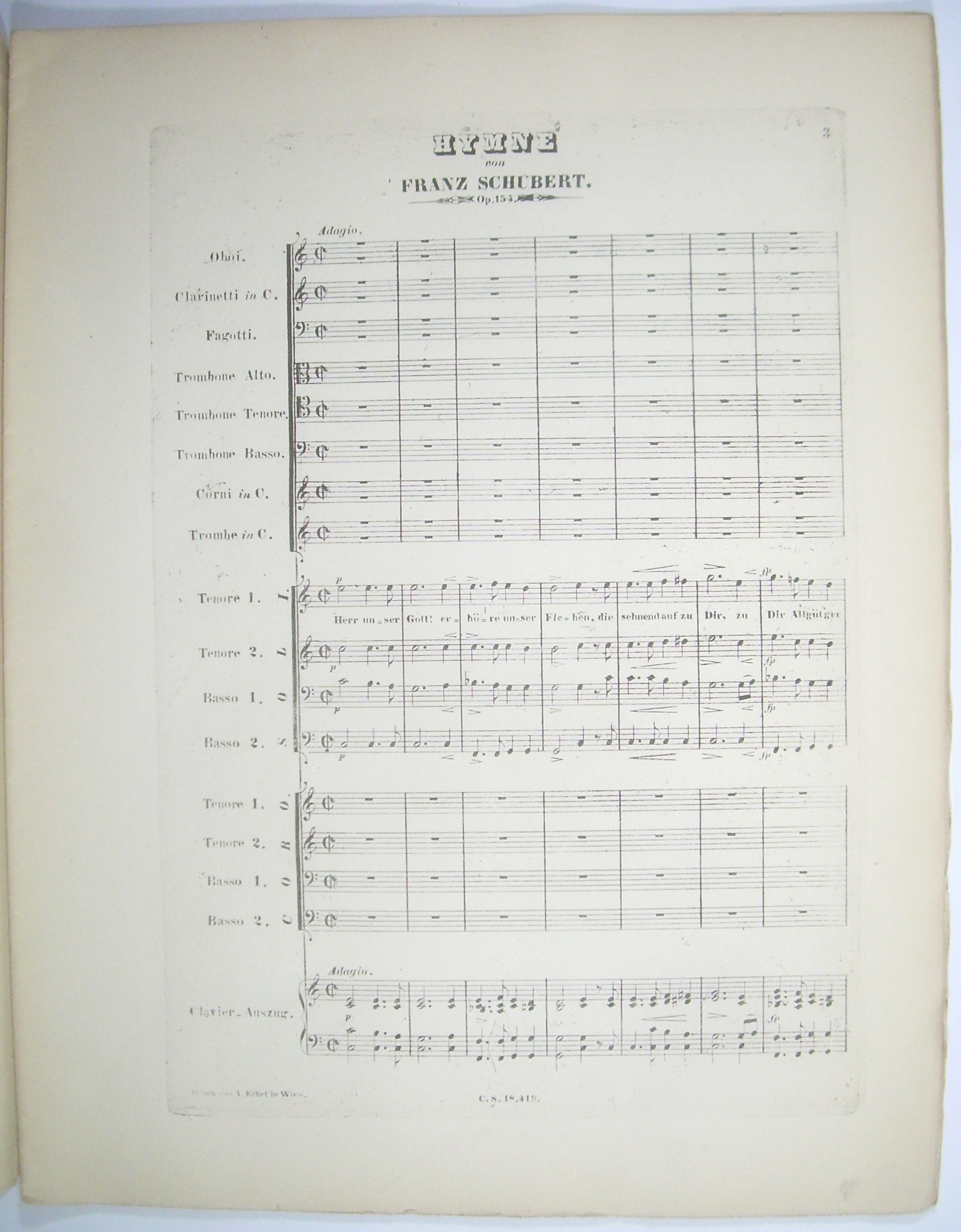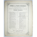 * SH.Schubert.623. Erstausgabe, sehr selten. - Schubert begann die Oper "Rüdiger" nach einem Text von Ignaz von Mosel im Mai 1823, es entstanden aber nur 2 Nummern: der vorliegende Chor, und ein ungedruckt gebliebenes Duett. Das Libretto nach Metastasio's "Ruggiero" hatte Mosel 1822 vergeblich Carl Maria von Weber zur Komposition angeboten. - Johann Herbeck (1831-1877), Hofkapellmeister in Wien und Entdecker der "Unvollendeten Symphonie" von Franz Schubert (D 795), gab in den 1860er Jahren die Reihe "Chöre von Franz Schubert mit und ohne Begleitung" heraus. Die Uraufführung des Chores "Rüdigers Heimkehr" dirigierte er am 05.01.1868 in Wien im Redoutensaal.