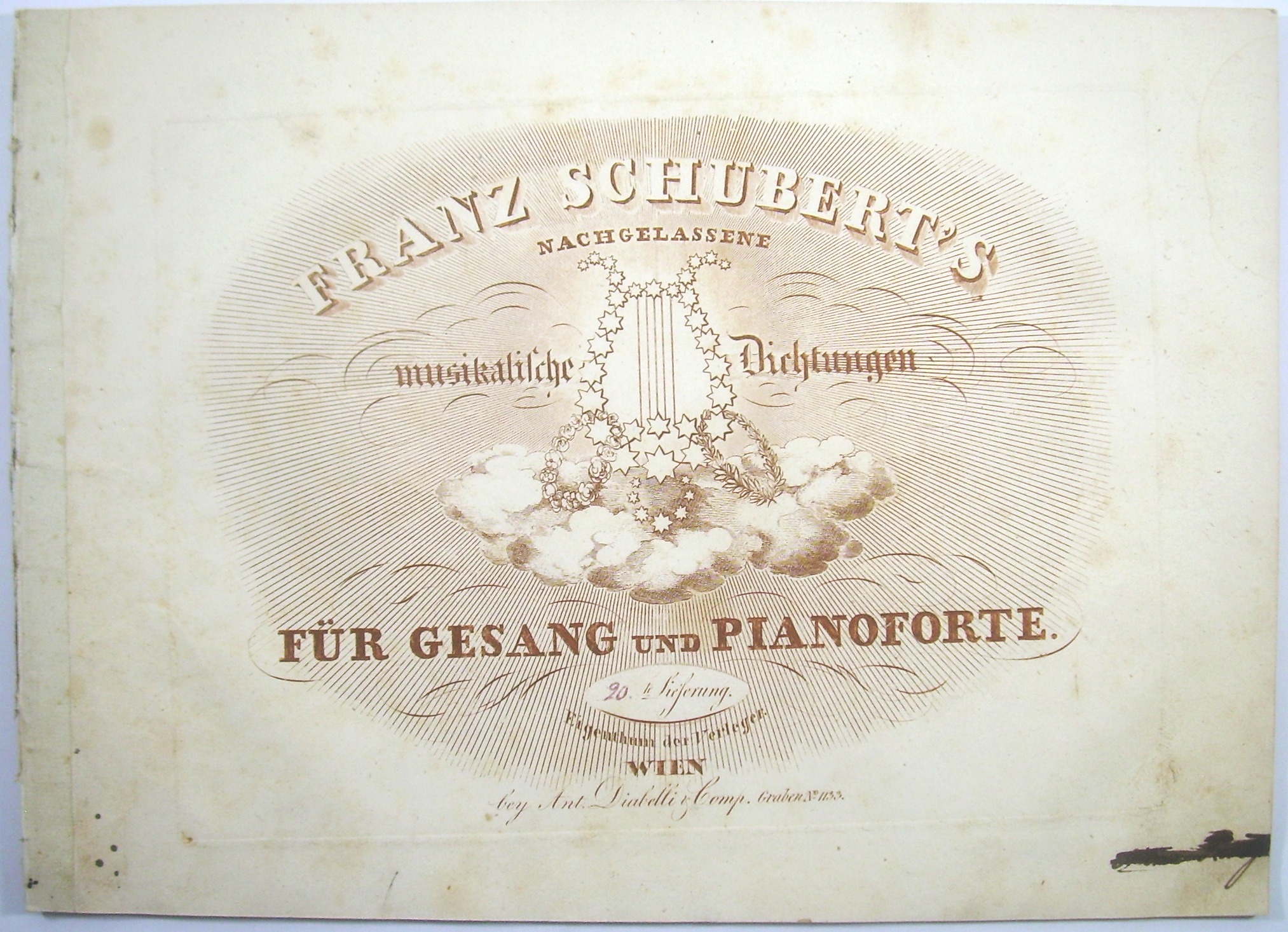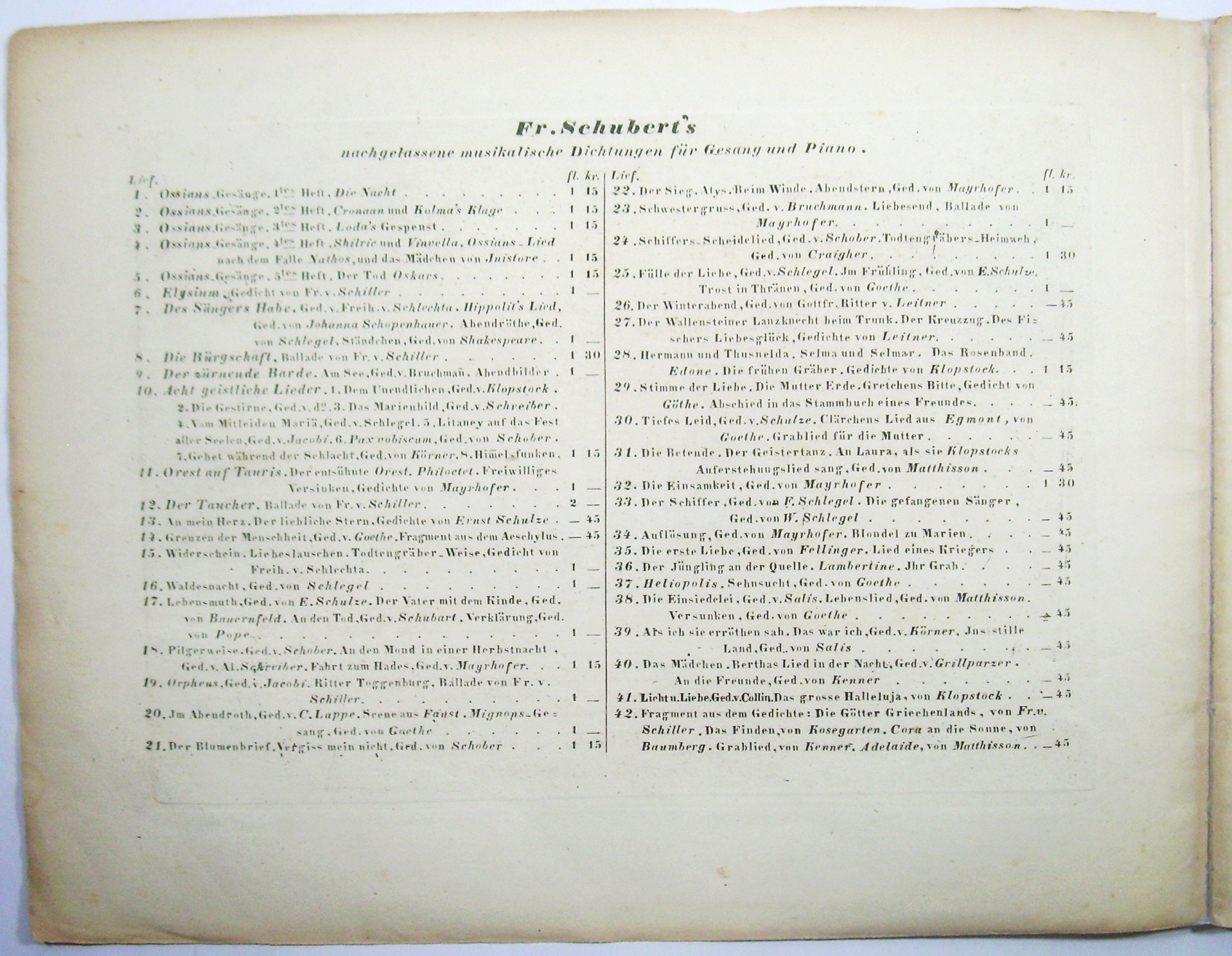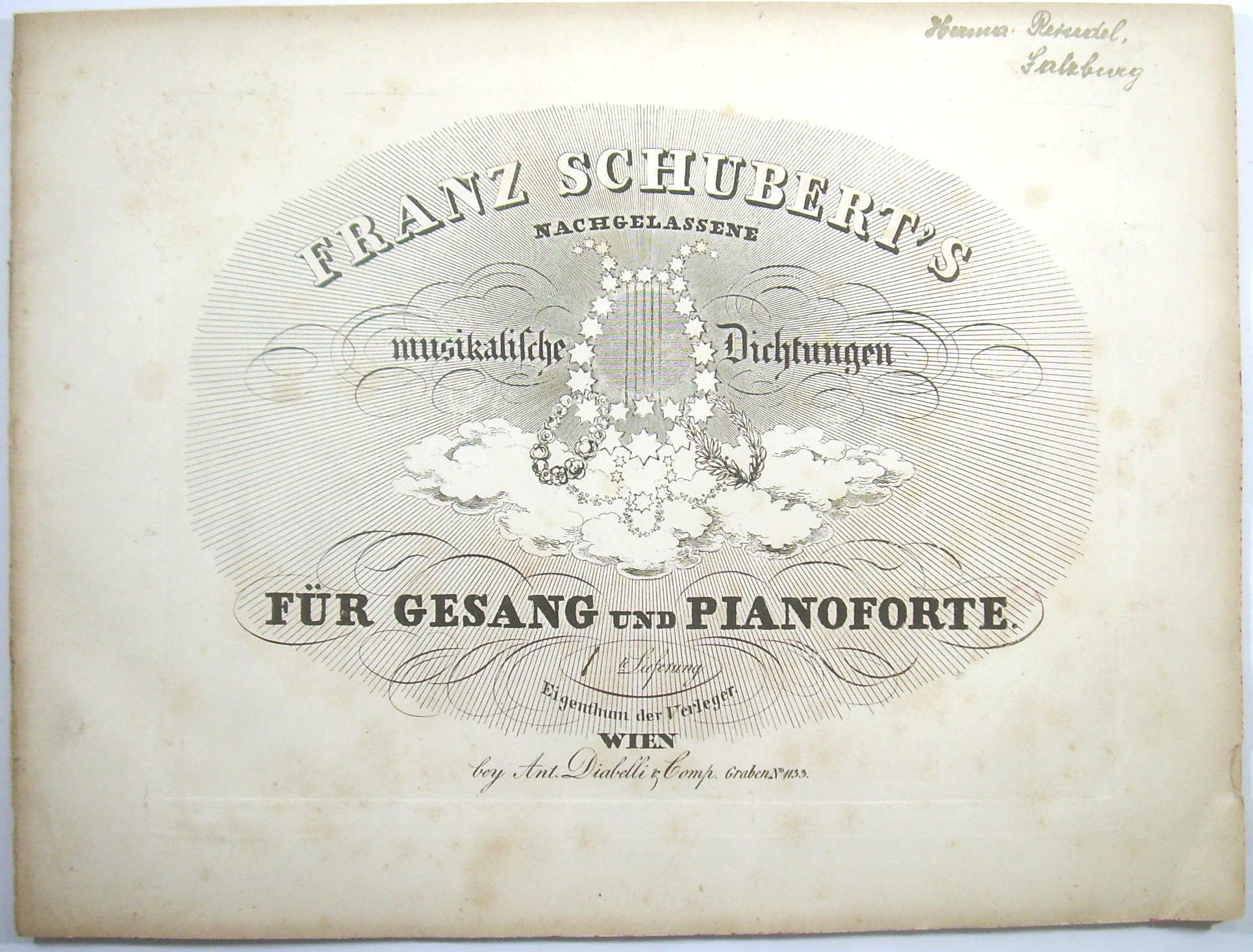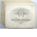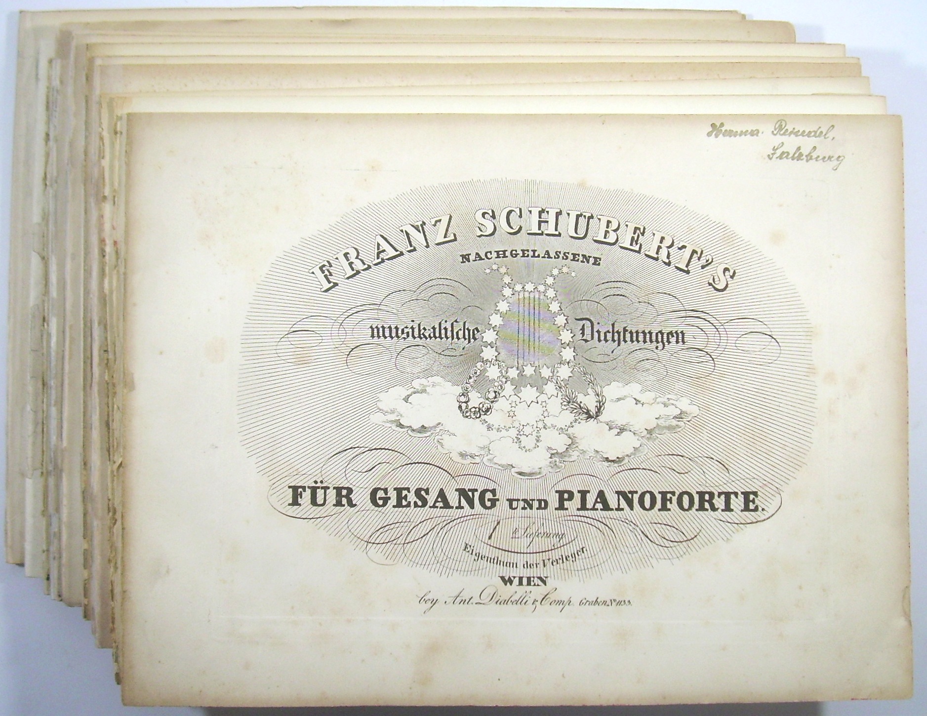 * Raab SDV II/S.640-646. - Erstdrucke Nr. 16 und 20 mit rotbraunem Originalumschlag NL 1, Titelauflagen: 1-7, 13, 30 mit schwarzem Umschlag NL 2, 19 mit rotem Umschlag NL 2, die übrigen Titel ohne Reihenumschlag, aber mit Reihentitel. - In der Reihe "Franz Schuberts nachgelassene musikalische Dichtungen für Gesang und Pianoforte" veröffentlichte Diabelli zwischen 1830 50 Hefte mit und Liedersammlungen im Erstdruck. - Enthält Ossians Gesänge (1-5), Gedichte und Balladen von Schiller: Elysium (6), Die Bürgschaft (8), Der Taucher (12), Ritter Toggenburg (19), sowie Vertonungen von Bauernfeld, Craigher, Goethe, Jacobi, Klopstock, Körner, Lappe, Pope, Schlechta, Schlegel, Schober, Schopenhauer, Schreiber, Schubart, Schulze, Shakespeare.