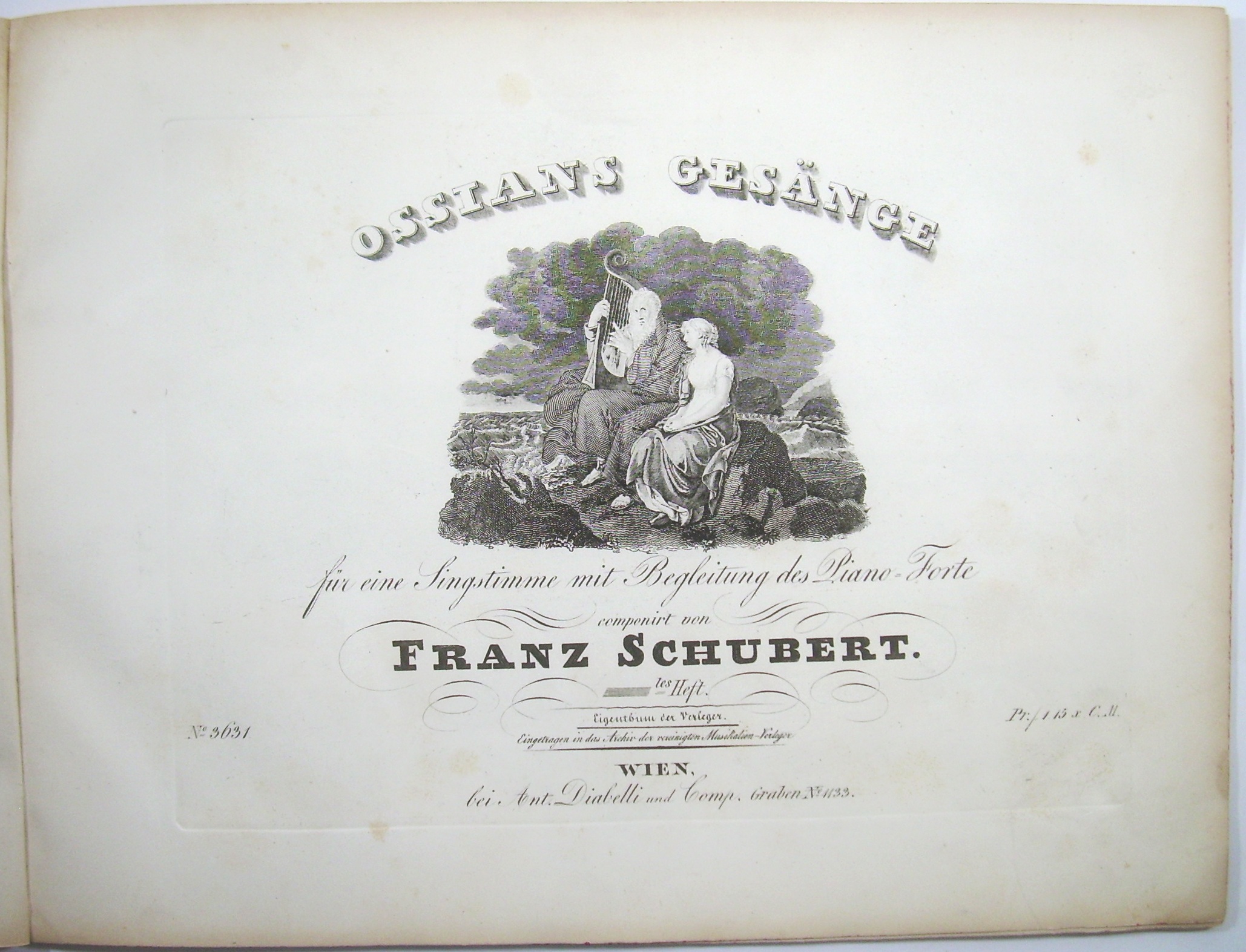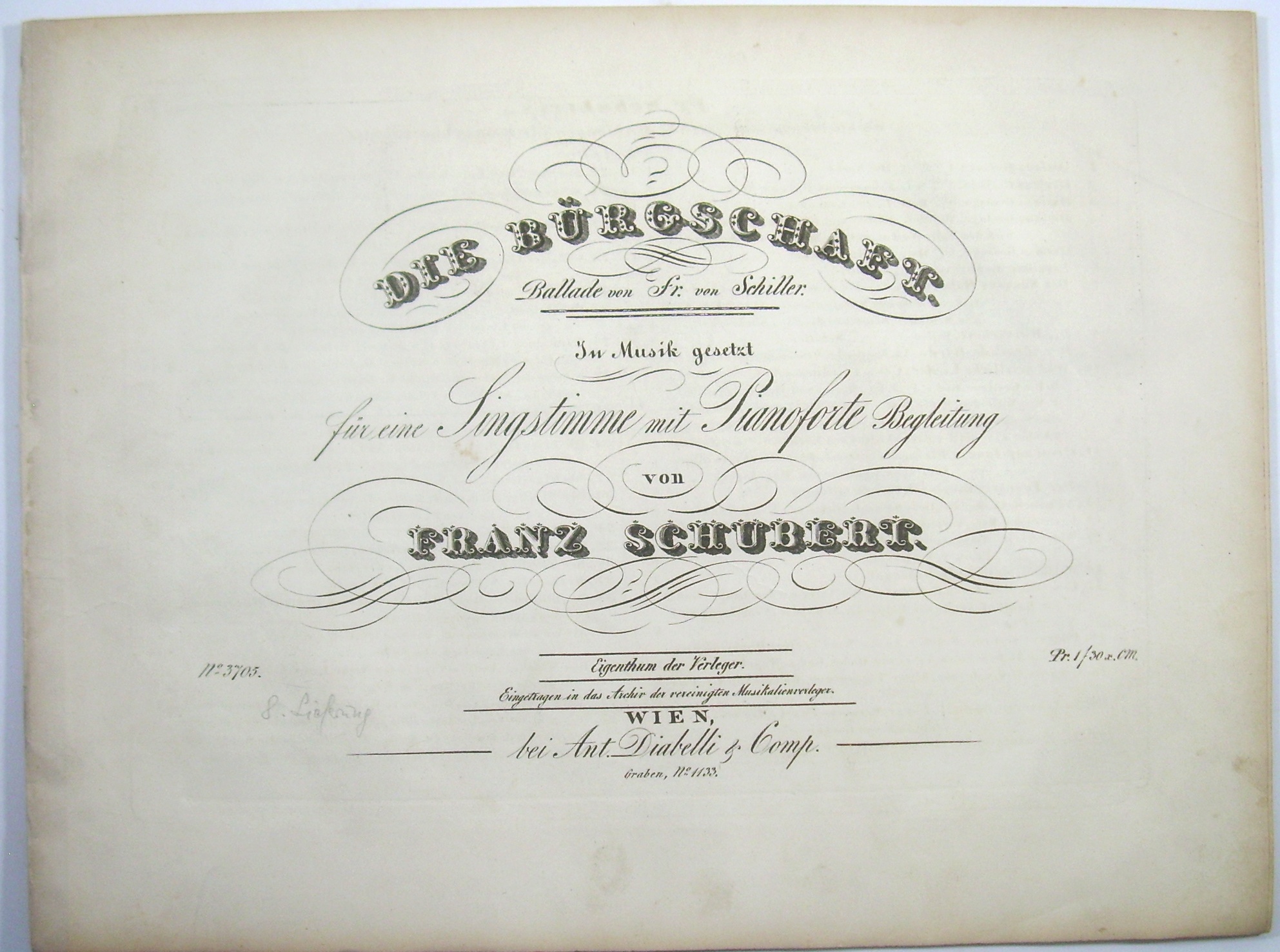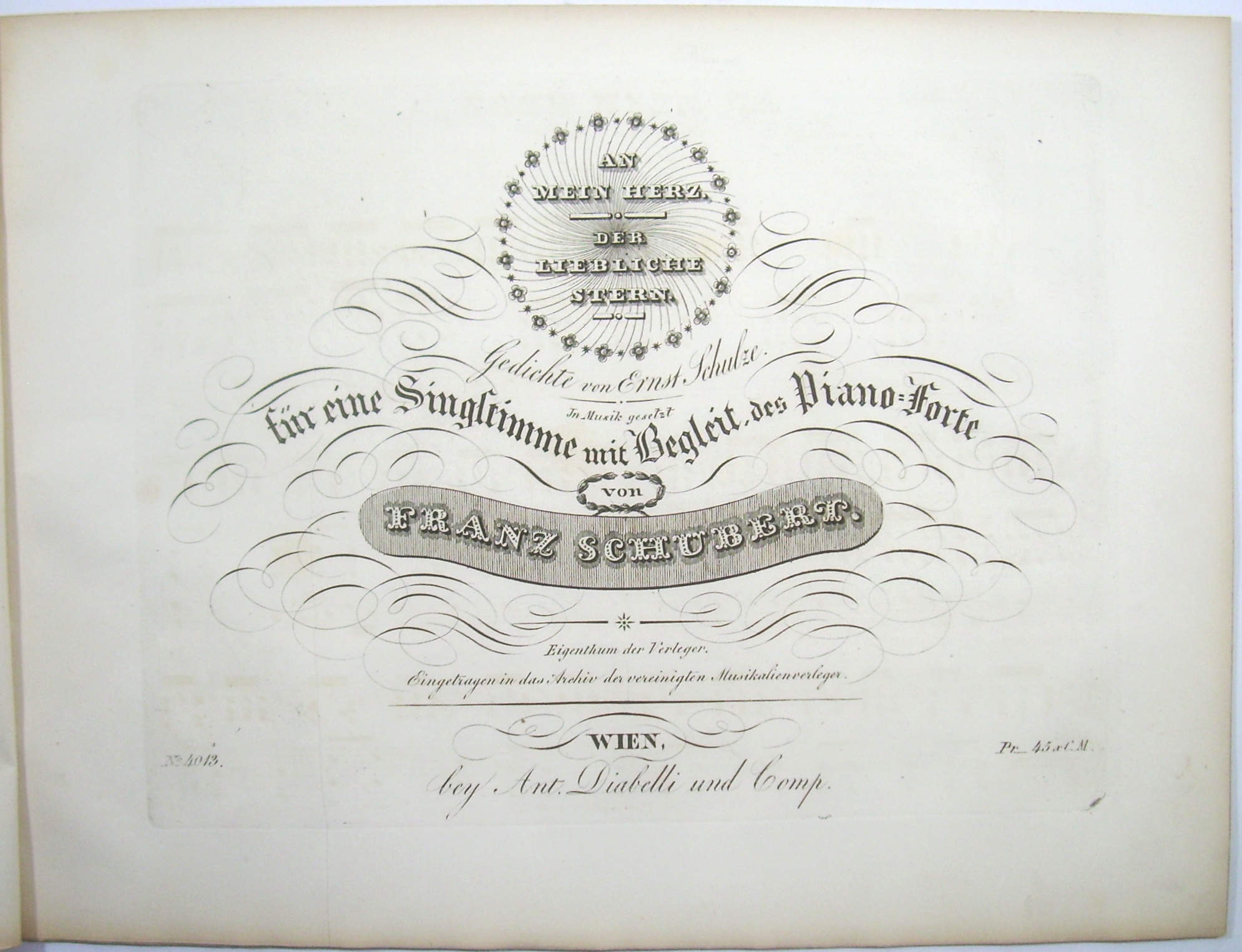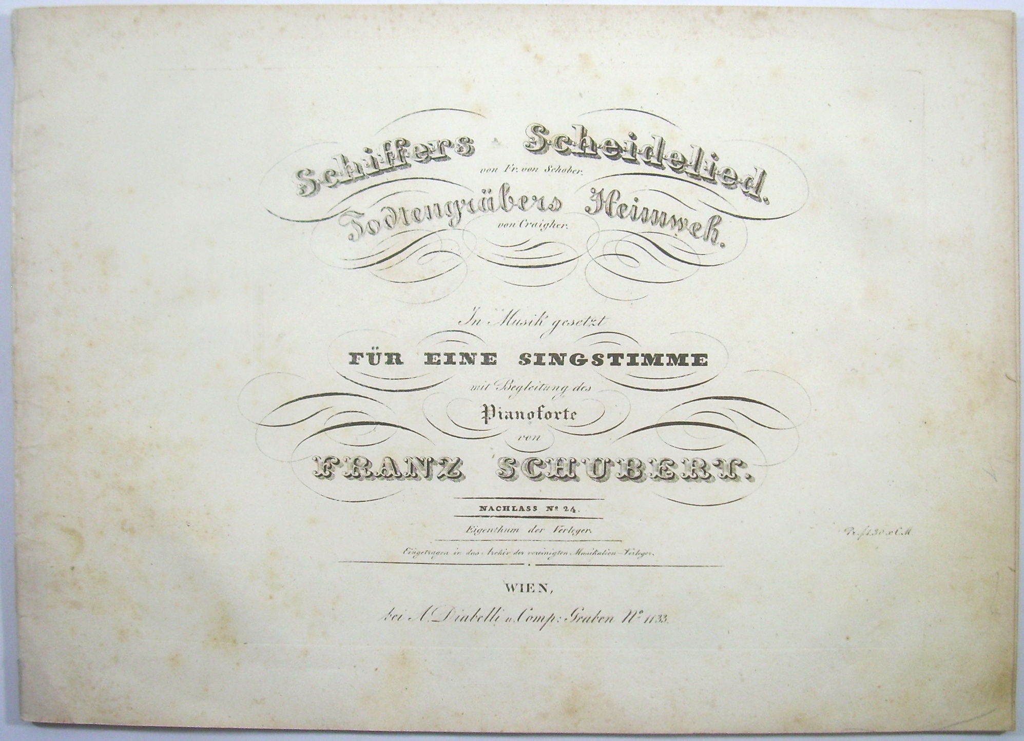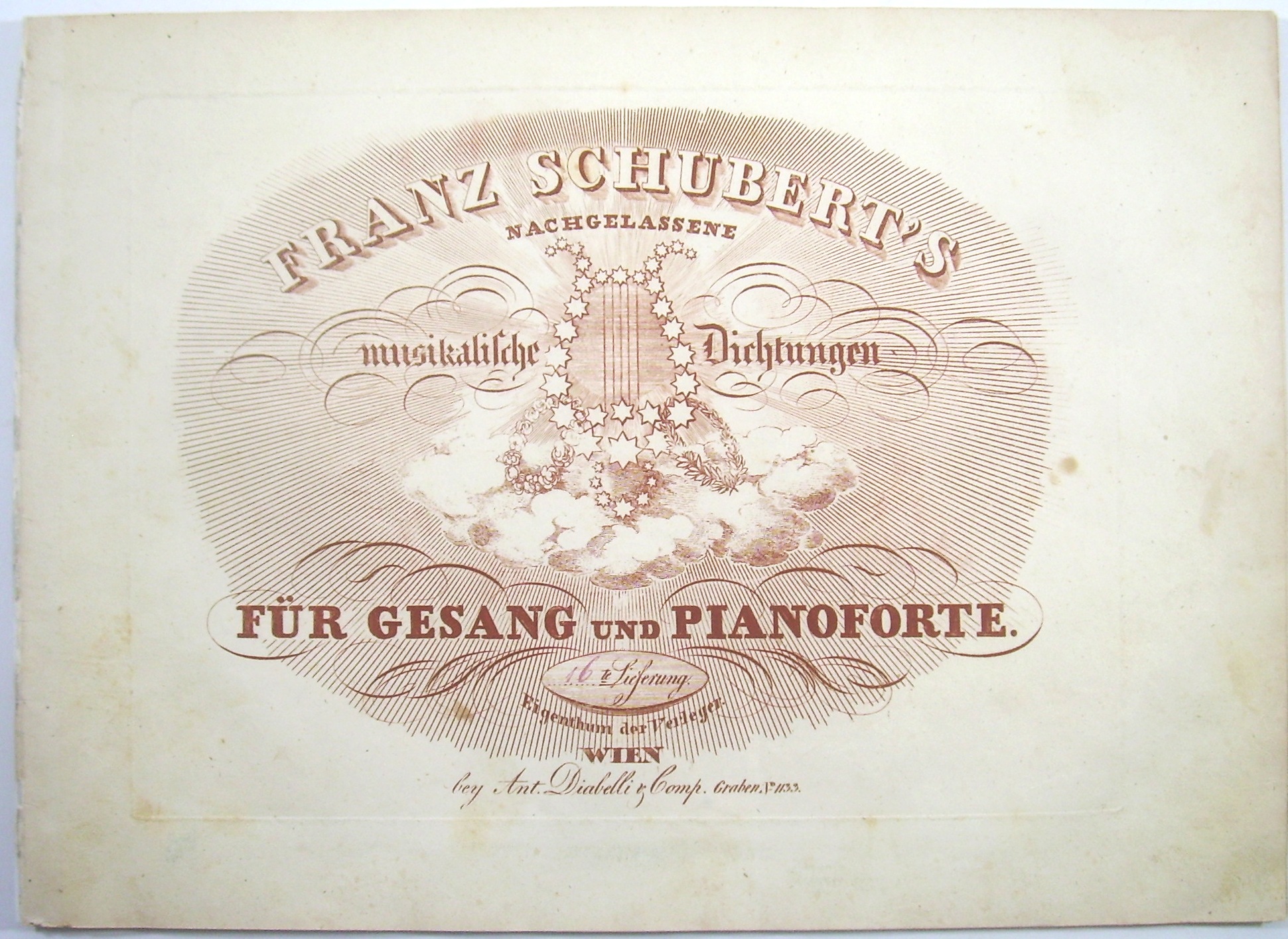 * Raab SDV II/S.640-646. - Erstdrucke Nr. 16 und 20 mit rotbraunem Originalumschlag NL 1, Titelauflagen: 1-7, 13, 30 mit schwarzem Umschlag NL 2, 19 mit rotem Umschlag NL 2, die übrigen Titel ohne Reihenumschlag, aber mit Reihentitel. - In der Reihe "Franz Schuberts nachgelassene musikalische Dichtungen für Gesang und Pianoforte" veröffentlichte Diabelli zwischen 1830 50 Hefte mit und Liedersammlungen im Erstdruck. - Enthält Ossians Gesänge (1-5), Gedichte und Balladen von Schiller: Elysium (6), Die Bürgschaft (8), Der Taucher (12), Ritter Toggenburg (19), sowie Vertonungen von Bauernfeld, Craigher, Goethe, Jacobi, Klopstock, Körner, Lappe, Pope, Schlechta, Schlegel, Schober, Schopenhauer, Schreiber, Schubart, Schulze, Shakespeare.