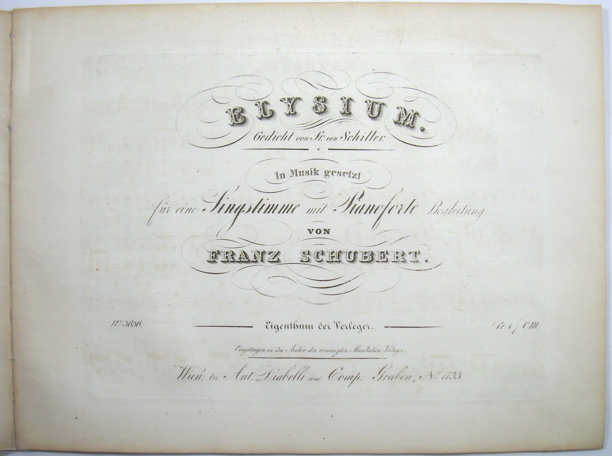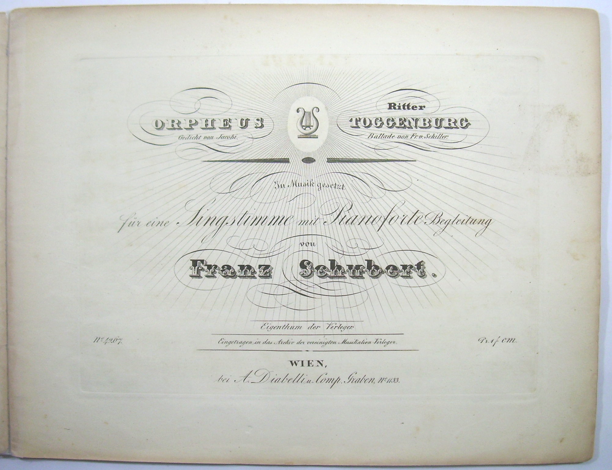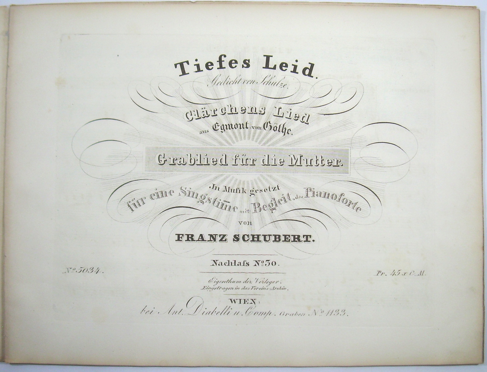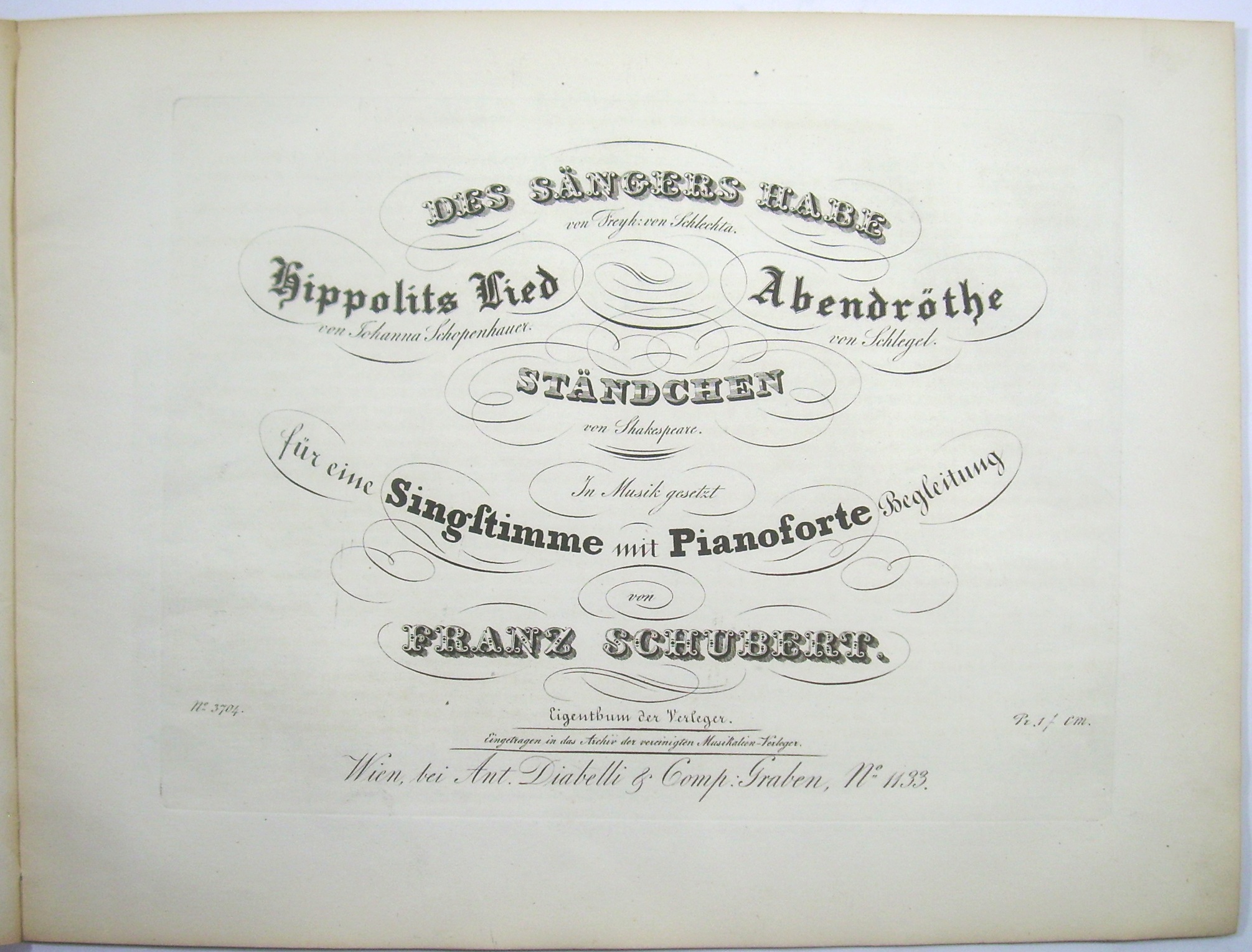 * Raab SDV II/S.640-646. - Erstdrucke Nr. 16 und 20 mit rotbraunem Originalumschlag NL 1, Titelauflagen: 1-7, 13, 30 mit schwarzem Umschlag NL 2, 19 mit rotem Umschlag NL 2, die übrigen Titel ohne Reihenumschlag, aber mit Reihentitel. - In der Reihe "Franz Schuberts nachgelassene musikalische Dichtungen für Gesang und Pianoforte" veröffentlichte Diabelli zwischen 1830 50 Hefte mit und Liedersammlungen im Erstdruck. - Enthält Ossians Gesänge (1-5), Gedichte und Balladen von Schiller: Elysium (6), Die Bürgschaft (8), Der Taucher (12), Ritter Toggenburg (19), sowie Vertonungen von Bauernfeld, Craigher, Goethe, Jacobi, Klopstock, Körner, Lappe, Pope, Schlechta, Schlegel, Schober, Schopenhauer, Schreiber, Schubart, Schulze, Shakespeare.