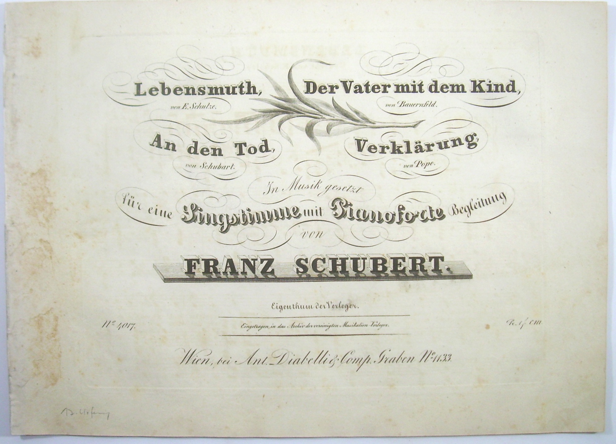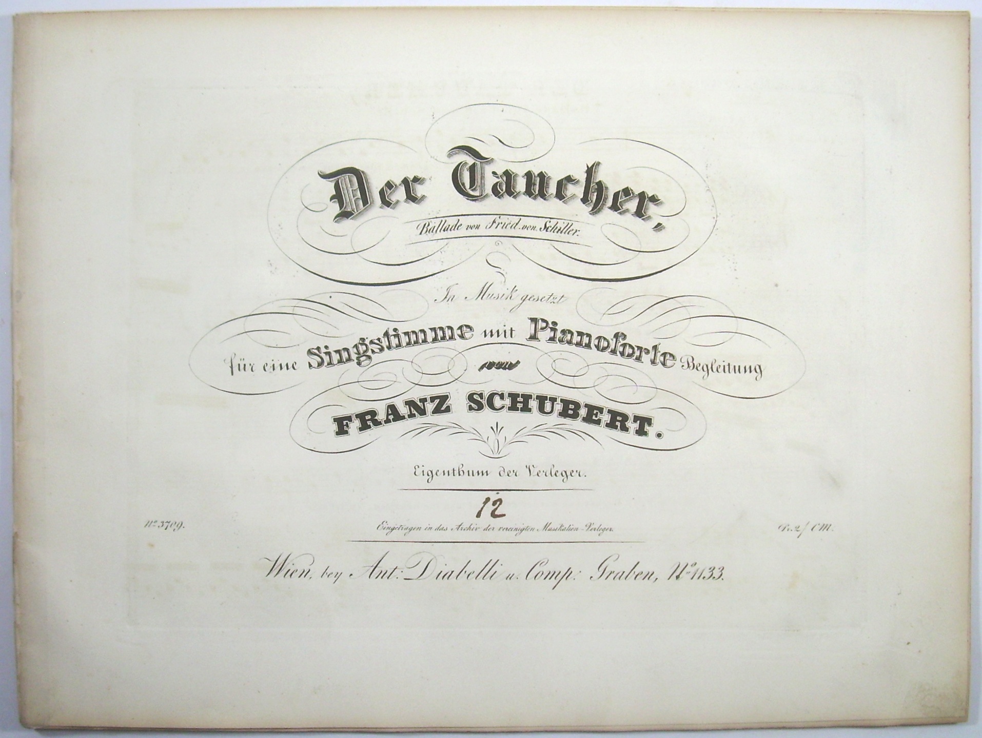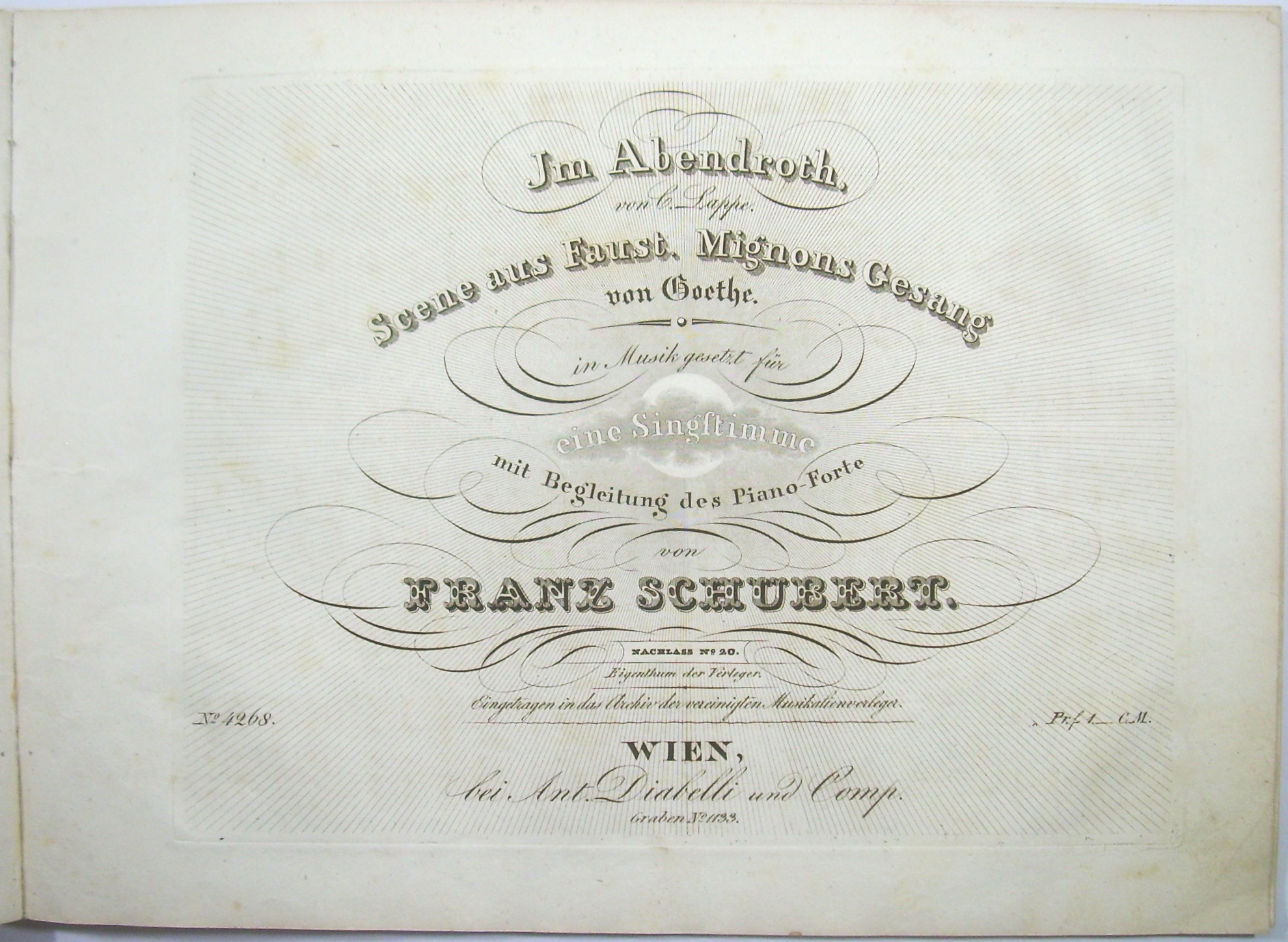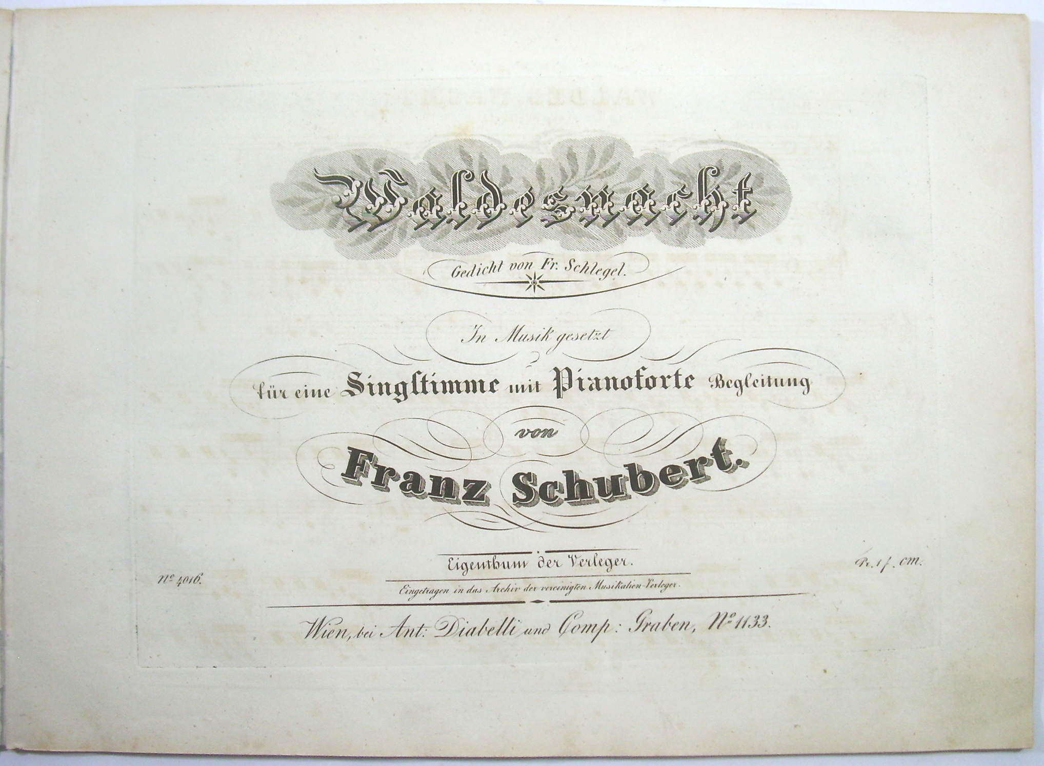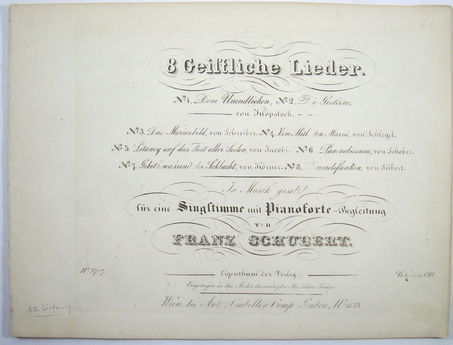 * Raab SDV II/S.640-646. - Erstdrucke Nr. 16 und 20 mit rotbraunem Originalumschlag NL 1, Titelauflagen: 1-7, 13, 30 mit schwarzem Umschlag NL 2, 19 mit rotem Umschlag NL 2, die übrigen Titel ohne Reihenumschlag, aber mit Reihentitel. - In der Reihe "Franz Schuberts nachgelassene musikalische Dichtungen für Gesang und Pianoforte" veröffentlichte Diabelli zwischen 1830 50 Hefte mit und Liedersammlungen im Erstdruck. - Enthält Ossians Gesänge (1-5), Gedichte und Balladen von Schiller: Elysium (6), Die Bürgschaft (8), Der Taucher (12), Ritter Toggenburg (19), sowie Vertonungen von Bauernfeld, Craigher, Goethe, Jacobi, Klopstock, Körner, Lappe, Pope, Schlechta, Schlegel, Schober, Schopenhauer, Schreiber, Schubart, Schulze, Shakespeare.