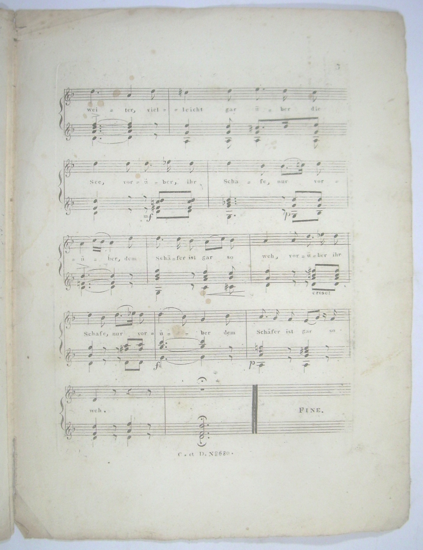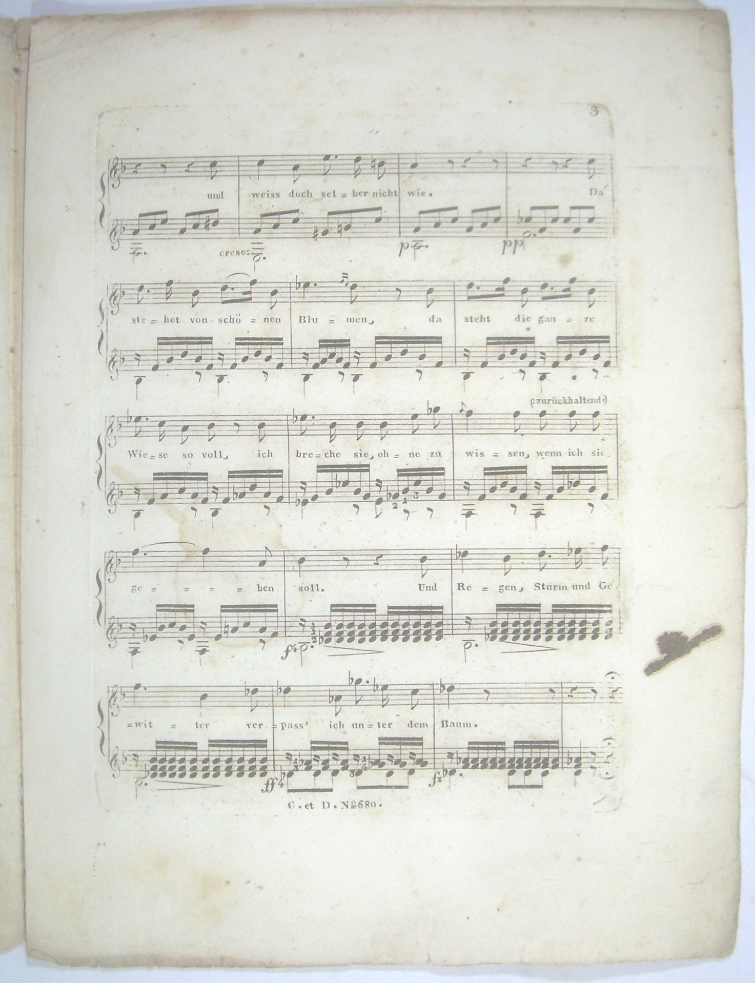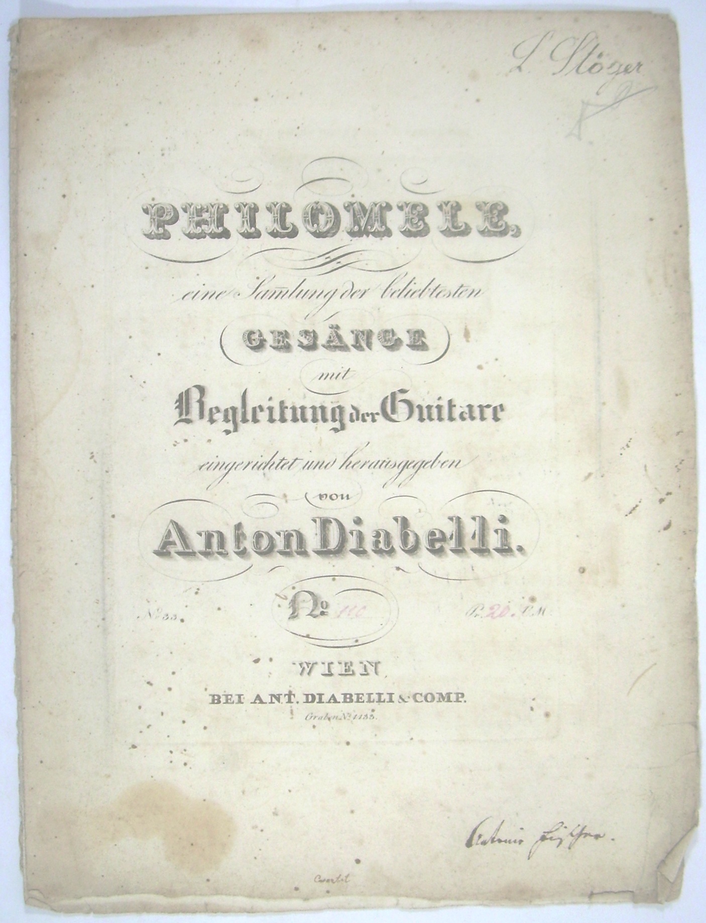 * Raab SDV S. 15, selten. - Interessantes Beispiel für die frühe Popularität von Franz Schubert in Wien. 1821 erschien der Erstduck der 4 Lieder op. 3 bei Cappi und Diabelli (PN 768), Von der Originalausgabe erschienen bis Mitte 1822 3 Abzüge, und 2 weitere Abzüge 1824 und 1828 (Raab, A1-A5). Ein halbes Jahr nach der Originalausgabe aber mit früherer PN erschien die Ausgabe mit Gitarre, angezeigt im November 1821, als Teil einer Serie von 4 Liedern (Erlönig, Der Wanderer, Morgenlied, Schäfers Klage, Philomele 106, 108-110). Hier in einer Titelauflage von ca. 1824 mit neuem Verlagsnamen, aber Abzug von den (etwas abgenutzten) Platten des Erstdrucks (siehe PN).