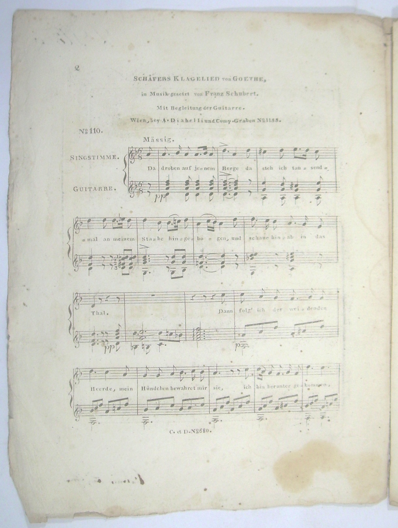 [D121, op. 3/1] Schäfers Klagelied von Goethe, in Musik gesetzt von Franz Schubert. Mit Begleitung der Guitarre. = Philomele eine Sammlung der beliebtesten Gesänge mit Begleitung der Guitare No. 110.